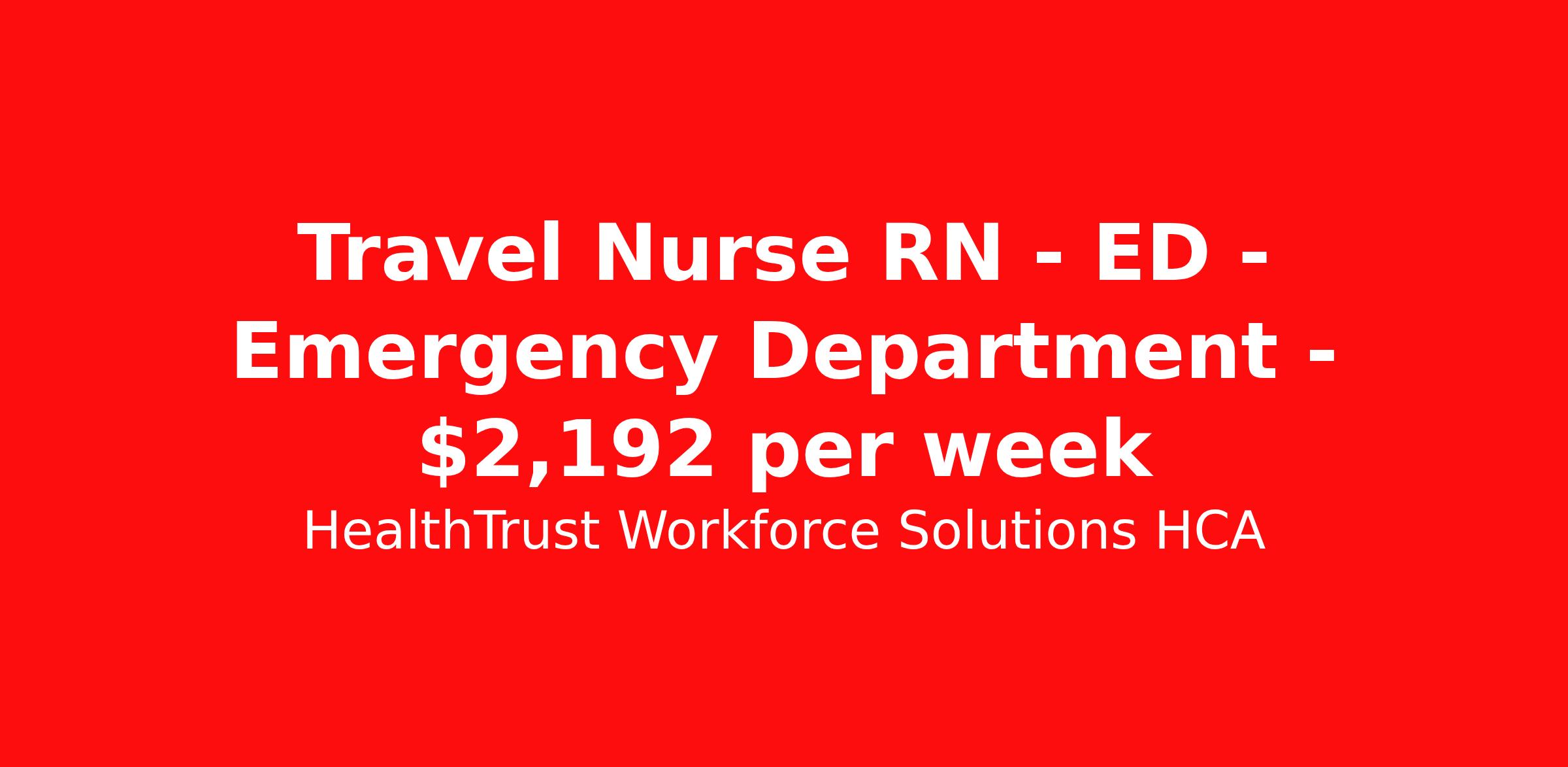 HealthTrust Workforce Solutions HCA is seeking a travel nurse RN ED - Emergency Department for a travel nursing job in Asheville, North Carolina. Job Description & Requirements Specialty: ED - Emergency Department Discipline: RN Duration: 13 weeks 36 hours per week Shift: 12 hours, nights Employment Type: Travel Unit Specifics: · Number of Beds : 101 · Patient Ratios : 4:1 typically- medical, up to 7:1 on ED behavioral holds · Unit staffing description- Techs available- work in cardiac monitoring unit and the internal processing area, triage, Unit clerks days and nights · Type of equipment : baxter pumps, GE monitors · Documentation system: Cerner · Scheduling requirements: Every other weekend, can’t commit to block scheduling, scheduling must meet the needs of the dept. · Floating policy: No floating outside of the ED but must be open to floating to all sections in the ED. · Patient Experience requirements: AIDET, Respectful behavior, Pt Experience to each patient, Boards updated with info and pt updated throughout visit Hospital Specifics- · Certifications: ACLS before starting date on hire BLS before starting date on hire PALS before starting date on hire TNCC before starting date on hire CPI before starting date on hire NIHSS before starting date on hire ENPC within 90 days of hire Requested Skill Set: 2 years’ experience in Level 2 trauma center, comprehensive stroke center, high volume > 100,000 visit ED. Previous HCA experience preferred. About HealthTrust Workforce Solutions HCA At HealthTrust Workforce Solutions, healthcare is not just about the four walls of a facility but about the people who provide and receive care. Our focus is on empowering healthcare professionals to deliver exceptional patient experiences by providing them with the necessary skills, tools, and support. We partner with healthcare facilities nationwide to ensure that the right professionals are in the right roles. We prioritize our clinicians by giving them a voice and access to opportunities to fulfill their mission of improving lives by providing quality patient care. We are committed to our core values of Trust, Innovation, Adaptability, Courage, and Accountability. We are dedicated to positively impacting the healthcare industry by providing first-priority access to more than 200,000 jobs nationwide to our healthcare professionals. Join us and be part of the HealthTrust family, where you can make a difference every day. We embrace our changing environment, and we maintain a culture that has a rich tradition of transforming itself to meet the challenges of the future. MISSION STATEMENT While putting great people in the right roles is essential, our mission is far greater. We want our clinicians to be part of the HealthTrust family, where healthcare professionals have a voice and are empowered with the right tools and opportunities to fulfill their personal mission of improving lives. Plus, as a preferred partner to thousands of top-performing hospitals, we provide our healthcare professionals with first-priority access to more than 200,000 jobs nationwide. Benefits Dental benefits Vision benefits Referral bonus Continuing Education Life insurance