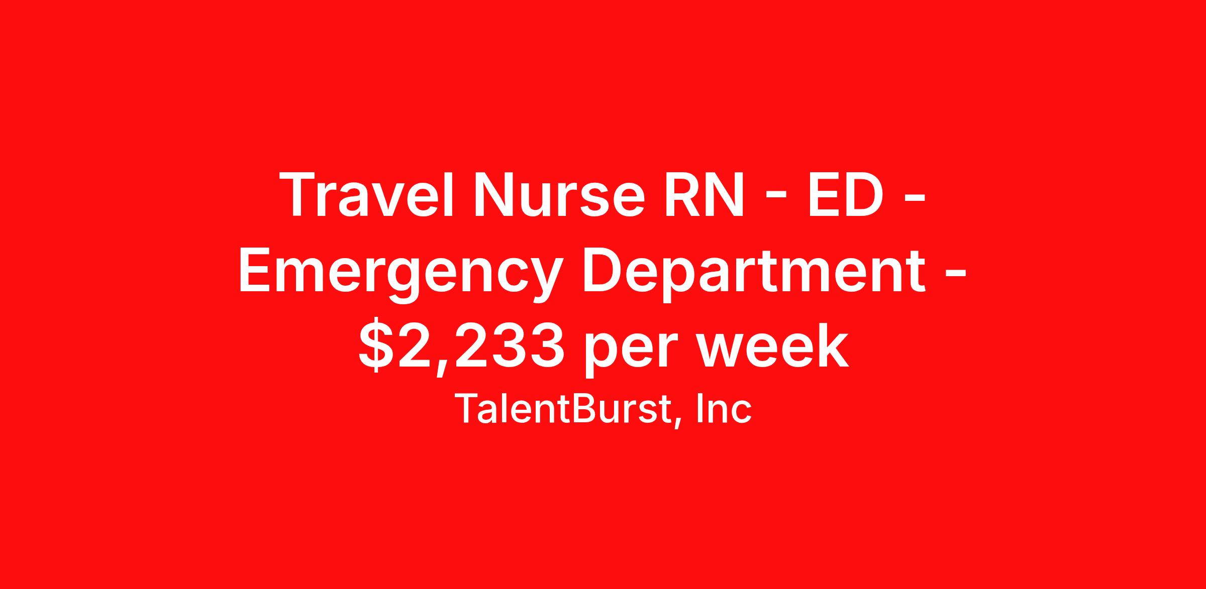 TalentBurst, Inc is seeking a travel nurse RN ED - Emergency Department for a travel nursing job in Santa Fe, New Mexico. Job Description & Requirements Specialty: ED - Emergency Department Discipline: RN Start Date: 04/06/2026 Duration: 12 weeks 36 hours per week Shift: 12 hours, nights Employment Type: Travel RN Emergency Room-NIGHTS Santa Fe, NM 13 weeks SHIFT: NIGHTS 7PM - 7AM START: ASAP REQUIRED CERTIFICATION/LICENSES: Current New Mexico RN license or current Compact state license. BLS Certification from AHA required. ACLS Certification from AHA required. PALS Certification from AHA required. (OR ENPC) TNCC OR ATCN required CPI or Equivalent Preferred POSITION TITLE: Clinical Nurse I, II, III, IV DEPARTMENT: Patient Care Services POSITION SUMMARY: The Registered Nurse is a clinical practitioner who coordinates and implements patient care specific to the age of the patient population served on the assigned units. He/she ensures that quality care is provided in an efficient and safe manner, consistent with the unit's standards of care. He/she demonstrates performance consistent with the mission, philosophy and goals of the unit and organization. Demonstrates quality and effectiveness in work habits and clinical practice. Treats staff, physicians, patients and families with consideration and respect. MINIMUM QUALIFICATIONS: EDUCATION: Graduate of an accredited program for Registered Nursing. CERTIFICATION/LICENSES: Current New Mexico RN license or current Compact state license. BLS Certification required. (See Required Department Certification List detailed on the last page of this document.) SKILLS: Current knowledge and skills appropriate to age/type of patient population served Knowledgeable and sensitive to patients' rights in the delivery of care Communicates in a clear concise manner appropriate to the developmental age of patient. EXPERIENCE: NATURE OF SUPERVISION: -Responsible to: Patient Care Director or Manager ENVIRONMENT: Bloodborne pathogen C (OR, PACU, L & D); Bloodborne pathogen B (other Patient Care areas). Exposure to infectious diseases and x-rays. Works in a clean, well lighted, ventilated smoke-free environment. Subject to stressful professional relationships. Working hours are varied, with flexibility due to unexpected changes in schedule and emergencies. PHYSICAL REQUIREMENTS: Must be able to handle emergency/crisis situations, prolonged, extensive or considerable standing and walking. Requires heavy physical effort to position, push and/or transfer patients or equipment and supplies. Requires considerable reaching, stooping, bending, kneeling and crouching. Ability to judge distance and space relationships, see peripherally, distinguish and identify different colors. Hearing and visual acuity within normal or correctable limits. Manual dexterity and fine motor coordination required. TB_RN TBHC Talent Burst Job ID 26-06253. Pay package is based on 12 hour shifts and 36 hours per week (subject to confirmation) with tax-free stipend amount to be determined. Posted job title: RN Emergency Room-NIGHTS About TalentBurst, Inc TalentBurst Health & Life Sciences is an established provider of healthcare workforce solutions, servicing healthcare facilities across the United States for over 15 years. As a Joint Commission Certified Agency, our commitment to quality, integrity, and exceptional service has made us a trusted name in the healthcare staffing landscape. Our mission is to bridge the gap between healthcare professionals seeking fulfilling opportunities and healthcare organizations striving to maintain their high standards of care. We are committed to providing top-notch healthcare professionals with access to facilities where they can focus on delivering exceptional patient care and thrive. Whether you're a nurse, allied health professional, or administrative personnel, we have the expertise to match your skills and aspirations with the perfect placement.