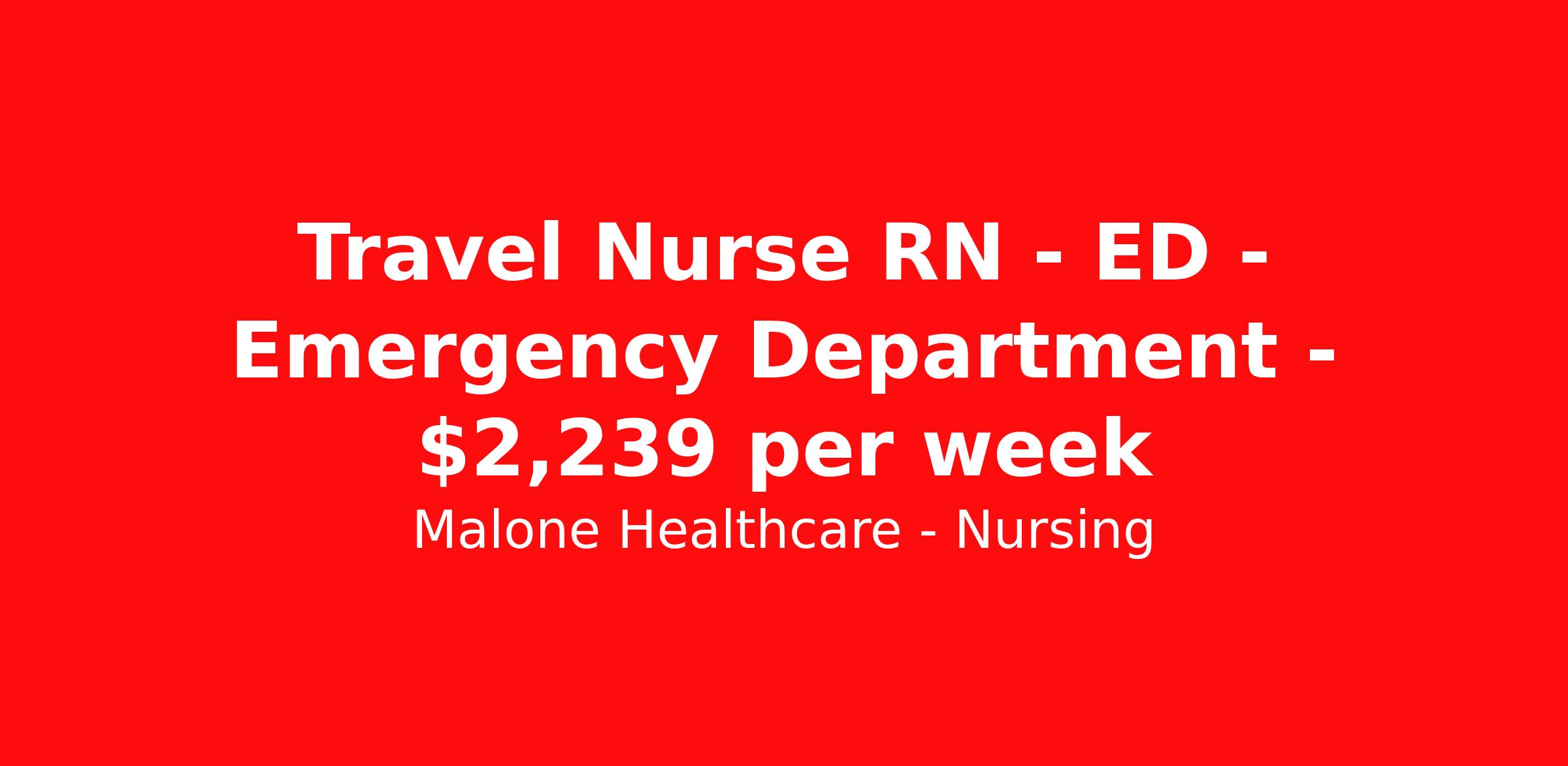 Malone Healthcare - Nursing is seeking a travel nurse RN ED - Emergency Department for a travel nursing job in Morristown, Vermont. Job Description & Requirements Specialty: ED - Emergency Department Discipline: RN Start Date: 04/01/2026 Duration: 13 weeks 36 hours per week Shift: 12 hours, nights, flexible Employment Type: Travel About Malone Healthcare - Nursing With a commitment to providing a higher standard of service and experience in patient care, Malone Healthcare places expert nurses and allied health professionals in rewarding careers throughout the United States. As a leading healthcare staffing agency, Malone’s focus on compliance and integrity translates to a seamless experience for our team members and partner facilities. When you work with Malone Healthcare, you can rely on over 50 years of proven experience placing exceptional professionals in quality healthcare settings. Benefits Weekly pay Holiday Pay Guaranteed Hours Continuing Education 401k retirement plan Pet insurance Referral bonus Medical benefits Dental benefits Vision benefits License and certification reimbursement Life insurance
