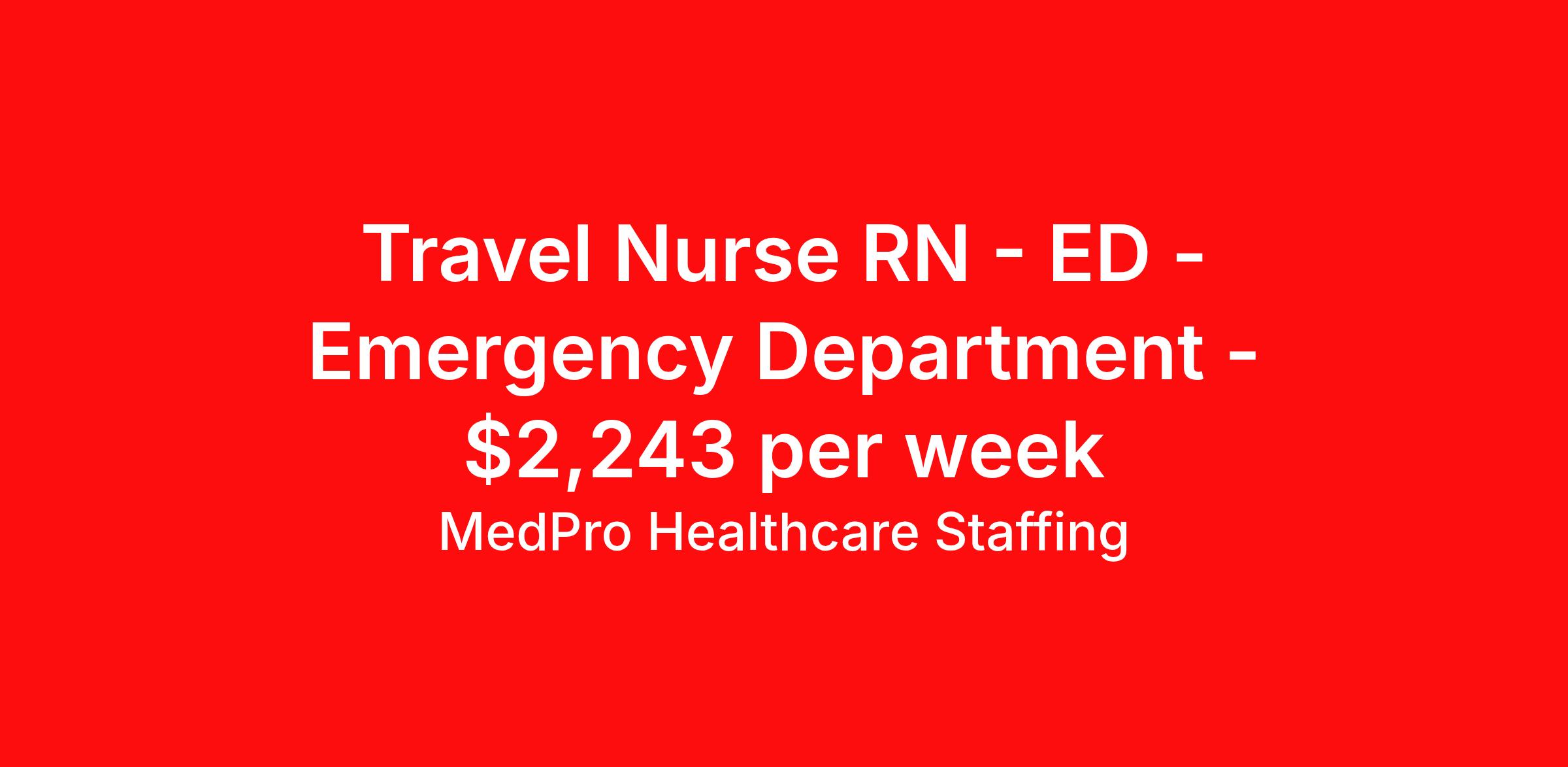 MedPro Healthcare Staffing is seeking a travel nurse RN ED - Emergency Department for a travel nursing job in Bakersfield, California. Job Description & Requirements Specialty: ED - Emergency Department Discipline: RN Start Date: 04/13/2026 Duration: 13 weeks 36 hours per week Shift: 12 hours Employment Type: Travel MedPro Healthcare Staffing , a Joint Commission-certified staffing agency, is seeking a quality Registered Nurse - Emergency Room for a travel assignment with one of our top healthcare clients. Requirements Active RN License Degree from accredited nursing program BLS, ACLS, PALS & TNCC may be required in some positions Eighteen months of recent experience in an Acute Care Emergency Room setting Other requirements to be determined by our client facility Benefits Weekly pay and direct deposit Full coverage of all credentialing fees Private housing or housing allowance Group Health insurance for you and your family Company-paid life and disability insurance Travel reimbursement 401(k) matching Unlimited Referral Bonuses up to $1,000 Duties Responsibilities Emergency Room registered nurses (RN) provide care for patients from various types of illness or trauma requiring emergency attention and must be able to recognize and effectively treat life-threatening conditions Responsible for assessing, intervening and stabilizing a variety of trauma and illnesses with decisive action. Due to the range of medical conditions that may require urgent treatment and care, they must be knowledgeable about general as well as specific health issues. Properly understand triage in order to prioritize injuries based on medical need. Able to make quick and accurate assessments about incoming patients, including both physical and mental health conditions. About Agency MedPro Healthcare Staffing is a Joint Commission certified provider of contract staffing services. Since 1983, we have placed nursing and allied travelers in top healthcare facilities nationwide. Join us today for your very own MedPro Experience®. If qualified and interested, please call for immediate consideration. MedPro Staffing is an Equal Opportunity Employer. All applicants will be considered for employment without attention to race, color, religion, national origin, age, sex, disability, marital status or veteran status. Key Words: Emergency Room Nurse, RN-ER, Emergency Room, Critical Care, Emergency Department, ACLS, EKG, Travel Nurse, Contract Nurse, Agency Nurse, Travel Contract, ER-RN, RN-ED, Emergency Room Nursing, ED Nurse, ER positions, RN-ER positions, ER Contracts, Travel Nurse *Weekly payment estimates are intended for informational purposes only and include a gross estimate of hourly wages and reimbursements for meal, incidental, and housing expenses. Your recruiter will confirm your eligibility and provide additional details. MedPro Job ID a0Fcx00000HjtjKEAR. Pay package is based on 12 hour shifts and 36 hours per week (subject to confirmation) with tax-free stipend amount to be determined. Posted job title: Emergency Room Registered Nurse Nursing: Emergency Room. About MedPro Healthcare Staffing At MedPro Healthcare Staffing , we believe no one cares more for caregivers than we do. Our mission is simple: you focus on your patients, and we’ll take care of the rest. As a Joint Commission-certified leader in temporary and contract healthcare staffing since 1983, MedPro has proudly connected nursing and allied travelers with top healthcare facilities across the nation. With thousands of job opportunities available nationwide, we make it easy to find assignments that align with your goals and lifestyle. Our on-staff clinical support team—alongside a compassionate group of experienced recruiters—provides hands-on guidance every step of the way. From Day 1 medical benefits and a 401(k) plan to personalized career support, we’re committed to ensuring every professional we serve feels valued, cared for, and empowered to succeed. Guided by a CEO who is a Registered Nurse, MedPro is built on a foundation of clinical insight and genuine compassion for the caregiving community. Through The MedPro Experience® , we deliver travel assignments that are rewarding, memorable, and designed to help you DREAM big, EXPLORE often, and ACHIEVE greatness. Benefits Day 1 medical, dental, and vision benefits for you and your family Weekly pay and direct deposit Unlimited Referral Bonuses starting at $500 On Staff Clinical Support Team Access to nationwide travel assignments MPX Mobile app -24/7 real-time access to jobs, credentials, assignment details, and more Full coverage of all credentialing fees Private housing or housing allowance Tax Free Per Diems, Housing Stipends and Travel Reimbursements Company-paid life and disability insurance Travel reimbursement 401(k) matching Benefits Weekly pay Referral bonus Employee assistance programs