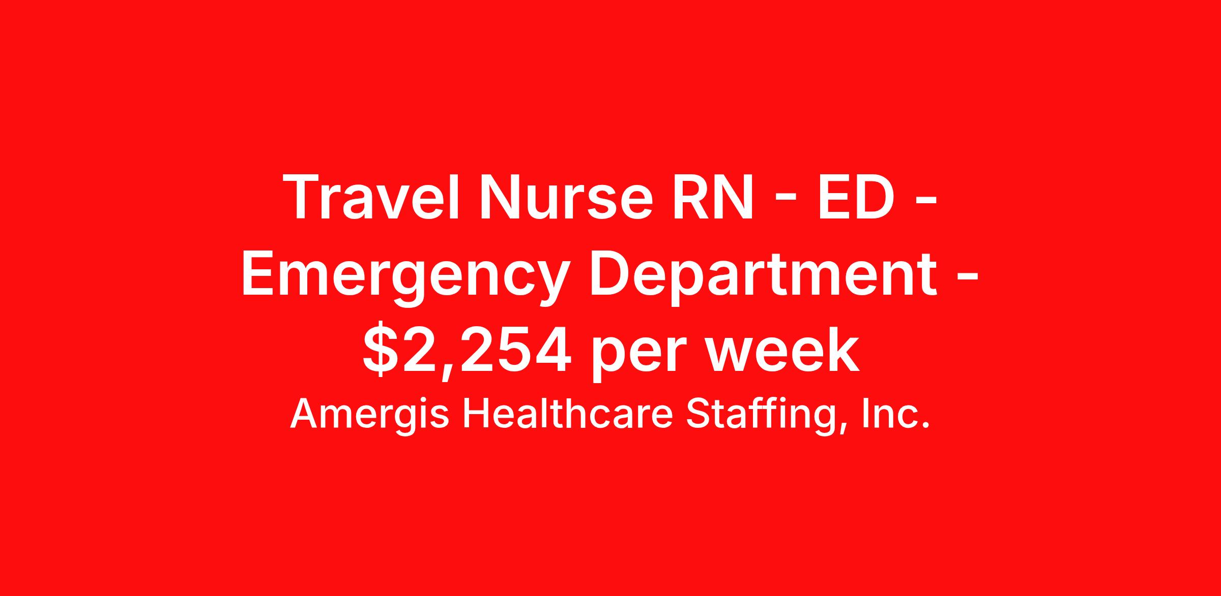 Amergis Healthcare Staffing, Inc. is seeking a travel nurse RN ED - Emergency Department for a travel nursing job in Coos Bay, Oregon. Job Description & Requirements Specialty: ED - Emergency Department Discipline: RN Duration: 13 weeks 36 hours per week Shift: 12 hours Employment Type: Travel The Emergency Department Registered Nurse assumes responsibility and accountability for the application of the nursing process and the delivery of patient care in the emergency room setting or other emergent critical care areas. Minimum Requirements: Current Registered Nurse License within the state of practice Minimum of one year emergency room experience preferred Current CPR if applicable TB Questionnaire, PPD or chest x-ray if applicable Must meet all federal, state and local requirements Must be at least 18 years of age Benefits At Amergis, we firmly believe that our employees are the heartbeat of our organization and we are happy to offer the following benefits: Competitive pay & weekly paychecks Health, dental, vision, and life insurance 401(k) savings plan Awards and recognition programs *Benefit eligibility is dependent on employment status. About Amergis Amergis, formerly known as Maxim Healthcare Staffing, has served our clients and communities by connecting people to the work that matters since 1988. We provide meaningful opportunities to our extensive network of healthcare and school-based professionals, ready to work in any hospital, government facility, or school. Through partnership and innovation, Amergis creates unmatched staffing experiences to deliver the best workforce solutions. Amergis is an equal opportunity/affirmative action employer. All qualified applicants will receive consideration for employment without regard to sex, gender identity, sexual orientation, race, color, religion, national origin, disability, protected Veteran status, age, or any other characteristic protected by law. Amergis Job ID 1108985. Pay package is based on 12 hour shifts and 36 hours per week (subject to confirmation) with tax-free stipend amount to be determined. Posted job title: RN Emergency Room - Coos Bay, OR - $2254/wk About Amergis Healthcare Staffing, Inc. Amergis, formerly known as Maxim Healthcare Staffing, has served our clients and communities by connecting people to the work that matters since 1988. We provide meaningful opportunities to our extensive network of healthcare and school-based professionals, ready to work in any hospital, government facility, or school. Through partnership and innovation, Amergis creates unmatched staffing experiences to deliver the best workforce solutions.