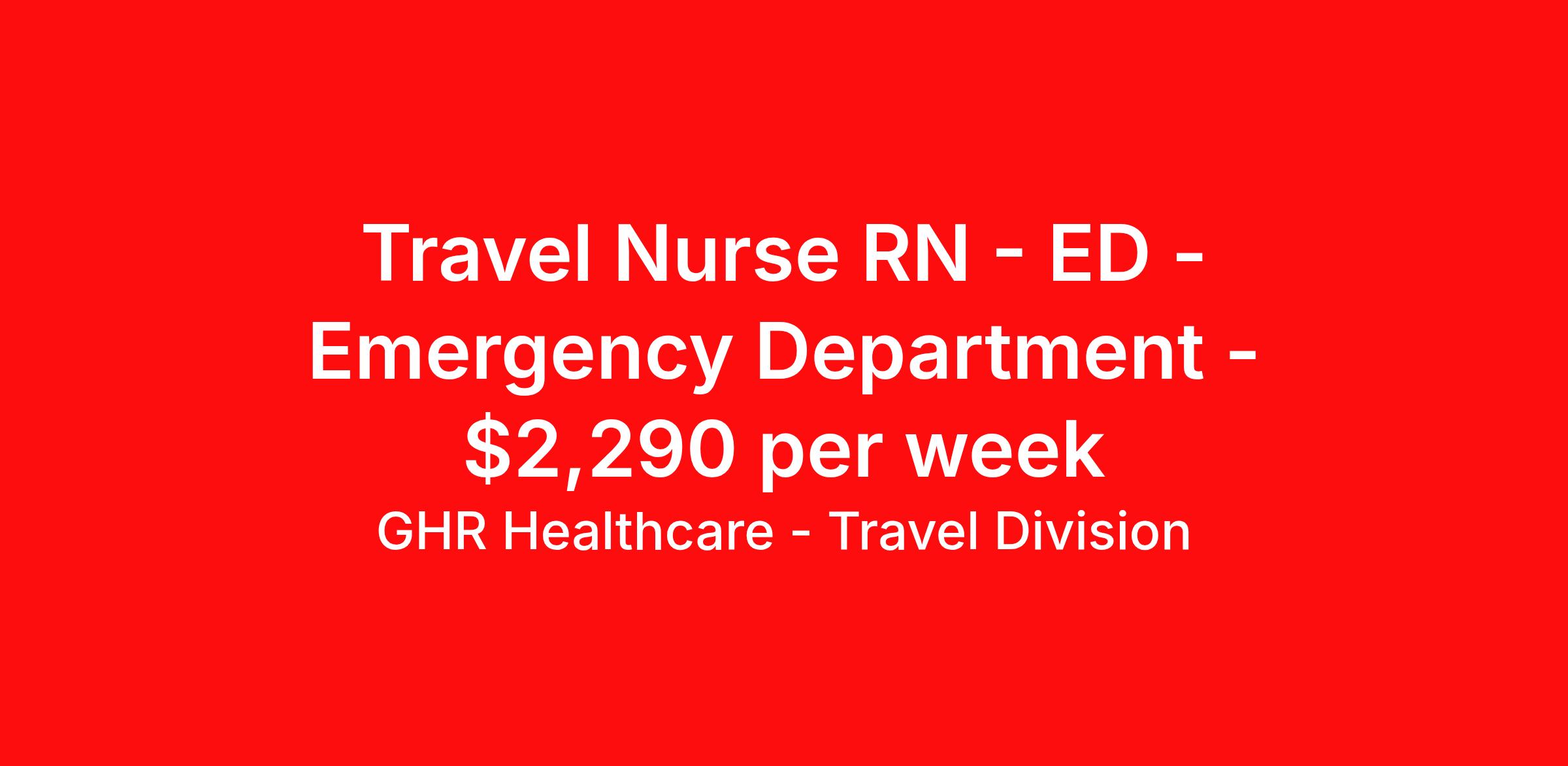 GHR Healthcare - Travel Division is seeking a travel nurse RN ED - Emergency Department for a travel nursing job in Vineland, New Jersey. Job Description & Requirements Specialty: ED - Emergency Department Discipline: RN Start Date: 04/20/2026 Duration: 13 weeks 36 hours per week Shift: 12 hours, nights Employment Type: Travel About GHR Healthcare - Travel Division For over 30 years, GHR Healthcare has been the bridge between healthcare professionals and the facilities that need them nationwide. We're committed to uncovering your ideal fit, supported by GHR's dedication to competitive compensation, transparent communication, and a devoted team that genuinely cares about your career journey. You can trust us to stand by your side as your advocate, confidante, and partner in advancing your career. At GHR, care and consideration are at the heart of everything we do. Visit ghrhealthcare.com to learn more.