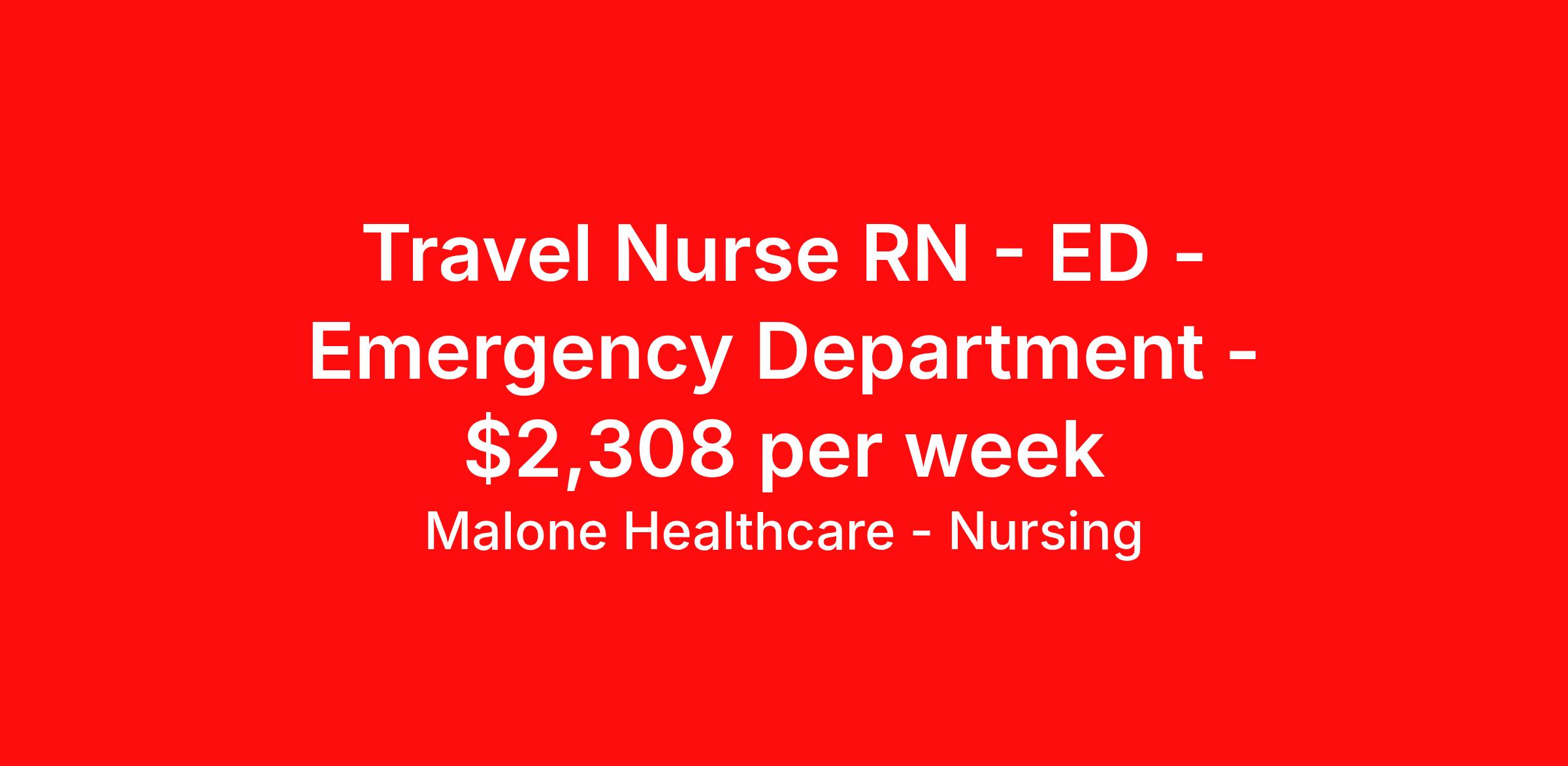 Malone Healthcare - Nursing is seeking a travel nurse RN ED - Emergency Department for a travel nursing job in Tucson, Arizona. Job Description & Requirements Specialty: ED - Emergency Department Discipline: RN Start Date: 03/30/2026 Duration: 13 weeks 36 hours per week Shift: 12 hours, days Employment Type: Travel About Malone Healthcare - Nursing With a commitment to providing a higher standard of service and experience in patient care, Malone Healthcare places expert nurses and allied health professionals in rewarding careers throughout the United States. As a leading healthcare staffing agency, Malone’s focus on compliance and integrity translates to a seamless experience for our team members and partner facilities. When you work with Malone Healthcare, you can rely on over 50 years of proven experience placing exceptional professionals in quality healthcare settings. Benefits Weekly pay Holiday Pay Guaranteed Hours Continuing Education 401k retirement plan Pet insurance Referral bonus Medical benefits Dental benefits Vision benefits License and certification reimbursement Life insurance