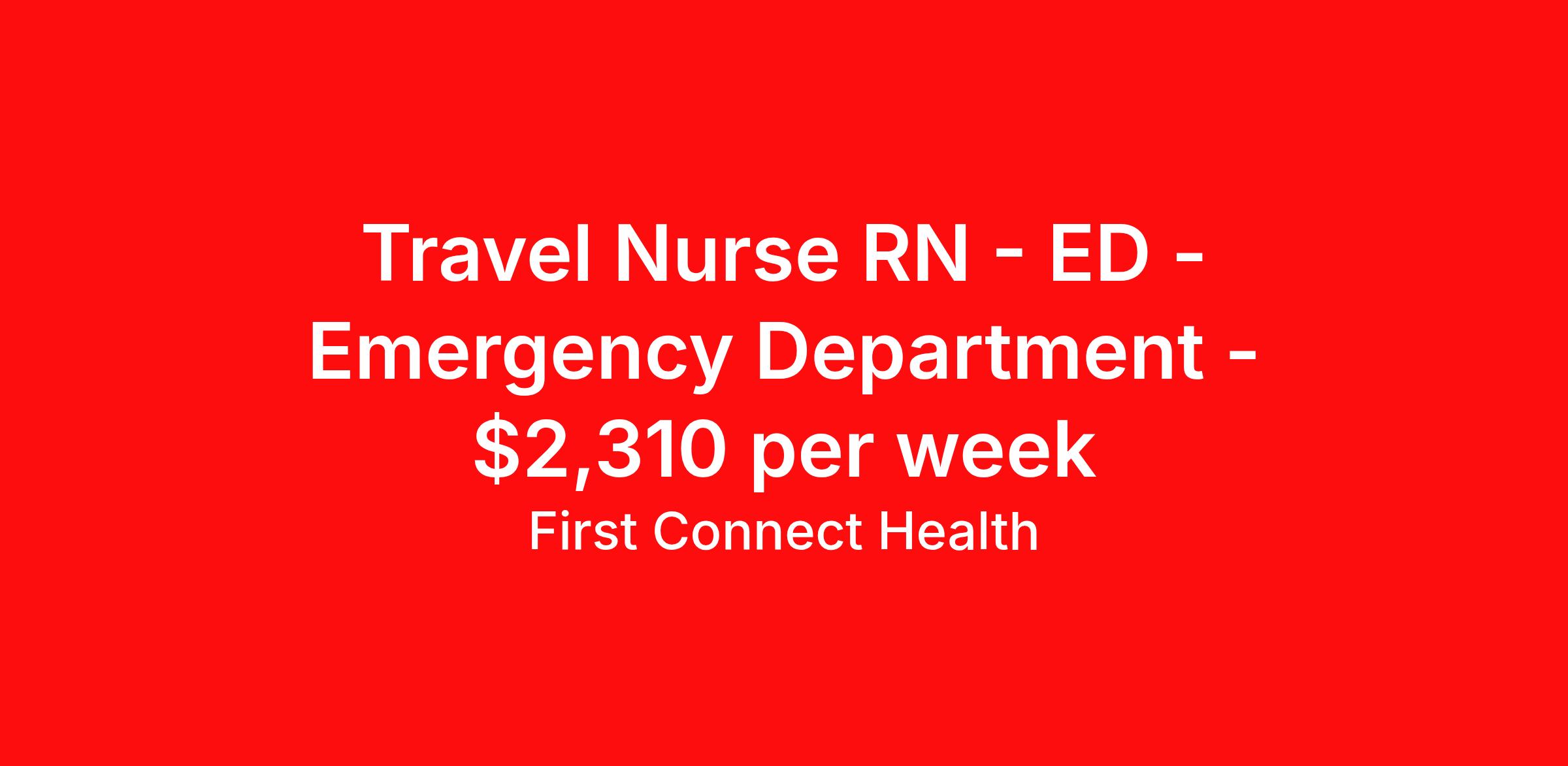 First Connect Health is seeking a travel nurse RN ED - Emergency Department for a travel nursing job in Boston, Massachusetts. Job Description & Requirements Specialty: ED - Emergency Department Discipline: RN Start Date: 04/06/2026 Duration: 13 weeks 36 hours per week Shift: 12 hours, days, nights Employment Type: Travel Job Title- RN ER Facility Name- Brigham & Women's Hospital(BWH) Location- Boston, MA Shift-D/N Pay Package: Gross Weekly- $2310/week Guaranteed Hours- 36 hrs/week Breakdown- W2- $20/hr. Stipend- $1590/week Job Description: EOW, EOH 4 weeks of nights followed by 4 weeks of days (or vice versa) if rotation. About First Connect Health At First Connect Health , we take pride in being a Joint Commission–certified healthcare staffing agency , headquartered in Newark, New Jersey. This prestigious certification is more than just a seal — it's a reflection of our commitment to excellence, safety, and quality in everything we do. By meeting the rigorous standards set by The Joint Commission, one of the most respected accrediting bodies in healthcare, we've demonstrated that our processes, compliance, and patient care standards are aligned with the highest levels of quality in the industry. But our dedication goes beyond certifications. Nurses choose First Connect Health because: ✅ Trust and Transparency: We foster honest communication, timely updates, and full transparency throughout your placement journey. ✅ Best Pay & Benefits: We offer industry-leading compensation packages, along with benefits that support your career goals. ✅ Flexibility & Choice: Whether you're seeking short-term assignments, long-term contracts, or local opportunities, we provide the flexibility to suit your preferences. ✅ Personalized Support: Our recruiters take the time to understand your needs, guiding you with care, respect, and responsiveness at every step. When you work with First Connect Health, you're not just another number — you're a valued professional. Join a team that’s focused on your success, your well-being, and your future in healthcare. Benefits Medical benefits Sick pay 401k retirement plan Weekly pay Referral bonus