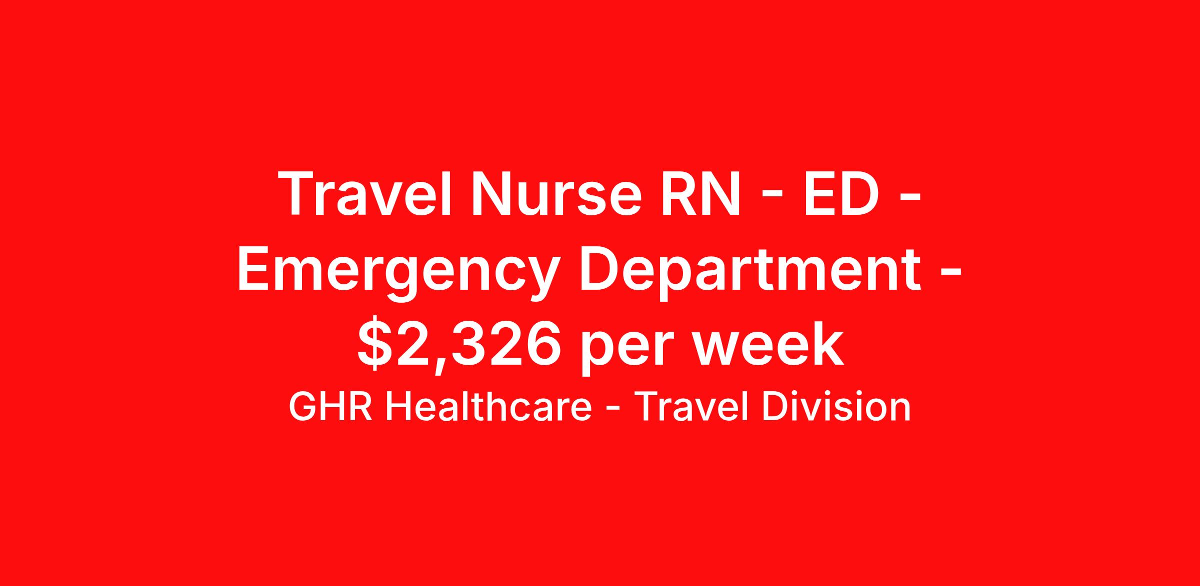 GHR Healthcare - Travel Division is seeking a travel nurse RN ED - Emergency Department for a travel nursing job in Vineland, New Jersey. Job Description & Requirements Specialty: ED - Emergency Department Discipline: RN Start Date: 04/13/2026 Duration: 13 weeks 36 hours per week Shift: 12 hours, days, nights Employment Type: Travel About GHR Healthcare - Travel Division For over 30 years, GHR Healthcare has been the bridge between healthcare professionals and the facilities that need them nationwide. We're committed to uncovering your ideal fit, supported by GHR's dedication to competitive compensation, transparent communication, and a devoted team that genuinely cares about your career journey. You can trust us to stand by your side as your advocate, confidante, and partner in advancing your career. At GHR, care and consideration are at the heart of everything we do. Visit ghrhealthcare.com to learn more.