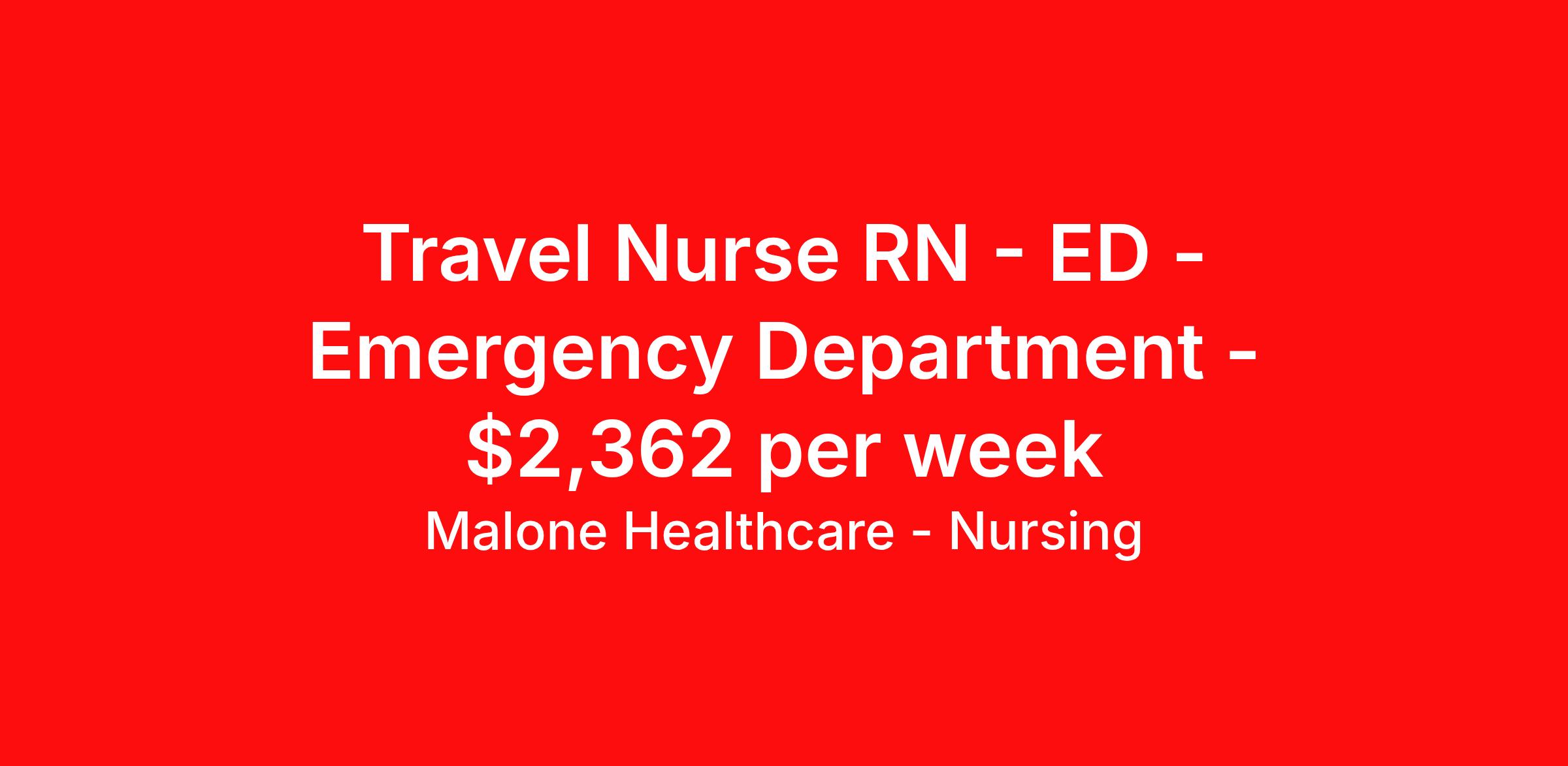 Malone Healthcare - Nursing is seeking a travel nurse RN ED - Emergency Department for a travel nursing job in Sioux City, Iowa. Job Description & Requirements Specialty: ED - Emergency Department Discipline: RN Start Date: 04/13/2026 Duration: 13 weeks 36 hours per week Shift: 12 hours, nights Employment Type: Travel About Malone Healthcare - Nursing With a commitment to providing a higher standard of service and experience in patient care, Malone Healthcare places expert nurses and allied health professionals in rewarding careers throughout the United States. As a leading healthcare staffing agency, Malone’s focus on compliance and integrity translates to a seamless experience for our team members and partner facilities. When you work with Malone Healthcare, you can rely on over 50 years of proven experience placing exceptional professionals in quality healthcare settings. Benefits Weekly pay Holiday Pay Guaranteed Hours Continuing Education 401k retirement plan Pet insurance Referral bonus Medical benefits Dental benefits Vision benefits License and certification reimbursement Life insurance
