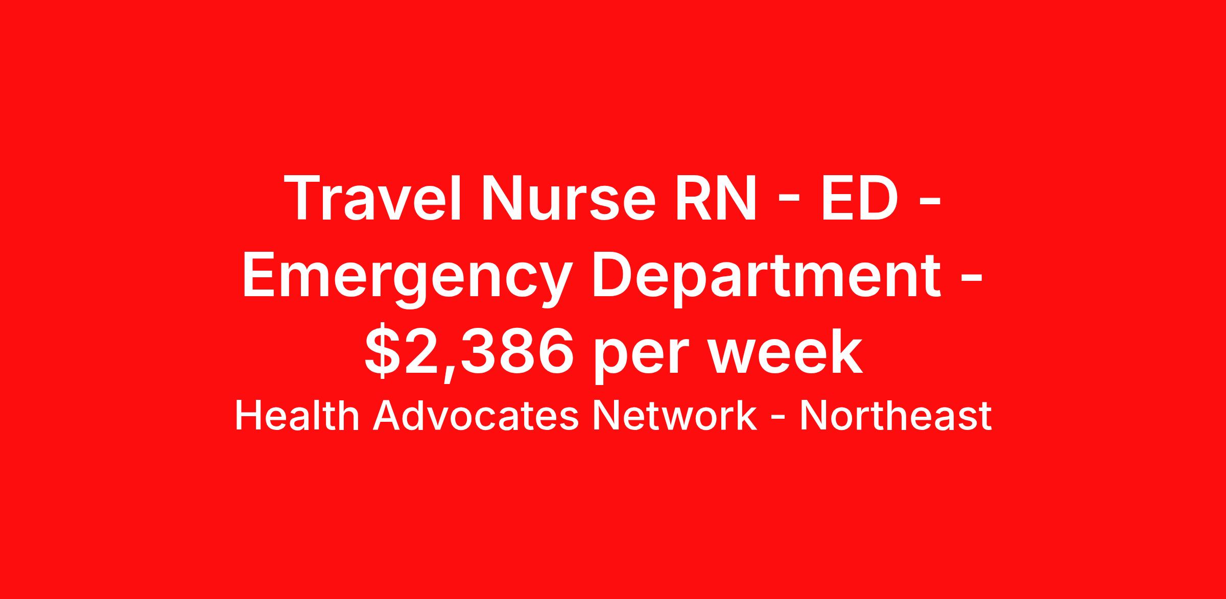 Health Advocates Network - Northeast is seeking a travel nurse RN ED - Emergency Department for a travel nursing job in Utica, New York. Job Description & Requirements Specialty: ED - Emergency Department Discipline: RN Start Date: 05/18/2026 Duration: 12 weeks 36 hours per week Shift: 12 hours, rotating Employment Type: Travel Health Advocates Network is urgently hiring Registered Nurses (RNs) – Emergency Room in the Utica, NY area. Must have 2 years Emergency Room experience. Pay Rate: $2,386 weekly Specialty: Registered Nurse (RN) – Emergency Room Shift: Evening 13 Week Contracts and more available! Radius Rule: 75 mile radius applies Qualification and Requirements: Authorized to work in the United States. Graduate of an Accredited School of Nursing 2 years of experience as a Registered Nurse (RN) – Emergency Room American Heart Association BLS, ACLS, PALS, NIHSS, TNCC EPIC experience required An active, current (NY) state license Apply for this job now or to find out more about other opportunities with Health Advocates Network, Inc. reply to this posting, contact us at or call/text . We can provide you unparalleled access to exciting career opportunities. Benefits We Offer: Competitive pay rates, Referral Bonus, Medical, Dental, Vision and 401k. Travel reimbursement and per diem allowances, Employee discounts, educational opportunities, and more! Who We Are: Health Advocates Network matches highly skilled applicants to positions at the best healthcare companies on a temporary and temporary-to-hire basis. Our mission is to provide you with a rewarding job that is well-matched to your skills – helping you advance in your career. Our experience, combined with our client relationships, makes Health Advocates Network a great resource for your career. Health Advocates Network, Inc. is an equal-opportunity employer. All qualified applicants shall receive consideration for employment without regard to any legally protected basis protected by applicable federal or state law except where a bona fide occupational qualification applies. Refer a Registered Nurse for a $1000.00 bonus opportunity! HANStaff Northeast Job ID 520649. Pay package is based on 12 hour shifts and 36 hours per week (subject to confirmation) with tax-free stipend amount to be determined. Posted job title: RN - ER About Health Advocates Network - Northeast Health Advocates Network was founded on the basis of a shared aspiration, to improve the way healthcare staffing is done. We are a company established and led by nurses. Our flexible approach enables us to develop solutions customized to your specific needs. From short- and long-term travel contracts to local and per diem assignments and more, we are here to get you to your next adventure! By solving challenges, providing the best placements, and advocating for you, we stand to help you thrive and pave the path forward in your career. Benefits 401k retirement plan