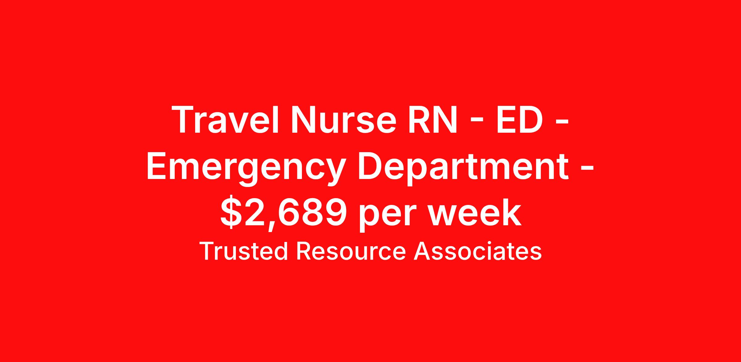 Trusted Resource Associates (TRA) is seeking a travel nurse RN ED - Emergency Department for a travel nursing job in Palm Springs, California. Job Description & Requirements Specialty: ED - Emergency Department Discipline: RN Start Date: 04/01/2026 Duration: 13 weeks 36 hours per week Shift: 12 hours, days Employment Type: Travel TRA RN Emergency Department TRA is Tenet's in-house nationwide contingent pool for Nursing and Allied travel and local contracts. Receive a greater level of Contract security compared to with an outside agency. BENEFITS - Guaranteed hours for Travel Contracts - Preferred Booking Agreement for Local Contracts - Weekly Pay - Holiday Pay - Contract Security compared to a contract with an outside agency Minimum education Graduate of an accredited School of nursing Minimum Experience Must have 2 years of Acute Care nursing experience with a minimum one year current in thie ED. Required Certification/Licensure - Must be currently licensed, certified or registered to practice profession as required by law, regulation in state of practice or policy. Must meet all certification requirements for each nursing specialty supported - American Heart Association - CPR-Basic Life Support - Other credentialing items, such as a skills checklist and health related documents, which will be specified by your Recruiter. Our Hire Process - We do qualify our clinicians to meet or exceed the minimum requirements of a travel or local assignment. If you are qualified, we may direct-hire you, reducing the time we can get you to work! When you reach out to a TRA Recruiter for more details, ensure your Vivian profile includes your most updated resume! Trusted Resource Associates (TRA) Job ID 500241. Pay package is based on 12 hour shifts and 36 hours per week (subject to confirmation) with tax-free stipend amount to be determined. Benefits 401k retirement plan Weekly pay Holiday Pay Referral bonus