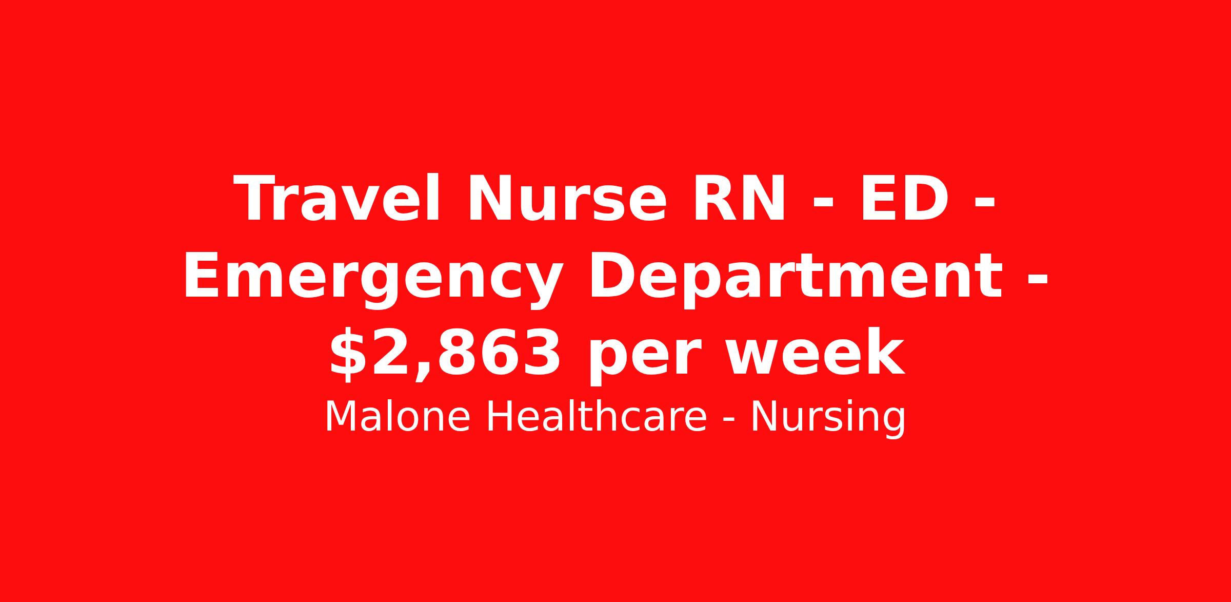 Malone Healthcare - Nursing is seeking a travel nurse RN ED - Emergency Department for a travel nursing job in Lynchburg, Virginia. Job Description & Requirements Specialty: ED - Emergency Department Discipline: RN Start Date: 04/07/2026 Duration: 13 weeks 48 hours per week Shift: 12 hours, nights Employment Type: Travel About Malone Healthcare - Nursing With a commitment to providing a higher standard of service and experience in patient care, Malone Healthcare places expert nurses and allied health professionals in rewarding careers throughout the United States. As a leading healthcare staffing agency, Malone’s focus on compliance and integrity translates to a seamless experience for our team members and partner facilities. When you work with Malone Healthcare, you can rely on over 50 years of proven experience placing exceptional professionals in quality healthcare settings. Benefits Weekly pay Holiday Pay Guaranteed Hours Continuing Education 401k retirement plan Pet insurance Referral bonus Medical benefits Dental benefits Vision benefits License and certification reimbursement Life insurance