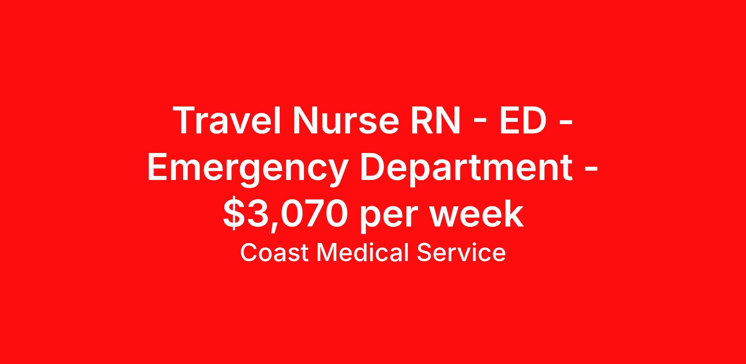 Coast Medical Service is seeking a travel nurse RN ED - Emergency Department for a travel nursing job in Rochester, New York. Job Description & Requirements Specialty: ED - Emergency Department Discipline: RN Start Date: 04/13/2026 Duration: 13 weeks 48 hours per week Shift: 12 hours, rotating Employment Type: Travel Coast Medical Service is a nationwide travel nursing & allied healthcare staffing agency dedicated to providing an elite traveler experience for the experienced or first-time traveler. Coast is featured on Blue Pipes' 2023 Best Travel Agencies and named a 2022 Top Rated Healthcare Staffing Firm & 2023 First Half Top Rated Healthcare Staffing Firm by Great Recruiters. Please note that pay rate may differ for locally based candidates. Please apply here or contact a recruiter directly to learn more about this position & the facility, and/or explore others that may be of interest to you. We look forward to speaking with you! Coast Medical Services Job ID 36202064. Pay package is based on 12 hour shifts and 48.0 hours per week (subject to confirmation) with tax-free stipend amount to be determined. Posted job title: RN:Emergency Room,07:00:00-19:00:00