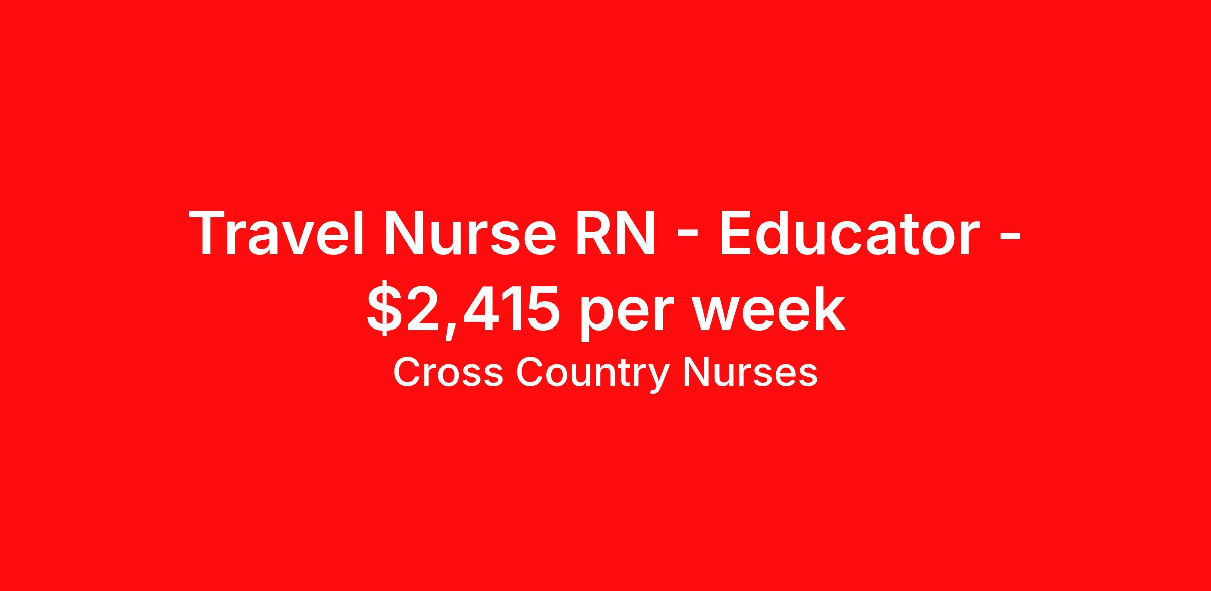 Cross Country Nurses is seeking a travel nurse RN Educator for a travel nursing job in Rochester, New Hampshire. Job Description & Requirements Specialty: Educator Discipline: RN Start Date: 04/06/2026 Duration: 8 weeks 40 hours per week Shift: 8 hours, days Employment Type: Travel Job Description As a registered nurse - nurse educator (RN), you'll teach and train other nurses. Working at a college, university, hospital or other teaching facility or clinical setting, you'll prepare nursing students or existing nurses for the field. Your responsibilities will require you to show leadership, confidence, extensive knowledge, organization and patience. You'll serve as a role model and advisor for your students as you design and implement curriculum and prepare them for real-world applications of nursing. Minimum Requirements At least 1 year of recent acute care experience in specialty Active RN license Benefits The benefits of taking a travel nursing job with Cross Country include: Private housing or generous housing allowance Comprehensive health insurance with prescription coverage Dependent health insurance with prescription coverage Competitive salaries Referral bonuses Travel reimbursement 401(k) retirement plan Direct deposit/free checking Unlimited free CE credits Cross Country Job ID 1235069. Pay package is based on 8 hour shifts and 40 hours per week (subject to confirmation) with tax-free stipend amount to be determined. Posted job title: Registered Nurse / Nurse Educator About Cross Country Nurses You care for others — we’re here to care for you. At Cross Country, we know travel nursing is about more than just the job. It’s about building a career that supports your lifestyle, your values, and your impact. We offer competitive pay, full benefits, and 24/7 support from a team that truly understands what it means to be on the front lines. Wherever your journey takes you, we’re with you every step of the way. Let’s build your best life — one assignment at a time. Benefits 401k retirement plan Referral bonus