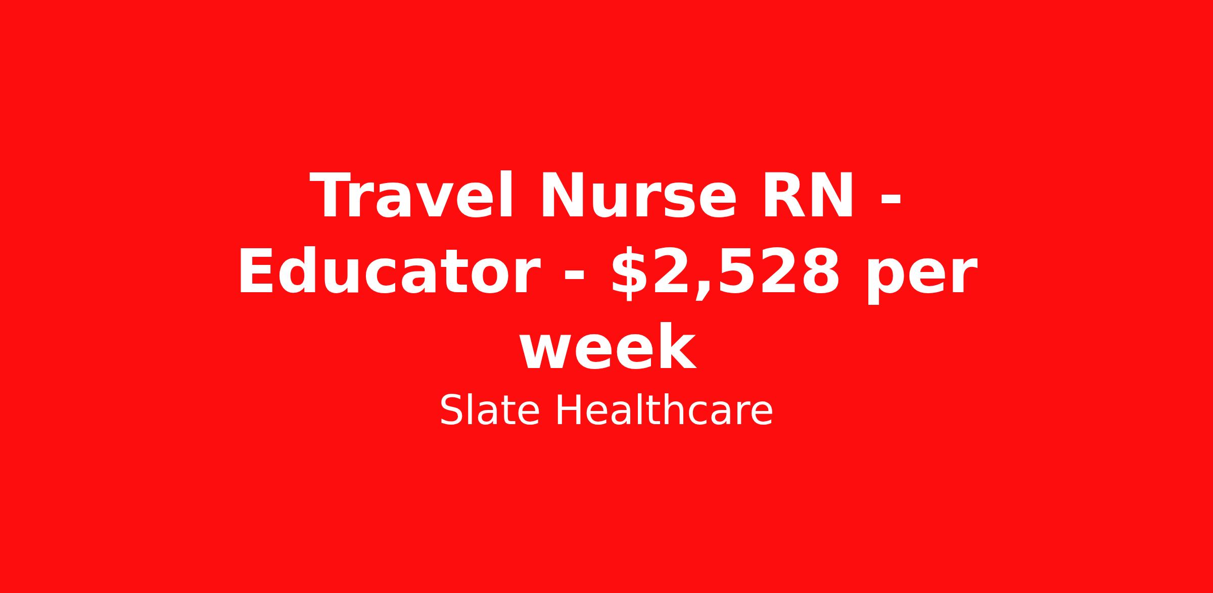 Slate Healthcare is seeking a travel nurse RN Educator for a travel nursing job in Camden, Maine. Job Description & Requirements Specialty: Educator Discipline: RN Start Date: ASAP Duration: 13 weeks 40 hours per week Shift: 8 hours, days Employment Type: Travel Slate Healthcare Job ID 7dd3fd13-d024-4c39-b285-ce23750b3d14. Pay package is based on 8 hour shifts and 40 hours per week (subject to confirmation) with tax-free stipend amount to be determined. About Slate Healthcare Slate Healthcare is a premier travel healthcare staffing agency, connecting healthcare professionals with thousands of opportunities at top-tier hospitals and facilities across the country. We’re committed to supporting nurses and allied health professionals in building stable, fulfilling careers—while embracing the freedom and excitement that comes with travel. Our goal is simple: to offer flexibility, competitive pay, and personalized placements that align with each clinician’s lifestyle and career goals. At Slate, we empower our professionals to choose when and where they work, while ensuring they receive the highest compensation possible—because we believe that exceptional care starts with empowered caregivers.