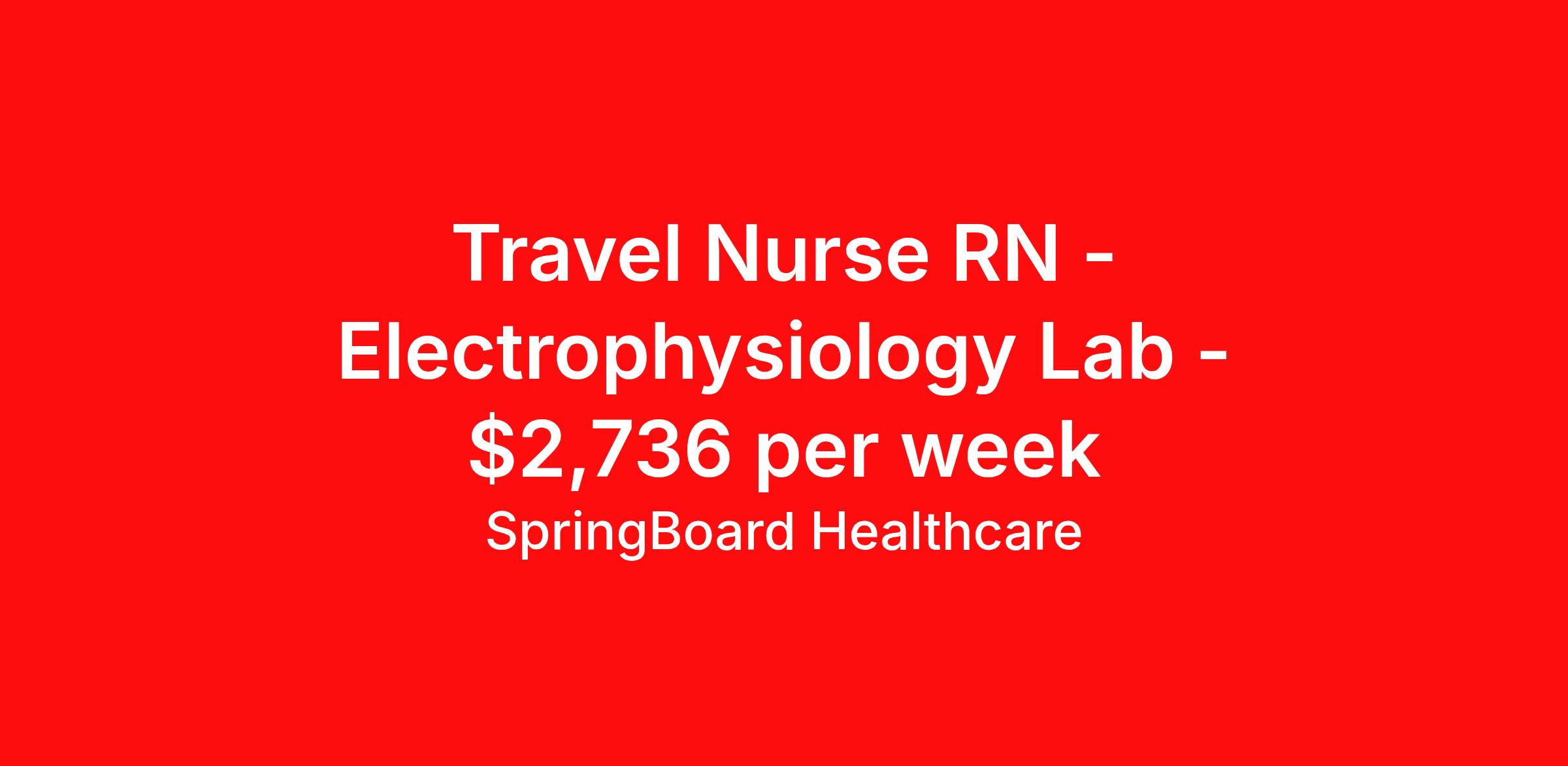 Springboard Healthcare is seeking a travel nurse RN Electrophysiology Lab for a travel nursing job in Fairfield, Ohio. Job Description & Requirements Specialty: Electrophysiology Lab Discipline: RN Start Date: 04/06/2026 Duration: 13 weeks 40 hours per week Shift: 8 hours, flexible Employment Type: Travel Springboard Healthcare Job ID 837305. Pay package is based on 8 hour shifts and 40 hours per week (subject to confirmation) with tax-free stipend amount to be determined. Posted job title: EP RN