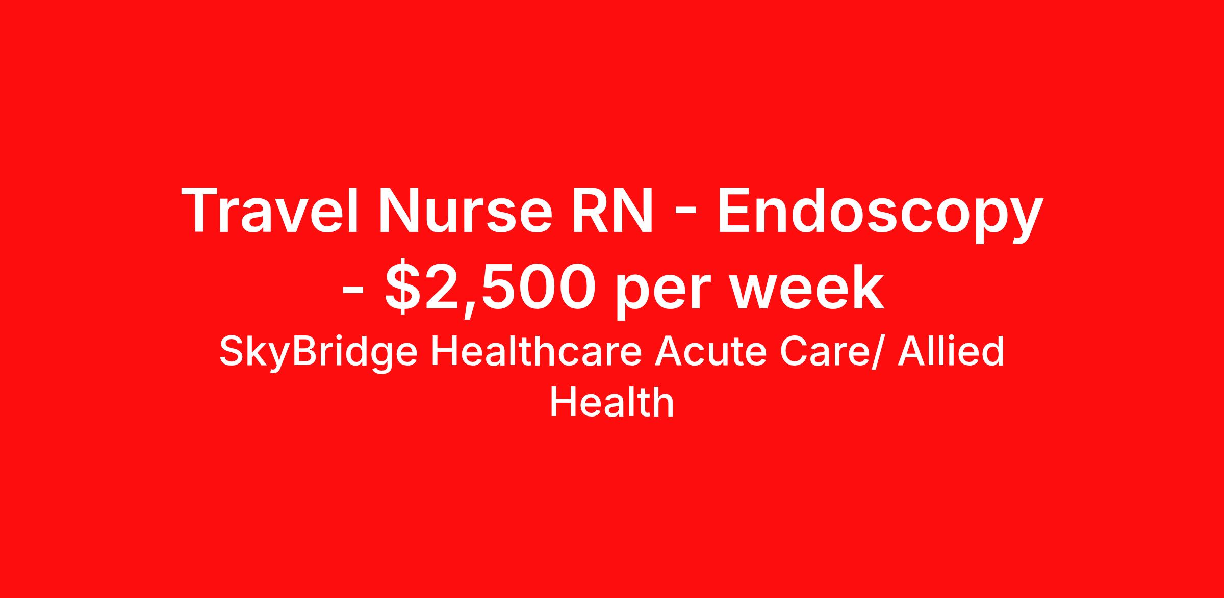 SkyBridge Healthcare Acute Care/ Allied Health is seeking a travel nurse RN Endoscopy for a travel nursing job in Olathe, Kansas. Job Description & Requirements Specialty: Endoscopy Discipline: RN Duration: 13 weeks 40 hours per week Shift: 8 hours, days Employment Type: Travel SkyBridge Healthcare Acute Care/ Allied Health Job ID NV38156719. Pay package is based on 8 hour shifts and 40 hours per week (subject to confirmation) with tax-free stipend amount to be determined. About SkyBridge Healthcare Acute Care/ Allied Health It is our mission at SkyBridge Healthcare to connect professionals within the healthcare community through both genuine relationships and quality work. We understand the demands of healthcare positions which is why we want to give back to Healthcare Professionals who give so much to their communities. We’re partnered with some of the greatest facilities in the nation, therefore we ensure our Healthcare Professionals will receive top-notch treatment every step of the way. Our specialties include Nursing, Allied Health, Laboratory, Therapy, Healthcare Information Technology, and Revenue Cycle. Follow us on social media to stay in the know of our latest company updates and job postings. Benefits Weekly pay Holiday Pay Guaranteed Hours Vision benefits 401k retirement plan License and certification reimbursement Mileage reimbursement Referral bonus Employee assistance programs Medical benefits Life insurance Dental benefits