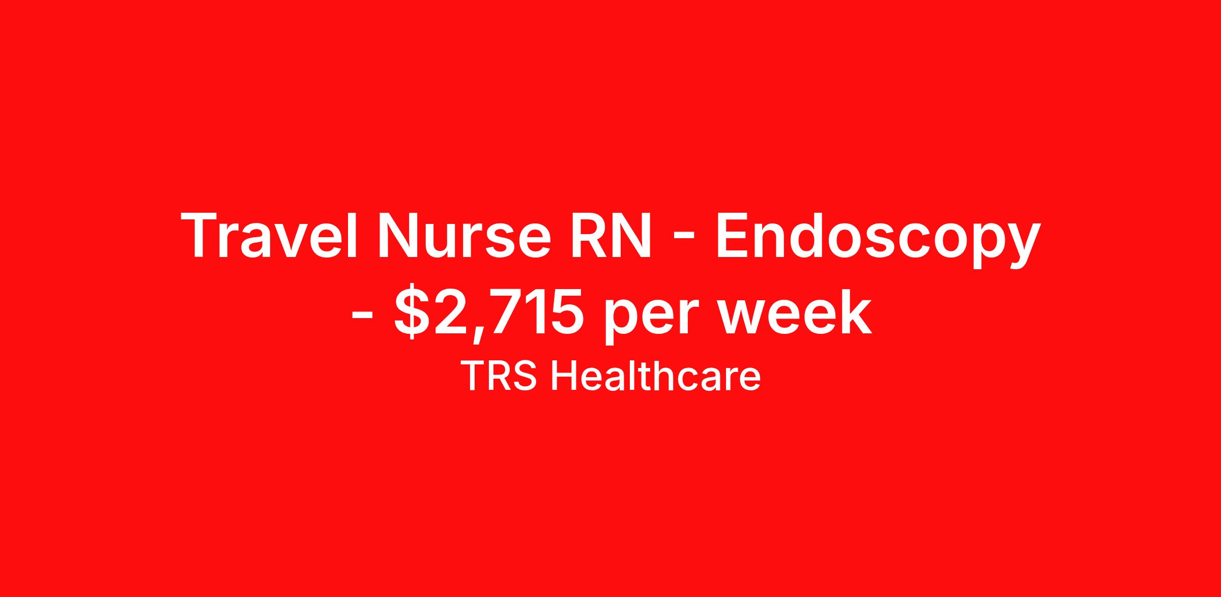 TRS Healthcare is seeking a travel nurse RN Endoscopy for a travel nursing job in Plymouth, Massachusetts. Job Description & Requirements Specialty: Endoscopy Discipline: RN Start Date: 04/20/2026 Duration: 13 weeks 40 hours per week Shift: 8 hours, days Employment Type: Travel TRS Healthcare Job ID 1448930. Pay package is based on 8 hour shifts and 40 hours per week (subject to confirmation) with tax-free stipend amount to be determined. Posted job title: Endoscopy/GI Lab Registered Nurse About TRS Healthcare TRS Healthcare has been a leader in the healthcare staffing industry for over 25 years, providing exceptional career opportunities for travel nurses and allied health professionals. An RN-founded, woman-owned company, TRS Healthcare has team members in all 50 states. We recruit and support registered nurses, licensed practical nurses, surgical technicians, respiratory therapists, imaging technologists, laboratory specialists, and other experienced nursing and allied healthcare professionals. We staff hundreds of healthcare facilities across the U.S. in urban, rural, and underserved areas, including multi-state hospital systems, critical access hospitals, rural community hospitals, long-term care facilities, trauma centers, standalone clinics, and more. Learn more about TRS Healthcare at trshealthcare.com .