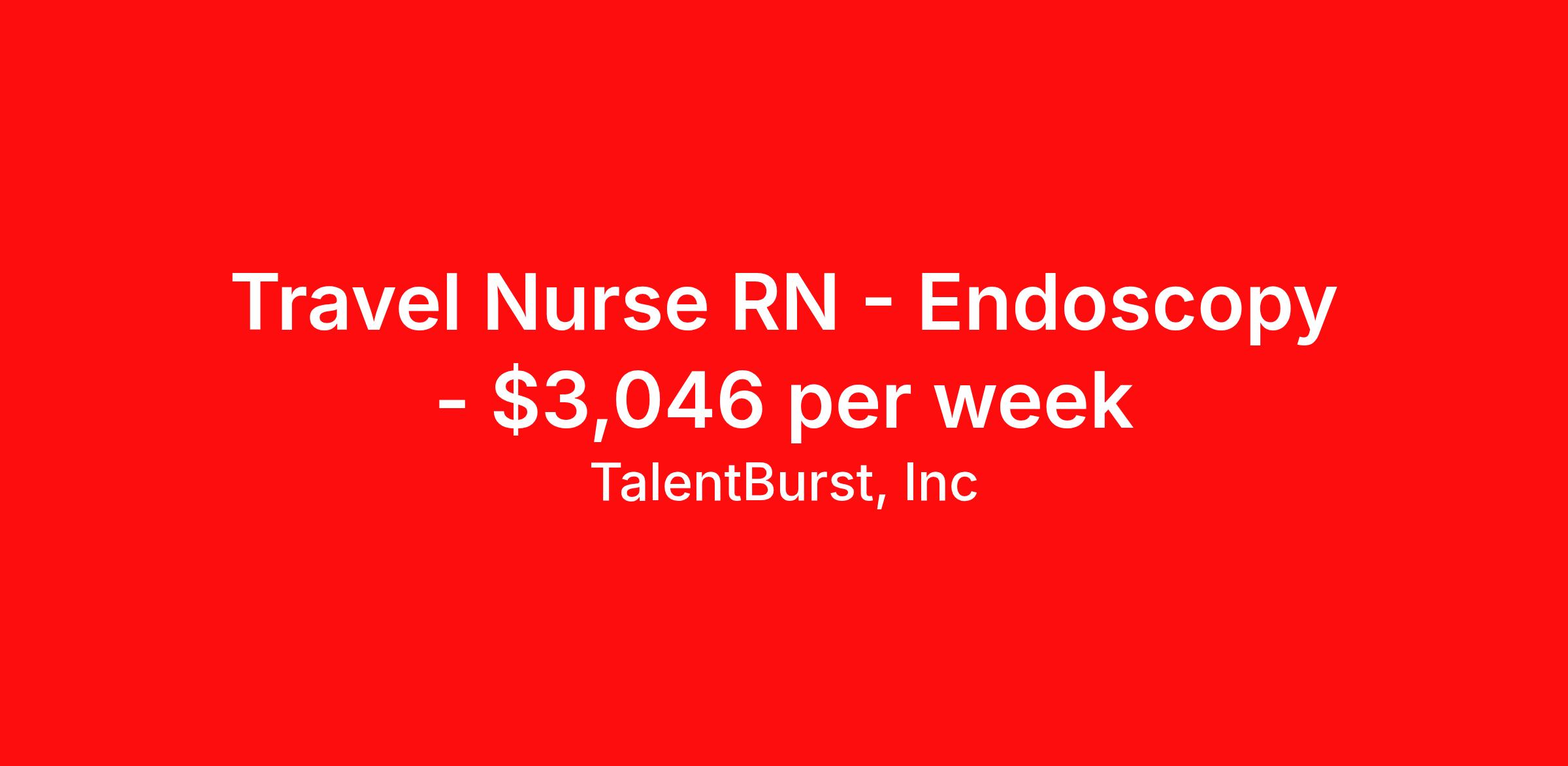 TalentBurst, Inc is seeking a travel nurse RN Endoscopy for a travel nursing job in Rome, New York. Job Description & Requirements Specialty: Endoscopy Discipline: RN Start Date: 04/20/2026 Duration: 13 weeks 40 hours per week Shift: 10 hours, days Employment Type: Travel Job Title: Registered Nurse - Endoscopy ENDO RN 30-mile radius rule 4, 10-hour shifts Must be flexible Mon-Fri 6 days of call per month. Possible weekend call. 40 hours guaranteed/week Experience in ERCP required EMR: Paragon and Pxyis TB_RN ZRHC Talent Burst Job ID 26-07302. Pay package is based on 10 hour shifts and 40 hours per week (subject to confirmation) with tax-free stipend amount to be determined. Posted job title: Registered Nurse - Endoscopy About TalentBurst, Inc TalentBurst Health & Life Sciences is an established provider of healthcare workforce solutions, servicing healthcare facilities across the United States for over 15 years. As a Joint Commission Certified Agency, our commitment to quality, integrity, and exceptional service has made us a trusted name in the healthcare staffing landscape. Our mission is to bridge the gap between healthcare professionals seeking fulfilling opportunities and healthcare organizations striving to maintain their high standards of care. We are committed to providing top-notch healthcare professionals with access to facilities where they can focus on delivering exceptional patient care and thrive. Whether you're a nurse, allied health professional, or administrative personnel, we have the expertise to match your skills and aspirations with the perfect placement.