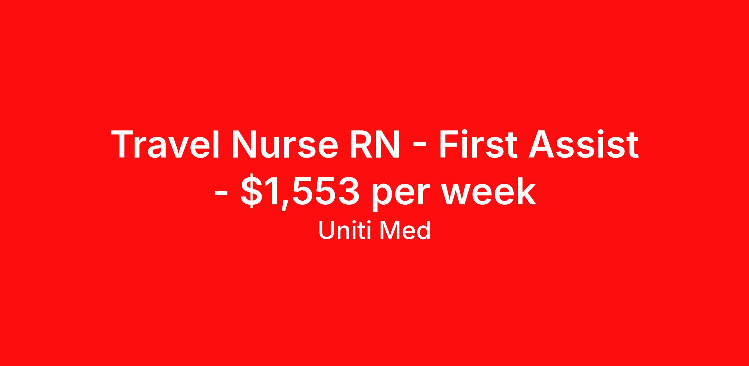 Uniti Med is seeking a travel nurse RN First Assist for a travel nursing job in Bakersfield, California. Job Description & Requirements Specialty: First Assist Discipline: RN Start Date: 04/13/2026 Duration: 2 weeks 40 hours per week Shift: 8 hours, days Employment Type: Travel Benefits: Day 1 Insurance Cigna medical, MetLife dental and vision insurance License reimbursement for new licenses needed for each assignment Discounts with hotels and rental cars A dedicated recruiter and support team that will help you every step of the way to sure you start on time and have an exceptional experience Referral bonus up to $700 About the Company: Finding the right role is about more than just matching skills to a job—it’s about aligning with your goals, values, and the way you want to work. As an award-winning talent partner, we support healthcare professionals through every step of that process, offering meaningful opportunities, clear guidance, and long-term partnership. From our first conversation to your first day on the job (and beyond!), we’re here to help you move forward with confidence. UnitiMed Job ID 787768. Pay package is based on 8 hour shifts and 40 hours per week (subject to confirmation) with tax-free stipend amount to be determined. Posted job title: Registered Nurse (RN) About Uniti Med Uniti Med meticulously matches your talents to our open needs to ensure the ultimate travel experience. Tell us where you want to go and let our experienced staff lead the way! Benefits Referral bonus Benefits start day 1 Employee assistance programs
