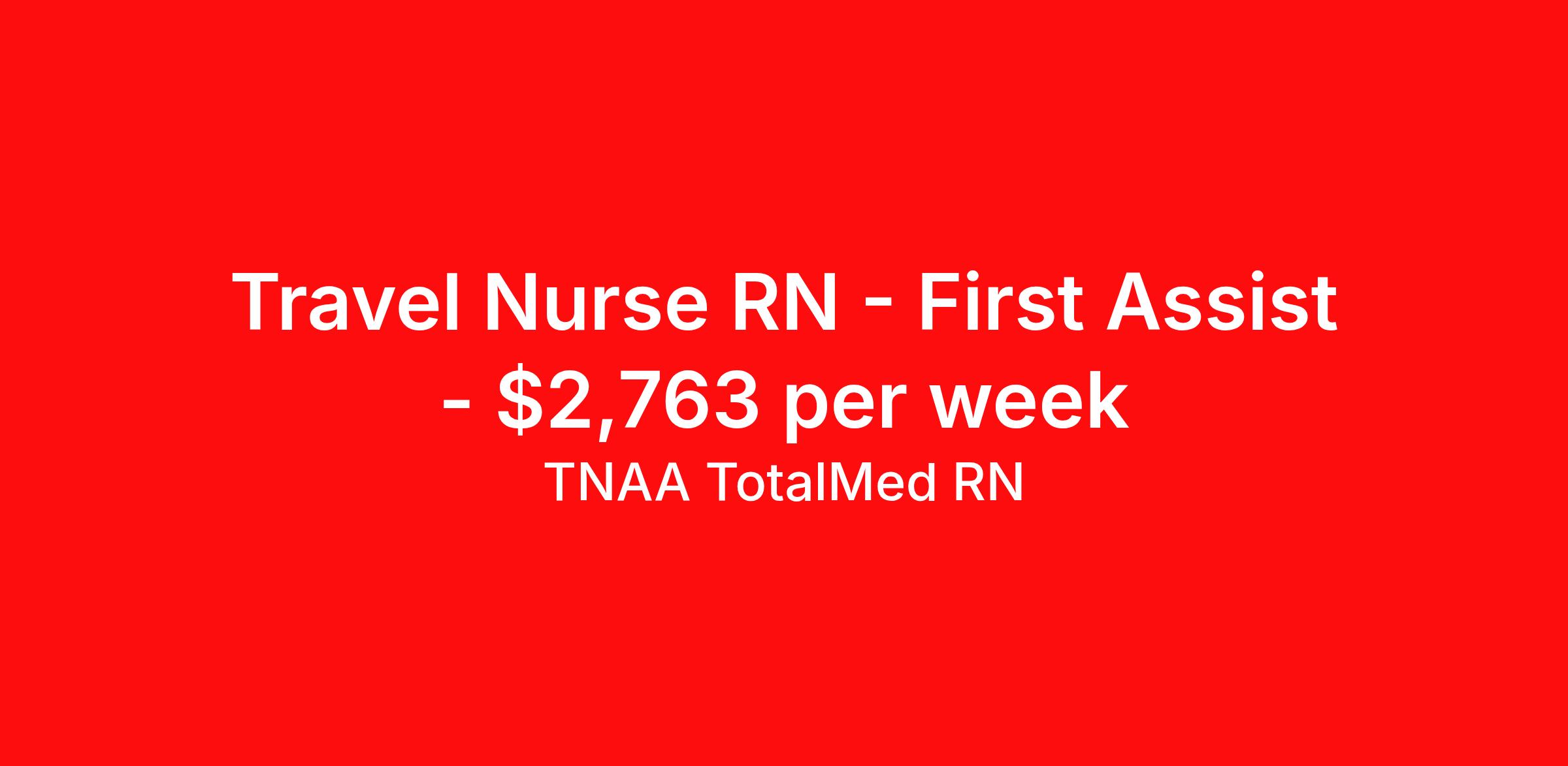 TNAA TotalMed RN is seeking a travel nurse RN First Assist for a travel nursing job in Rockford, Illinois. Job Description & Requirements Specialty: First Assist Discipline: RN Start Date: 04/12/2026 Duration: 13 weeks 40 hours per week Shift: 10 hours, days Employment Type: Travel 1395226 About TNAA TotalMed RN TotalMed is a Top Ten, travel nursing and healthcare staffing agency with the mission of igniting purpose in healthcare. The organization staffs nurses, therapists, pharmacists, and other clinicians of all specialties in all 50 states. They offer local and travel jobs and match caregivers with the right organization to assist both facilities and patients. As an organization, they focus on putting highly-skilled staff into facilities to ensure adequate staffing for a better patient experience. TotalMed specializes in recruiting and placing healthcare professionals in travel, PRN, and permanent positions across the country in Nursing and Allied Health. Throughout 2020, the organization filled roles at even the most short-staffed facilities during the most challenging time in healthcare. By matching the right travel healthcare professional with the right organization, TotalMed continues to offer a lifeline to facilities and their patients. Benefits Weekly pay Guaranteed Hours Continuing Education 401k retirement plan Sick pay Wellness and fitness programs Referral bonus Employee assistance programs Medical benefits Dental benefits Vision benefits Benefits start day 1