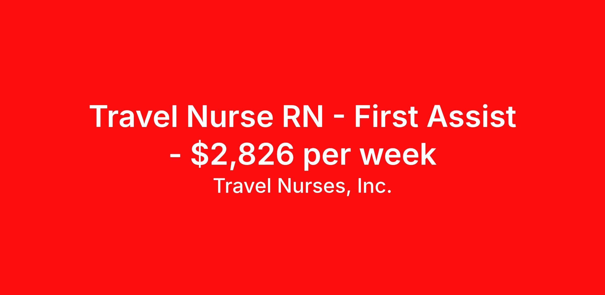 Travel Nurses, Inc. is seeking a travel nurse RN First Assist for a travel nursing job in Charleston, West Virginia. Job Description & Requirements Specialty: First Assist Discipline: RN Start Date: 04/02/2026 Duration: 13 weeks 40 hours per week Shift: 8 hours Employment Type: Travel Travel Nurses, Inc. Job ID 306903. Pay package is based on 8 hour shifts and 40 hours per week (subject to confirmation) with tax-free stipend amount to be determined. Posted job title: RNFA Registered Nurse About Travel Nurses, Inc. Travel Nurses, Inc. is a leading healthcare staffing agency that provides healthcare professionals with opportunities to work across the country. Founded by nurses in 1988, TNI has more than 30 years of experience in the industry. The agency initially focused on staffing operating room settings in the MidSouth. However, this quickly evolved to encompass all nursing specialties and allied health fields nationwide. At the heart of our mission is a profound respect for nurses, whom we consider the cornerstone of healthcare. This acknowledgment extends beyond the nursing profession alone. Travel Nurses, Inc. now proudly embraces a wide array of healthcare professionals, recognizing their crucial roles in our collective mission. Travel Nurses, Inc. is dedicated to providing comprehensive support and opportunities that will help facilitate complete career mobility in the healthcare field. Our commitment to transparency ensures that all professionals, not just nurses, can confidently accept any assignment without financial uncertainties. We prioritize our professionals’ well-being with comprehensive benefits packages, including day-one healthcare coverage, competitive salaries, bonuses and incentives. This underscores our unwavering commitment to offering the best possible rewards and support for all the professionals we serve. Benefits Weekly pay Continuing Education 401k retirement plan Wellness and fitness programs Mileage reimbursement Referral bonus Employee assistance programs Medical benefits Dental benefits Vision benefits Benefits start day 1 License and certification reimbursement Life insurance Retention bonus
