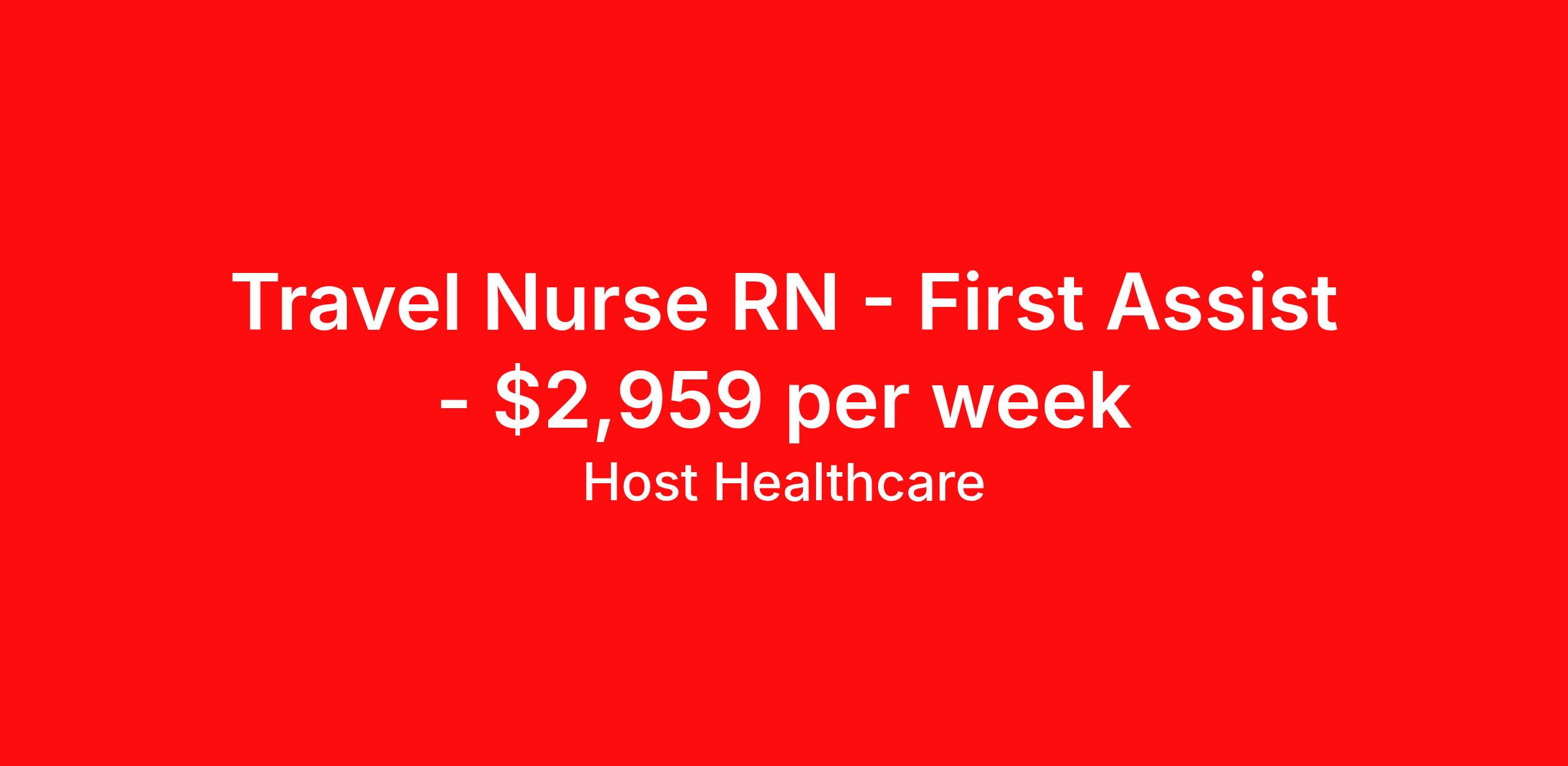Host Healthcare is seeking a travel nurse RN First Assist for a travel nursing job in Palm Springs, California. Job Description & Requirements Specialty: First Assist Discipline: RN Start Date: 04/01/2026 Duration: 13 weeks 40 hours per week Shift: 10 hours, days Employment Type: Travel Host Healthcare Job ID a1fVX000002wERFYA2. Pay package is based on 10 hour shifts and 40 hours per week (subject to confirmation) with tax-free stipend amount to be determined. Posted job title: RN - First Assist About Host Healthcare At Host Healthcare, we provide a truly comfortable experience as you explore your travel nursing, therapy, or allied career. We make your travel healthcare journey easy by taking care of all the details, so you don’t have to. We are on a mission to help others live better and we do this by helping the healers of the world be as comfortable as possible. With access to tens of thousands of travel nursing, therapy, and allied jobs in all 50 states, our responsive and friendly recruiters find your dream position based on what’s important to you. During your assignment, get access to premium benefits, including Day 1 medical that continues up to 30 days between assignments, 401K matching, travel reimbursements, dedicated housing support, and more. We also offer 24/7 support from our team and access to our on-staff clinicians so you can feel comfortable and confident throughout your entire assignment. Travel comfortably with Host Healthcare. Benefits Referral bonus School loan reimbursement Vision benefits Wellness and fitness programs Company provided housing options License and certification reimbursement Life insurance Medical benefits Mileage reimbursement Pet insurance Discount program Employee assistance programs Guaranteed Hours Health savings account Holiday Pay 401k retirement plan Continuing Education Dental benefits