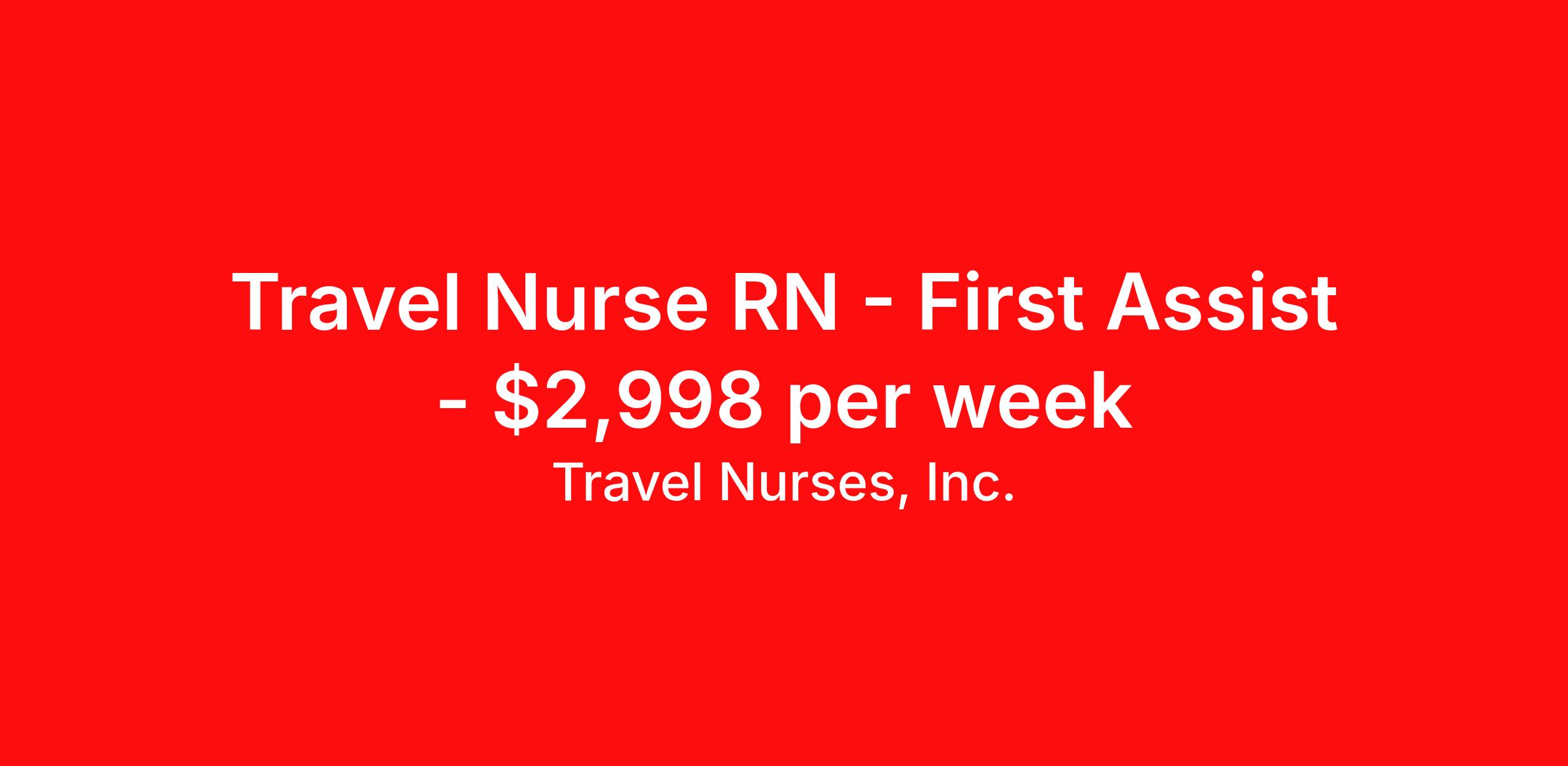 Travel Nurses, Inc. is seeking a travel nurse RN First Assist for a travel nursing job in Pittsfield, Massachusetts. Job Description & Requirements Specialty: First Assist Discipline: RN Start Date: ASAP Duration: 13 weeks 40 hours per week Shift: 8 hours Employment Type: Travel Travel Nurses, Inc. Job ID 302210. Pay package is based on 8 hour shifts and 40 hours per week (subject to confirmation) with tax-free stipend amount to be determined. Posted job title: Temp - Registered Nurse (RN) - First Assist (Days) Pittsfield, MA About Travel Nurses, Inc. Travel Nurses, Inc. is a leading healthcare staffing agency that provides healthcare professionals with opportunities to work across the country. Founded by nurses in 1988, TNI has more than 30 years of experience in the industry. The agency initially focused on staffing operating room settings in the MidSouth. However, this quickly evolved to encompass all nursing specialties and allied health fields nationwide. At the heart of our mission is a profound respect for nurses, whom we consider the cornerstone of healthcare. This acknowledgment extends beyond the nursing profession alone. Travel Nurses, Inc. now proudly embraces a wide array of healthcare professionals, recognizing their crucial roles in our collective mission. Travel Nurses, Inc. is dedicated to providing comprehensive support and opportunities that will help facilitate complete career mobility in the healthcare field. Our commitment to transparency ensures that all professionals, not just nurses, can confidently accept any assignment without financial uncertainties. We prioritize our professionals’ well-being with comprehensive benefits packages, including day-one healthcare coverage, competitive salaries, bonuses and incentives. This underscores our unwavering commitment to offering the best possible rewards and support for all the professionals we serve. Benefits Weekly pay Continuing Education 401k retirement plan Wellness and fitness programs Mileage reimbursement Referral bonus Employee assistance programs Medical benefits Dental benefits Vision benefits Benefits start day 1 License and certification reimbursement Life insurance Retention bonus