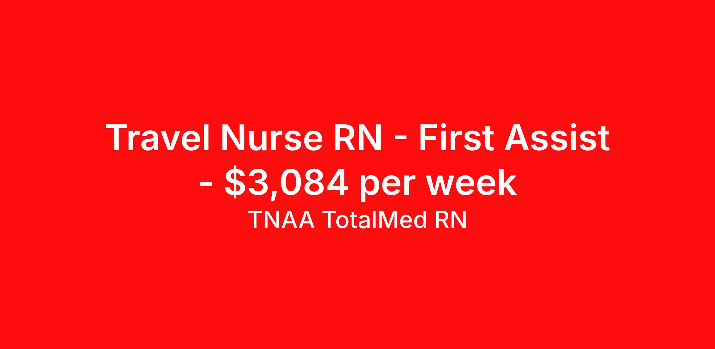 TNAA TotalMed RN is seeking a travel nurse RN First Assist for a travel nursing job in Northampton, Massachusetts. Job Description & Requirements Specialty: First Assist Discipline: RN Start Date: 03/30/2026 Duration: 13 weeks 40 hours per week Shift: 10 hours, days Employment Type: Travel About TNAA TotalMed RN TotalMed is a Top Ten, travel nursing and healthcare staffing agency with the mission of igniting purpose in healthcare. The organization staffs nurses, therapists, pharmacists, and other clinicians of all specialties in all 50 states. They offer local and travel jobs and match caregivers with the right organization to assist both facilities and patients. As an organization, they focus on putting highly-skilled staff into facilities to ensure adequate staffing for a better patient experience. TotalMed specializes in recruiting and placing healthcare professionals in travel, PRN, and permanent positions across the country in Nursing and Allied Health. Throughout 2020, the organization filled roles at even the most short-staffed facilities during the most challenging time in healthcare. By matching the right travel healthcare professional with the right organization, TotalMed continues to offer a lifeline to facilities and their patients. Benefits Weekly pay Guaranteed Hours Continuing Education 401k retirement plan Sick pay Wellness and fitness programs Referral bonus Employee assistance programs Medical benefits Dental benefits Vision benefits Benefits start day 1