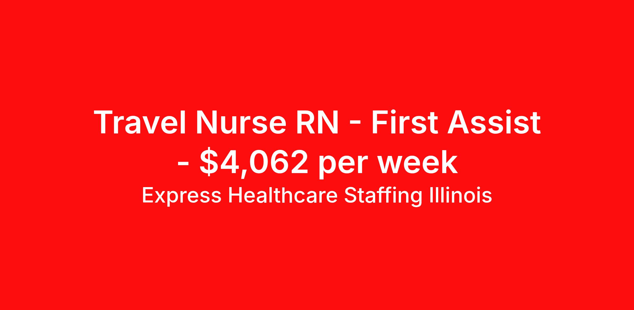 Express Healthcare Staffing Illinois is seeking a travel nurse RN First Assist for a travel nursing job in Peoria, Illinois. Job Description & Requirements Specialty: First Assist Discipline: RN Start Date: ASAP Duration: 13 weeks 40 hours per week Shift: 8 hours, days Employment Type: Travel Surgery-General(Major) RNFA Express Healthcare Staffing Illinois Job ID CIRO1038244. Pay package is based on 8 hour shifts and 40 hours per week (subject to confirmation) with tax-free stipend amount to be determined. About Express Healthcare Staffing Illinois Find your next job through Express Healthcare Staffing! As a professional in the healthcare field, you may not have the time to look for the right job to fit your skills. Lean on Express Healthcare to be your connection to the right opportunity. Work the Way You Want Whether you are seeking a Per Diem, Contract, or Direct Hire Position, one of our Express Healthcare Staffing Employment Specialists will work with you to find the healthcare position you desire. Per Diem Per Diem, or “per day,” includes employment/payment based on a day-to-day basis rather than a full-time position. Per Diem clinicians often fill in for absent healthcare workers and are on an on-call basis. Shifts are often irregular, and as a clinician, you can accept or deny an assignment based on your schedule. This is the perfect opportunity for clinicians who want to or need to choose where, when, and how often they want to work. Contract/Travel Nursing The Express Healthcare team can place clinical staff in local contract opportunities that range from four- to 26-weeks. Our contract positions may be eligible (based on location) for a variety of perks, including: Guaranteed assignments that can extend up to one year Local block booking opportunities Dedicated negotiation and clinical support from our Express Healthcare team Daily Per Diem allowance for qualified staff Visit our website for more info: https://www.expresshealthcare.com/ Benefits Weekly pay Medical benefits Referral bonus 401k retirement plan Life insurance