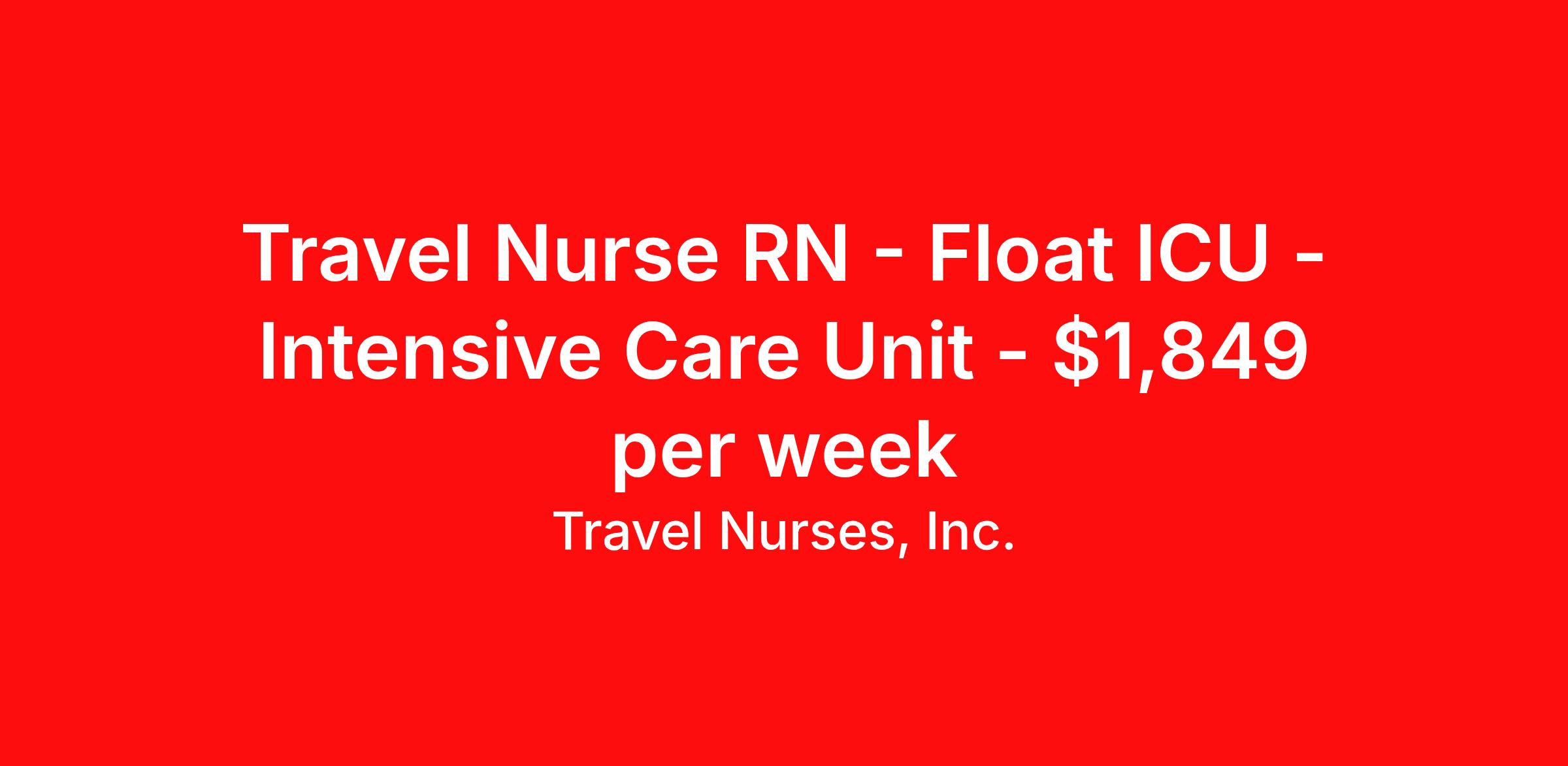 Travel Nurses, Inc. is seeking a travel nurse RN Float ICU - Intensive Care Unit for a travel nursing job in Cartersville, Georgia. Job Description & Requirements Specialty: ICU - Intensive Care Unit Discipline: RN Start Date: ASAP Duration: 13 weeks 36 hours per week Shift: 12 hours Employment Type: Travel Travel Nurses, Inc. Job ID 298742. Pay package is based on 12 hour shifts and 36 hours per week (subject to confirmation) with tax-free stipend amount to be determined. Posted job title: Critical Care Float Registered Nurse About Travel Nurses, Inc. Travel Nurses, Inc. is a leading healthcare staffing agency that provides healthcare professionals with opportunities to work across the country. Founded by nurses in 1988, TNI has more than 30 years of experience in the industry. The agency initially focused on staffing operating room settings in the MidSouth. However, this quickly evolved to encompass all nursing specialties and allied health fields nationwide. At the heart of our mission is a profound respect for nurses, whom we consider the cornerstone of healthcare. This acknowledgment extends beyond the nursing profession alone. Travel Nurses, Inc. now proudly embraces a wide array of healthcare professionals, recognizing their crucial roles in our collective mission. Travel Nurses, Inc. is dedicated to providing comprehensive support and opportunities that will help facilitate complete career mobility in the healthcare field. Our commitment to transparency ensures that all professionals, not just nurses, can confidently accept any assignment without financial uncertainties. We prioritize our professionals’ well-being with comprehensive benefits packages, including day-one healthcare coverage, competitive salaries, bonuses and incentives. This underscores our unwavering commitment to offering the best possible rewards and support for all the professionals we serve. Benefits Weekly pay Continuing Education 401k retirement plan Wellness and fitness programs Mileage reimbursement Referral bonus Employee assistance programs Medical benefits Dental benefits Vision benefits Benefits start day 1 License and certification reimbursement Life insurance Retention bonus