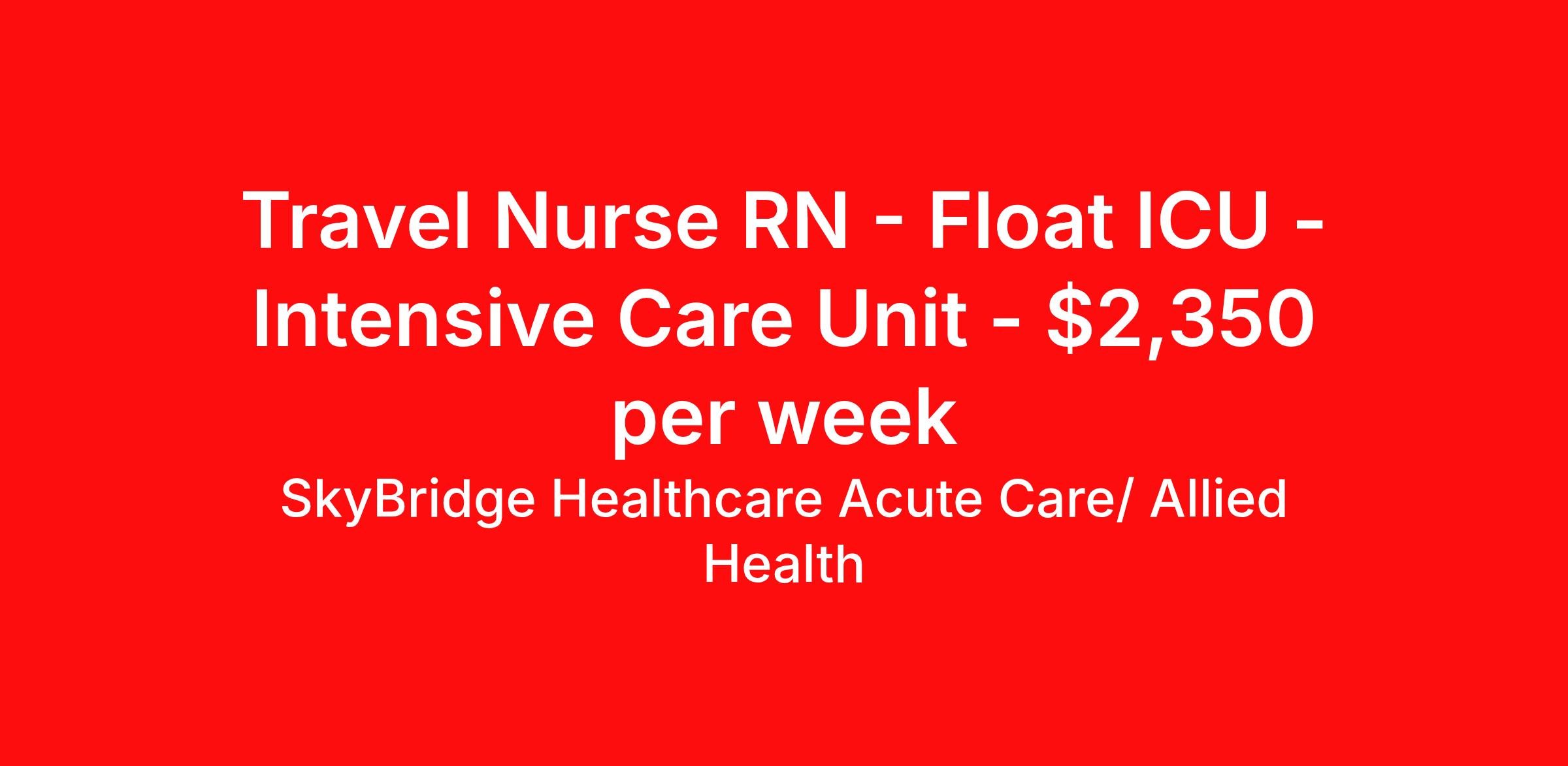 SkyBridge Healthcare Acute Care/ Allied Health is seeking a travel nurse RN Float ICU - Intensive Care Unit for a travel nursing job in Saint Louis, Missouri. Job Description & Requirements Specialty: ICU - Intensive Care Unit Discipline: RN Duration: 13 weeks 36 hours per week Shift: 12 hours, nights Employment Type: Travel SkyBridge Healthcare Acute Care/ Allied Health Job ID MLym2. Pay package is based on 12 hour shifts and 36 hours per week (subject to confirmation) with tax-free stipend amount to be determined. About SkyBridge Healthcare Acute Care/ Allied Health It is our mission at SkyBridge Healthcare to connect professionals within the healthcare community through both genuine relationships and quality work. We understand the demands of healthcare positions which is why we want to give back to Healthcare Professionals who give so much to their communities. We’re partnered with some of the greatest facilities in the nation, therefore we ensure our Healthcare Professionals will receive top-notch treatment every step of the way. Our specialties include Nursing, Allied Health, Laboratory, Therapy, Healthcare Information Technology, and Revenue Cycle. Follow us on social media to stay in the know of our latest company updates and job postings. Benefits Weekly pay Holiday Pay Guaranteed Hours Vision benefits 401k retirement plan License and certification reimbursement Mileage reimbursement Referral bonus Employee assistance programs Medical benefits Life insurance Dental benefits