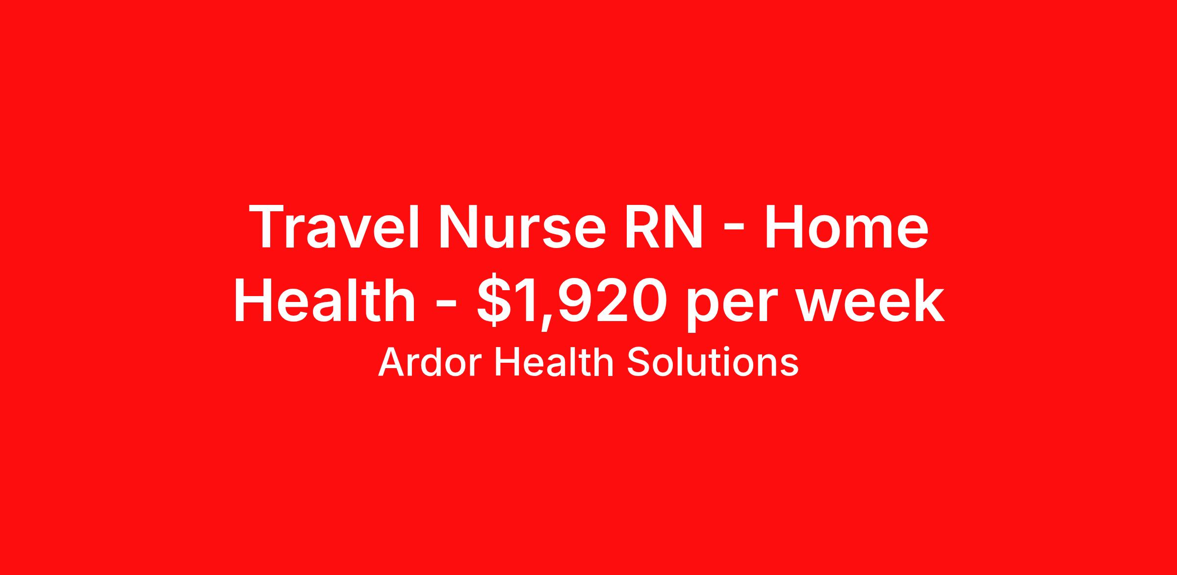 Ardor Health Solutions is seeking a travel nurse RN Home Health for a travel nursing job in Greensburg, Kentucky. Job Description & Requirements Specialty: Home Health Discipline: RN Start Date: 03/30/2026 Duration: 13 weeks 40 hours per week Shift: 8 hours Employment Type: Travel Location: Greensburg, KY Setting: HOME HEALTH Employment Type: Traveler Ardor Health Solutions is looking for a Home Health - HH to join our travel team in Greensburg, KY! This is a full time travel contract position. Requirements include, but are not limited to: Active KY CONSOLIDATED HOME HEALTH & HOSPICE (07440) license 2 years of Home Health - HH experience This position begins on 03/30/2026 and ends on 06/28/2026 Benefits include: Major Medical Dental/Vision Insurance Pet Insurance Life Insurance with extensive family health options License Reimbursements and processing assistance with our internal licensing department $500 referral bonus 24-hour emergency access to our offices About Ardor Health Solutions: Ardor Health Solutions is a fun, energetic, and passionate group of healthcare staffing professionals. We strive to bring you the highest quality positions that are perfect for your career. We are dedicated to finding you a travel position that not only provides superior compensation, but enriches your life. Ardor Health Solutions is a Fortune Ranked, award-winning, expanding company that has also recently been ranked the 20th Largest Allied Staffing Firm in the Nation by Staffing Industry Analysts (SIA) and by Fortune`s Great Places to Work Survey s several years in a row. For more information or to be considered, please apply now. COVID-19 vaccination and testing requirements vary by facility. Ardor Health adheres to the guidelines and requirements of each facility, as well as all applicable federal, state, and local laws. Ardor Health Job ID 808080. Pay package is based on 8 hour shifts and 40 hours per week (subject to confirmation) with tax-free stipend amount to be determined. Posted job title: Home Health About Ardor Health Solutions Ardor Health Solutions formed in 2001 and remains a privately held medical staffing business owned and operated by the same family. Over the years we have expanded our staffing and recruiting capabilities to include therapy services, nursing services, and all allied services. If you would like the personal service that comes with a staff of recruiters that have an average tenure with the company between 5 and 15 years, and the knowledge of our client services representatives with similar experience, there is no need to look any further. At Ardor Health Solutions you can expect better than average pay packages, extraordinary benefits, and the peace of mind that you will not be forgotten once you start your assignment. Perhaps that is why so many of our caregivers have completed more than a dozen different assignments with us over our long history. Ardor Health is pleased to offer a free medical insurance plan in addition to major medical plans. Please contact a recruiter for more details on the free medical plan and/or any other general inquiries. One final fact about Ardor Health Solutions. We have been paying our caregivers weekly since 2001, and we have never, ever, missed a payroll. If you are currently on an assignment with us, thank you. If you have traveled with us before, we would like to welcome you back. If you have never traveled with us, give us a try. You will not be disappointed. Benefits Weekly pay Holiday Pay Pet insurance Referral bonus Employee assistance programs Medical benefits Dental benefits Vision benefits Benefits start day 1 License and certification reimbursement Life insurance Discount program