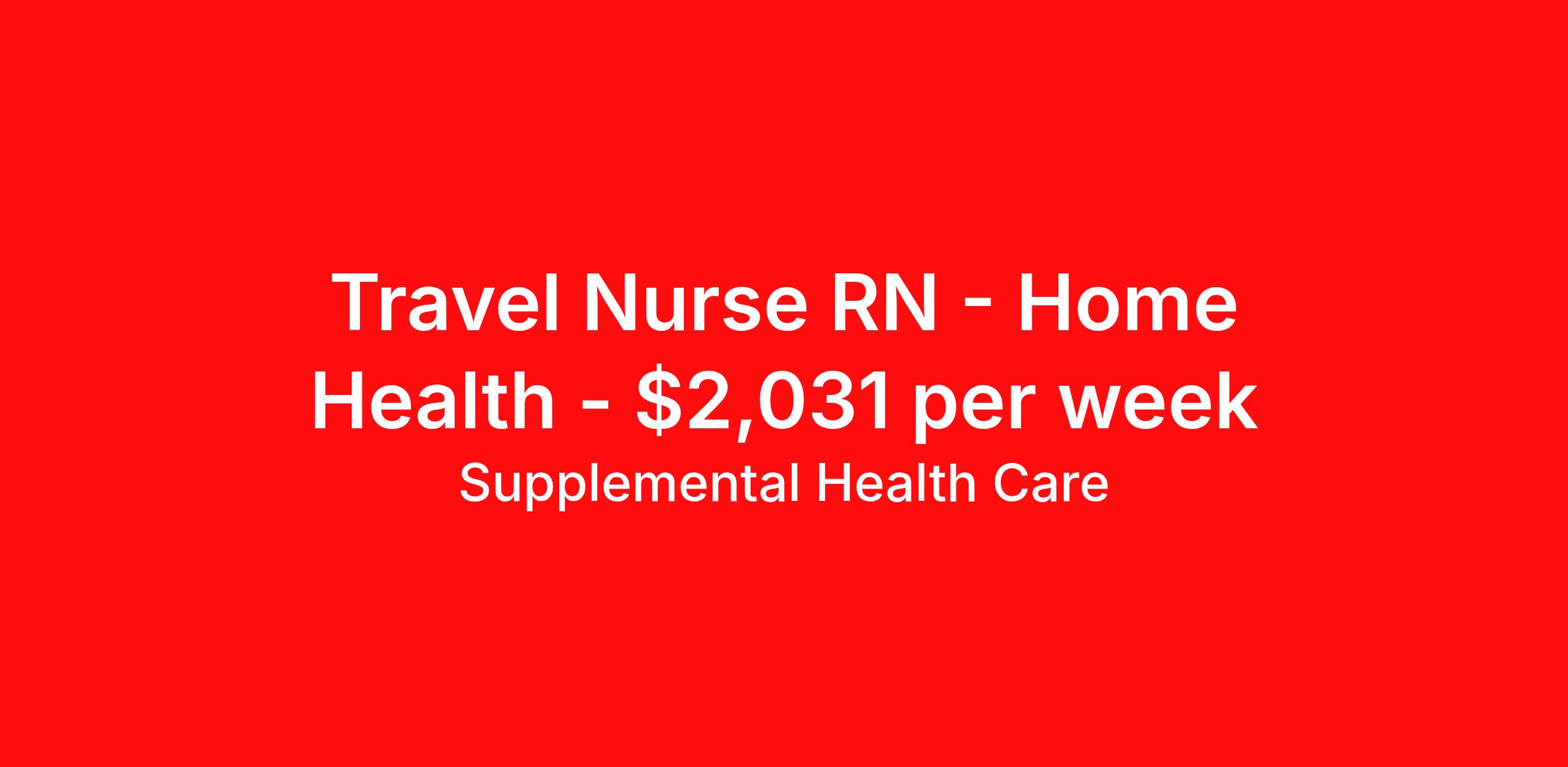 Supplemental Health Care is seeking a travel nurse RN Home Health for a travel nursing job in Wayne, New Jersey. Job Description & Requirements Specialty: Home Health Discipline: RN Start Date: ASAP Duration: 13 weeks 40 hours per week Shift: 8 hours, days Employment Type: Travel Job Description: Supplemental Health Care is hiring experienced RNs with recent Medicare-certified visits experience for home health contracts in Wayne, New Jersey and the surrounding areas. Whether you’re looking to travel or stay local, we’re committed to helping Home Health Registered Nurses find the right fit with top healthcare facilities across the country. With more than 40 years of experience in healthcare staffing, Supplemental Health Care offers reliable support, competitive pay, and great benefits every step of the way. Qualifications: OASIS/Medicare Certified Visits Experience Electronic Charting experience Minimum of 1 year of recent home health nursing experience (private duty does not qualify) Current New Jersey RN License American Heart Association BLS Valid U.S. Driver's License Home Health RN Contract Details: $1,840 - $2,031 per week* 13-week contract SHC Home Health Nurses are paid by the hour, not by the visit Nurse will have a designated territory of coverage Average weekly expectation is 30 units of productivity Home Health contracts with SHC require previous experience with OASIS/Medicare Certified Visits We know that at-home healthcare is a very different environment and requires specialized knowledge and support for our nurses to be successful. We offer the benefits, career guidance, and round-the-clock assistance that you want from your home health employment partner. That’s why over 80% of our working home health nurses say they would recommend us to a friend. Apply today to get started with this Home Health RN contract opportunity, or talk to our team about the full range of Registered Nurse opportunities available. What We Offer: Full medical, dental, vision, life, and even pet insurance! Round the clock support. No matter where you are or what time it is, Supplemental Health Care is standing by. SHC's Share the Care referral program is the most dynamic, profitable referral program in the industry. 401(k) Retirement Savings Program with a wide range of investment options. Discounted and free online access to CEU courses through Supplemental University. Health insurance 401k matching Estimated weekly payment may include both taxable wages and tax-free reimbursements for meals, housing, and incidentals. Please speak with a recruiter for details. Supplemental Health Care is an Equal Opportunity Employer. All candidates, including veterans and those with disabilities, are encouraged to apply. SHC will consider for employment qualified applicants with criminal histories in a manner consistent with the requirements of applicable local, state, or federal law. To learn more, visit www.shccares.com/eeo Supplemental Health Care Job ID 1468912. Pay package is based on 8 hour shifts and 40 hours per week (subject to confirmation) with tax-free stipend amount to be determined. Posted job title: Home Health RN About Supplemental Health Care At Supplemental Health Care, a simple belief in the power of caring guides a unique commitment to world-class service in healthcare staffing. For 40 years, we’ve supported talented professionals pursuing their life calling in hospitals, schools, home health, corrections, behavioral health, and other settings. At SHC, we inspire vital connections and enrich lives and inspire better outcomes. As recipients of the Best in Staffing Awards for both Client and Talent, Supplemental Health Care is proud to be among only 2% of staffing companies singled out for the distinction based on the real feedback of our employees and the clients we serve. SHC has also earned The Joint Commission’s Gold Seal of Approval and is named among the Largest Health Care Staffing companies in the United States by Staffing Industry Analysts. We are also thrilled to recognize our very own SLP, Dr. Kelly Byrd as the American Staffing Association 2024 National Staffing Employee of the Year and Health Care Sector All-Star. We’re honored to connect Dr. Byrd to employment, share her incredible story, and support her family literacy nonprofit. For everyone that we serve, SHC is the place where caring hearts thrive. Benefits Referral bonus Benefits start day 1 401k retirement plan Continuing Education Discount program Health savings account