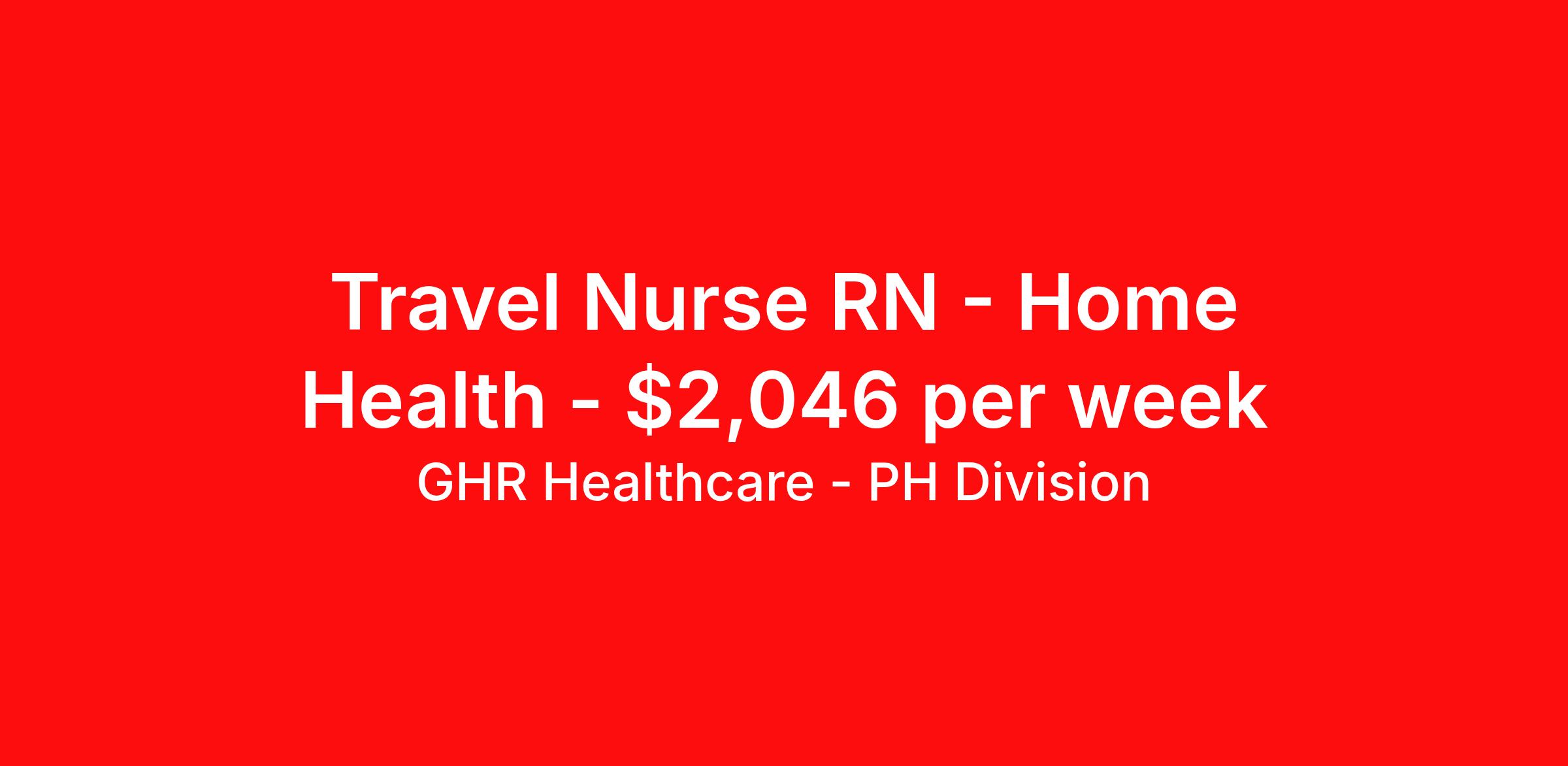 GHR Healthcare - PH Division is seeking a travel nurse RN Home Health for a travel nursing job in Wichita, Kansas. Job Description & Requirements Specialty: Home Health Discipline: RN Start Date: 04/13/2026 Duration: 13 weeks 40 hours per week Shift: 8 hours, days Employment Type: Travel About GHR Healthcare - PH Division For over 30 years, GHR Healthcare has been the bridge between healthcare professionals and the facilities that need them nationwide. We're committed to uncovering your ideal fit, supported by GHR's dedication to competitive compensation, transparent communication, and a devoted team that genuinely cares about your career journey. You can trust us to stand by your side as your advocate, confidante, and partner in advancing your career. At GHR, care and consideration are at the heart of everything we do. Visit ghrhealthcare.com to learn more.