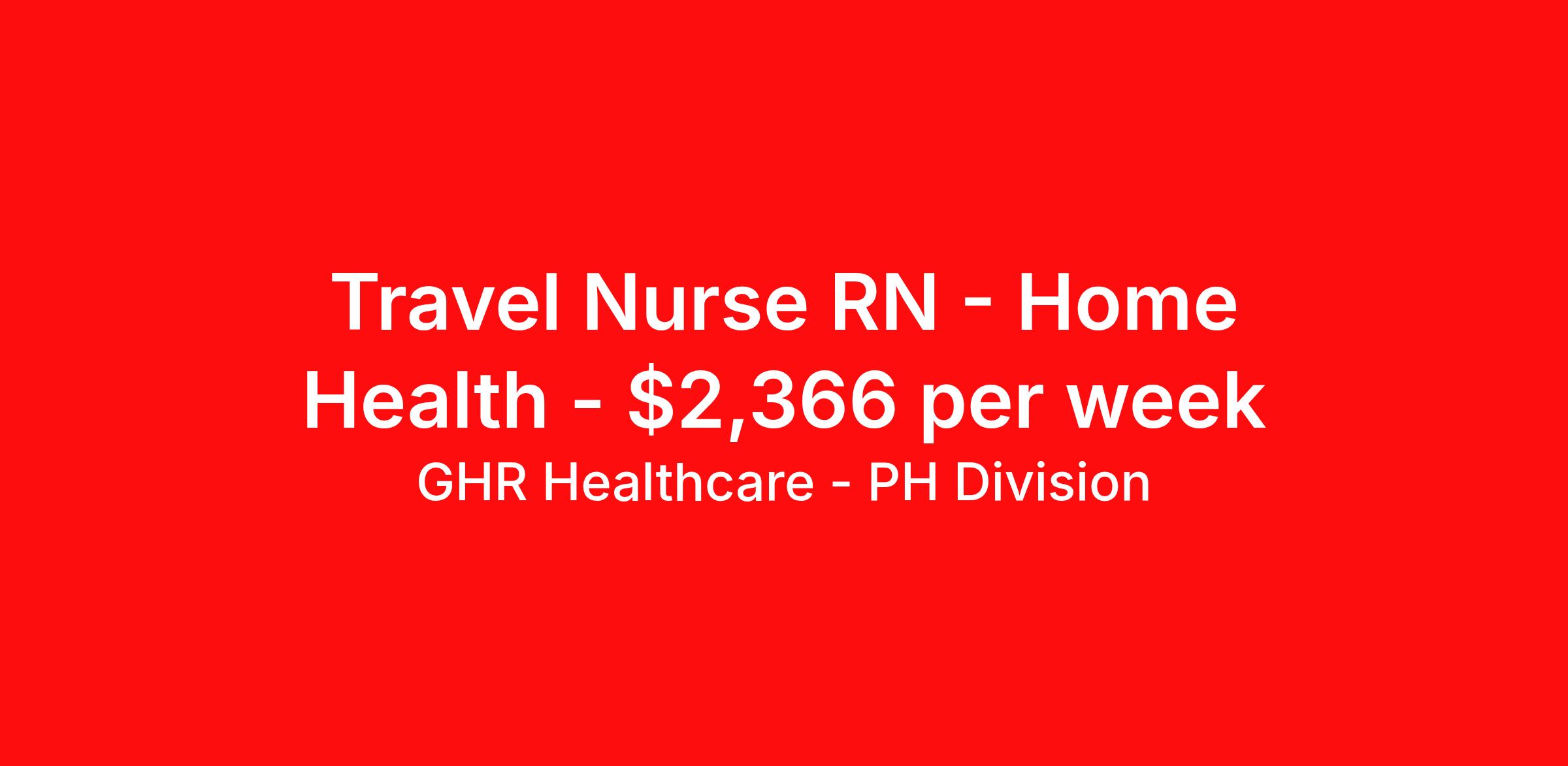 GHR Healthcare - PH Division is seeking a travel nurse RN Home Health for a travel nursing job in Buffalo, New York. Job Description & Requirements Specialty: Home Health Discipline: RN Start Date: 04/06/2026 Duration: 13 weeks 40 hours per week Shift: 8 hours, days Employment Type: Travel About GHR Healthcare - PH Division For over 30 years, GHR Healthcare has been the bridge between healthcare professionals and the facilities that need them nationwide. We're committed to uncovering your ideal fit, supported by GHR's dedication to competitive compensation, transparent communication, and a devoted team that genuinely cares about your career journey. You can trust us to stand by your side as your advocate, confidante, and partner in advancing your career. At GHR, care and consideration are at the heart of everything we do. Visit ghrhealthcare.com to learn more.