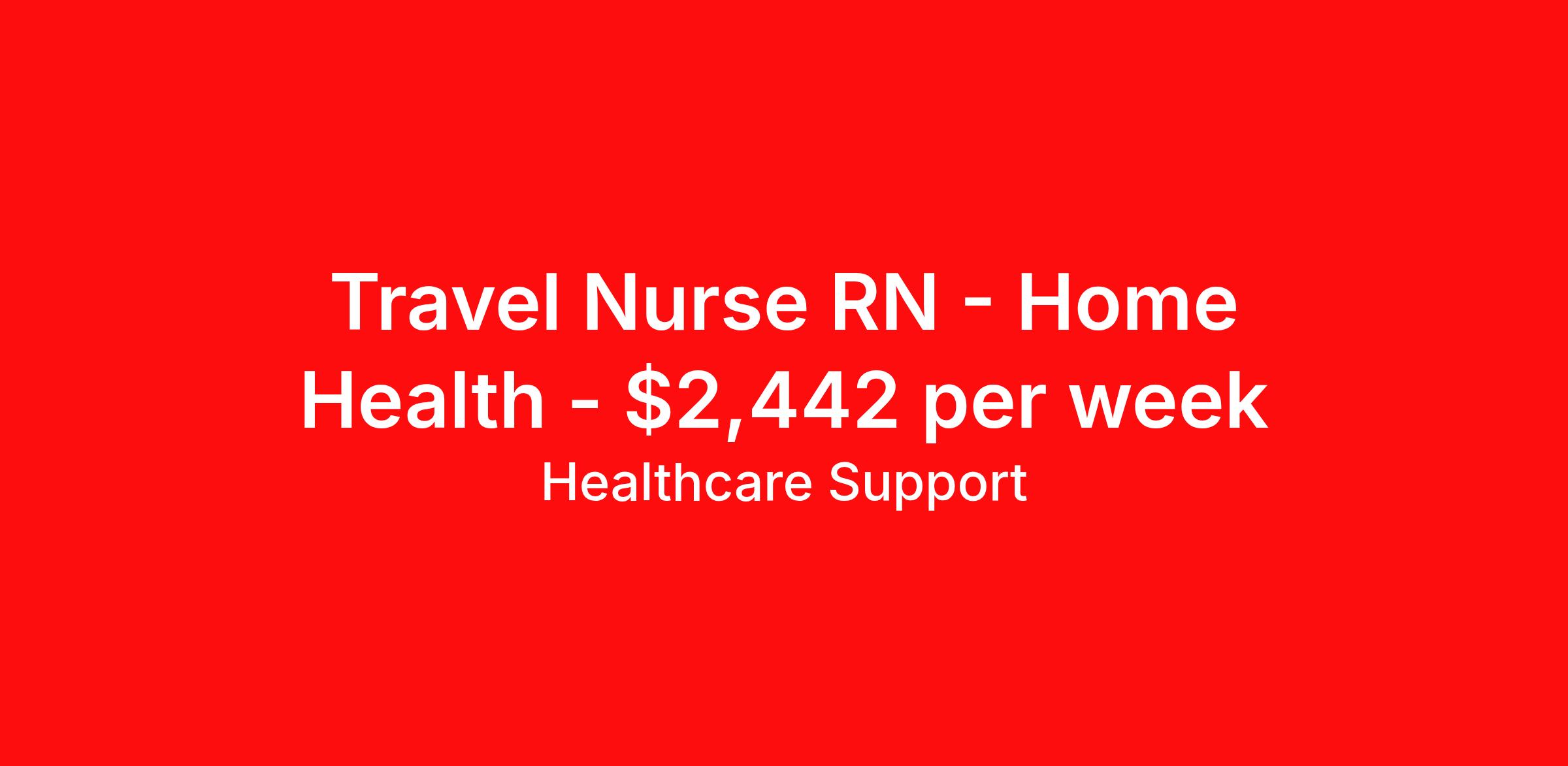 Healthcare Support is seeking a travel nurse RN Home Health for a travel nursing job in Camp Hill, Pennsylvania. Job Description & Requirements Specialty: Home Health Discipline: RN Start Date: ASAP Duration: 8 weeks 40 hours per week Shift: 8 hours Employment Type: Travel At HealthCare Support, we specialize in offering healthcare professionals a seamless, red-carpet experience throughout their travel journey. Whether you're a nurse, therapist, or allied health professional, we're dedicated to matching you with top-rated facilities nationwide to help you take the next step in your career. With 20 years of industry experience and strong relationships with respected organizations across all 50 states, we offer opportunities at leading health systems, hospitals, specialty clinics, and post-acute facilities. Thanks to our direct client partnerships and national MSP programs, you'll have the flexibility to work where you want and go wherever your adventure takes you. Partner with HealthCare Support and experience a travel career where you can count on us every step of the way. Your next opportunity is waiting—let us connect you to the adventure of a lifetime! Healthcare Support Job ID 491175. Pay package is based on 8 hour shifts and 40 hours per week (subject to confirmation) with tax-free stipend amount to be determined. Posted job title: rn home health About Healthcare Support Healthcare Support excels at providing a streamlined and red-carpet experience for our travelers. Whether you are a nurse, a therapist, or an allied health professional, our goal is to connect you with top-rated facilities throughout the country and get you on the road to your next adventure. We leverage 20 years of relationships with the industry’s most respectable companies across all 50 states, both through direct client partnerships and via national MSP programs. From health systems and hospitals to specialty clinics and post-acute facilities, you can work where you want to work and go where you want to go. Not only does HealthCare Support reimburse for relocation and travel costs on your first check, but we also offer license and certification reimbursements required for your assignments so that you can focus on building your career. During your assignment, you’ll have access to medical benefits, 24/7 support from our Clinical Advocacy Team, and a travel team with stateside operations. Your travel team will include a designated credentialing expert to help you navigate every step of the on-boarding process, a payroll specialist who you can communicate with directly, and a skilled recruiter who takes the time to understand your needs and works hard to find the right position for you. Don’t get lost in the shuffle of another overblown staffing agency. Choose HealthCare Support to be your trusted partner that you can rely on for all your travel assignments. We can’t wait to hear about the amazing adventures you’ll have! Pst! Ask us about our Direct Hire Opportunities! Benefits License and certification reimbursement Medical benefits Dental benefits Mileage reimbursement Employee assistance programs Referral bonus 401k retirement plan Holiday Pay Weekly pay