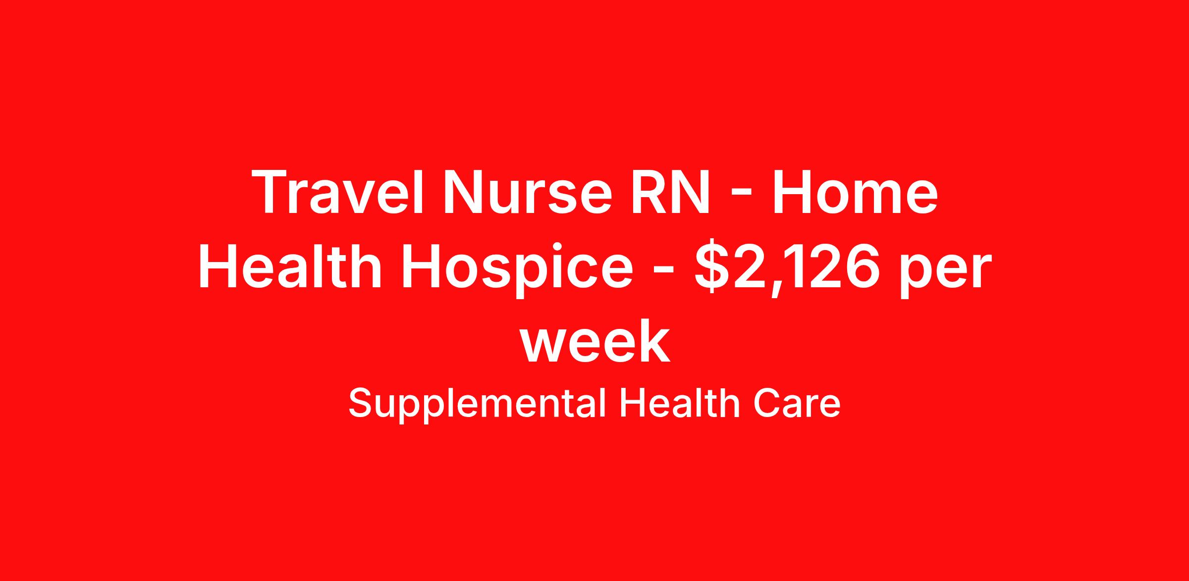 Supplemental Health Care is seeking a travel nurse RN Home Health Hospice for a travel nursing job in Osceola, Missouri. Job Description & Requirements Specialty: Hospice Discipline: RN Start Date: ASAP Duration: 13 weeks 40 hours per week Shift: 8 hours, days Employment Type: Travel Job Description: Supplemental Health Care is hiring compassionate and experienced Hospice RNs to provide patient-centered care for individuals and families in Osceola, Missouri, and surrounding areas. Qualifications: Active, unencumbered RN license in the state of assignment Current BLS certification (American Heart Association) CHPN certification preferred, not required 1 year of recent experience (within last 3 years) in hospice, home health, palliative care, or acute care Strong knowledge of symptom management, pain control, and hospice documentation (CMS CoPs, Medicare Hospice Benefit) Clear background and driving record; current TB test and immunizations Reliable transportation and valid auto insurance Flexibility for travel, occasional evenings, weekends, and on-call shifts Hospice RN Contract Details: $1,960 - $2,126 per week* Nurse will have a designated territory of coverage 4- 6 patient visits per day (45 - 90 minutes each, depending on need) Travel time included in scheduling All nurses on contract with SHC are paid weekly Key Responsibilities: Perform comprehensive assessments and develop individualized hospice care plans Deliver skilled nursing care, symptom management, and emotional support Educate patients and families on hospice philosophy and comfort care practices Collaborate with the interdisciplinary team to review and adjust care plans Maintain accurate documentation in compliance with hospice standards Whether you want to travel or stay local, we help Hospice RNs find the perfect fit with leading healthcare organizations nationwide. With 40 years in healthcare staffing, Supplemental Health Care provides trusted support, competitive pay, and great benefits every step of the way. Apply today to get started with this Hospice Registered Nurse contract opportunity, or talk to our team about the full range of RN opportunities available. What We Offer: Full medical, dental, vision, life, and even pet insurance! Round the clock support. No matter where you are or what time it is, Supplemental Health Care is standing by. SHC's Share the Care referral program is the most dynamic, profitable referral program in the industry. 401(k) Retirement Savings Program with a wide range of investment options. Discounted and free online access to CEU courses through Supplemental University. Please speak with a recruiter for details. Supplemental Health Care is an Equal Opportunity Employer. All candidates, including veterans and those with disabilities, are encouraged to apply. SHC will consider for employment qualified applicants with criminal histories in a manner consistent with the requirements of applicable local, state, or federal law. To learn more, visit www.shccares.com/eeo Supplemental Health Care Job ID 1471175. Pay package is based on 8 hour shifts and 40 hours per week (subject to confirmation) with tax-free stipend amount to be determined. Posted job title: Hospice Registered Nurse (RN) About Supplemental Health Care At Supplemental Health Care, a simple belief in the power of caring guides a unique commitment to world-class service in healthcare staffing. For 40 years, we’ve supported talented professionals pursuing their life calling in hospitals, schools, home health, corrections, behavioral health, and other settings. At SHC, we inspire vital connections and enrich lives and inspire better outcomes. As recipients of the Best in Staffing Awards for both Client and Talent, Supplemental Health Care is proud to be among only 2% of staffing companies singled out for the distinction based on the real feedback of our employees and the clients we serve. SHC has also earned The Joint Commission’s Gold Seal of Approval and is named among the Largest Health Care Staffing companies in the United States by Staffing Industry Analysts. We are also thrilled to recognize our very own SLP, Dr. Kelly Byrd as the American Staffing Association 2024 National Staffing Employee of the Year and Health Care Sector All-Star. We’re honored to connect Dr. Byrd to employment, share her incredible story, and support her family literacy nonprofit. For everyone that we serve, SHC is the place where caring hearts thrive. Benefits Referral bonus Benefits start day 1 401k retirement plan Continuing Education Discount program Health savings account