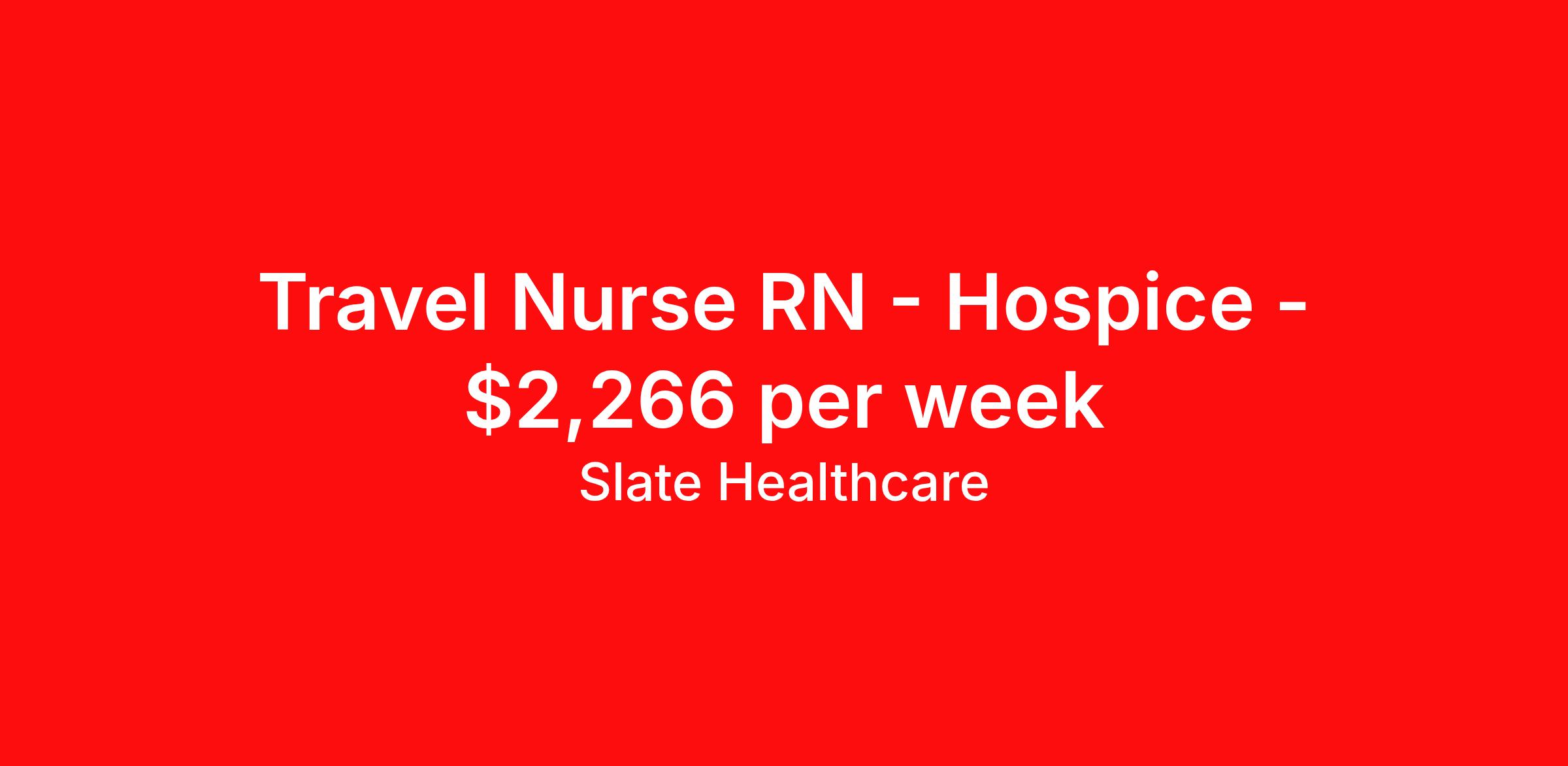 Slate Healthcare is seeking a travel nurse RN Hospice for a travel nursing job in Rapid City, South Dakota. Job Description & Requirements Specialty: Hospice Discipline: RN Start Date: 04/13/2026 Duration: 13 weeks 36 hours per week Shift: 12 hours, nights Employment Type: Travel Profession:RN, JobSpecialty:Hospice, Shift:3x12 Nights, Duration:13 weeks Slate Healthcare Job ID 288a5e01-996c-4277-bea8-009255139688. Pay package is based on 12 hour shifts and 36 hours per week (subject to confirmation) with tax-free stipend amount to be determined. About Slate Healthcare Slate Healthcare is a premier travel healthcare staffing agency, connecting healthcare professionals with thousands of opportunities at top-tier hospitals and facilities across the country. We’re committed to supporting nurses and allied health professionals in building stable, fulfilling careers—while embracing the freedom and excitement that comes with travel. Our goal is simple: to offer flexibility, competitive pay, and personalized placements that align with each clinician’s lifestyle and career goals. At Slate, we empower our professionals to choose when and where they work, while ensuring they receive the highest compensation possible—because we believe that exceptional care starts with empowered caregivers.