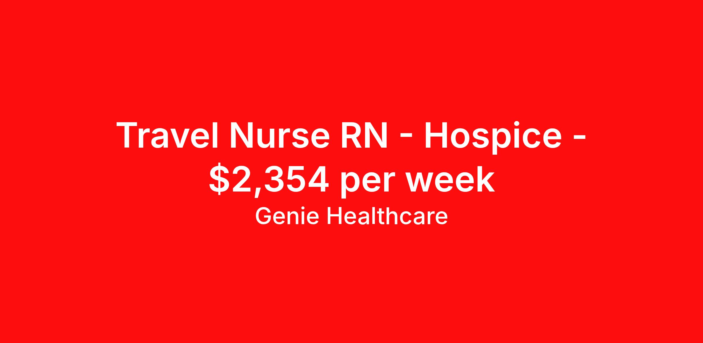 Genie Healthcare is seeking a travel nurse RN Hospice for a travel nursing job in Rapid City, South Dakota. Job Description & Requirements Specialty: Hospice Discipline: RN Start Date: 04/13/2026 Duration: 13 weeks 36 hours per week Shift: 12 hours, nights Employment Type: Travel Genie Healthcare is looking for a RN to work in Hospice for a 12.71 weeks travel assignment located in Rapid City, SD for the Shift (3x12 nights, 19:00:00-07:00:00, 12.00-3). Pay and benefits packages are estimated based on client bill rate at time the job was posted. These rates are subject to change. Exact pay and benefits vary based on several things, including, but not limited to, guaranteed hours, client changes in bill rate, experience, etc. Benefits: Medical Insurance, Dental Insurance, Vision Insurance, 401(k) with company matching (50% up to 6% of what you contribute) Genie Healthcare Job ID 17989143. Pay package is based on 12 hour shifts and 36.0 hours per week (subject to confirmation) with tax-free stipend amount to be determined. Posted job title: RN:Hospice,19:00:00-07:00:00 About Genie Healthcare Genie Healthcare is one of the fastest growing Nurse Travel Agencies in the USA. Genie serves hundreds of facilities and has over 4000 current travel RN contracts open at any given time. Genie provides travel RN’s flexibility, support, top pay scale, housing and the 1 rated, multi-state health insurance coverage. Genie Healthcare carries with it a commitment to providing a comprehensive level of service and quality care. Growing from a small team of eager recruiters to a company with satisfied clients in nearly every corner of the nation, delivering excellence in patient and customer care is the key to Genie’s success. The management team has 20 years of experience in workforce solutions and staffing in medical and non-medical fields, roles ranging from Clerical job to Cardiologist to software developer to CEO.