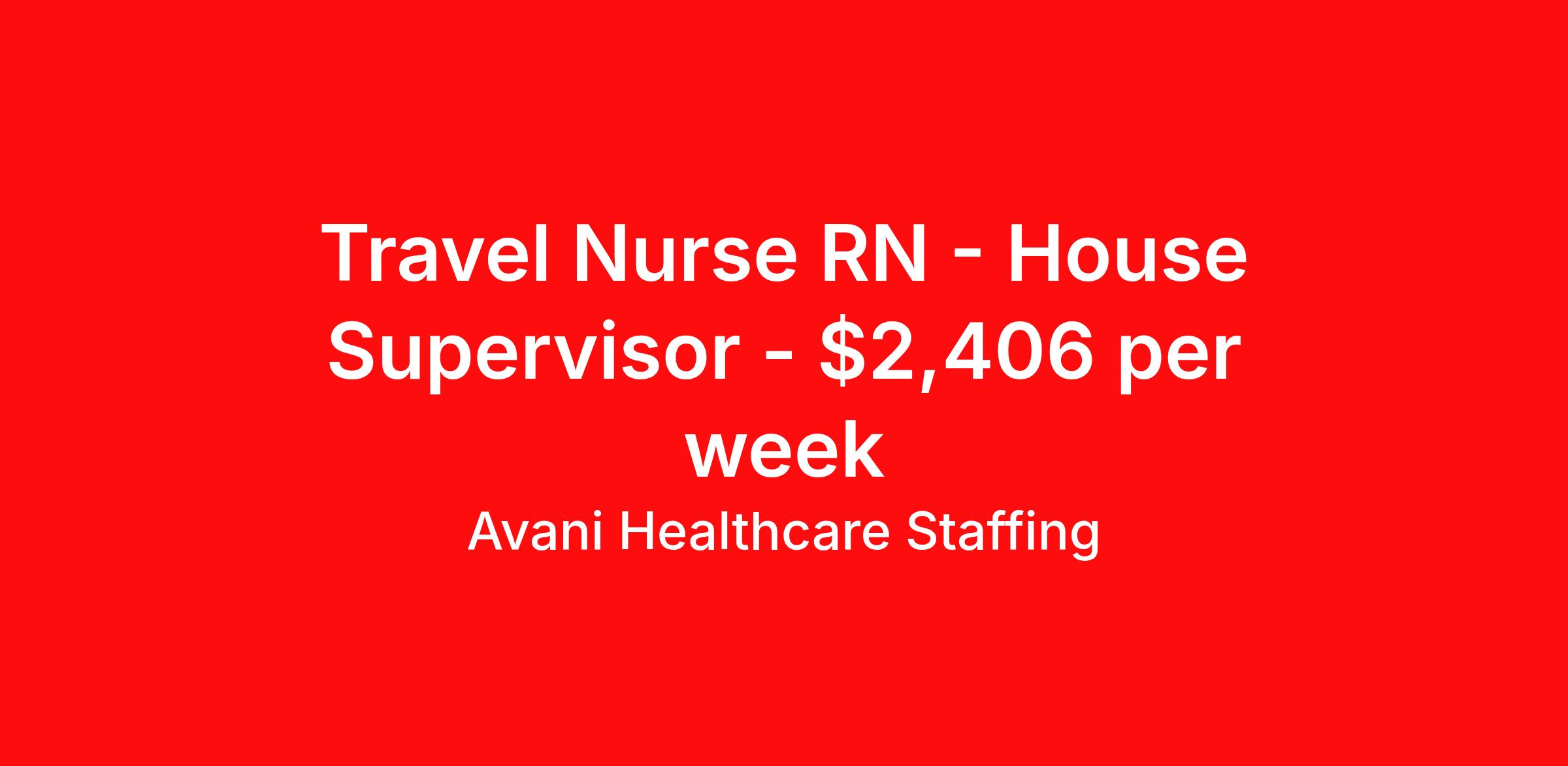 Avani Healthcare Staffing is seeking a travel nurse RN House Supervisor for a travel nursing job in Waterloo, New York. Job Description & Requirements Specialty: House Supervisor Discipline: RN Start Date: 03/28/2026 Duration: 12 weeks 40 hours per week Shift: 8 hours, evenings Employment Type: Travel *Requirements: *NY state license required *Evening shifts/3pm -11:30pm/12 hour shift/5 shifts per week, EOW, Holiday as needed *Minimum 1-year nurse experience in long term care supervisory experience across multiple units *BLS(AHA) required *Benefits: *Group health insurance (Medical, Dental, Vision) ; 401K plan *Requirements: *NY state license required *Evening shifts/3pm -11:30pm/12 hour shift/5 shifts per week, EOW, Holiday as needed *Minimum 1-year nurse experience in long term care supervisory experience across multiple units *BLS(AHA) required *Benefits: *Group health insurance (Medical, Dental, Vision) ; 401K plan About Avani Healthcare Staffing At Avani Healthcare Staffing, You Matter! We find Nursing and/or Allied assignments that allow you to travel to your favorite destinations across the country. We make it our mission to keep the process simple. With years of experience in healthcare staffing, we’re ready to find the perfect assignment and destination for you. Benefits Vision benefits Dental benefits