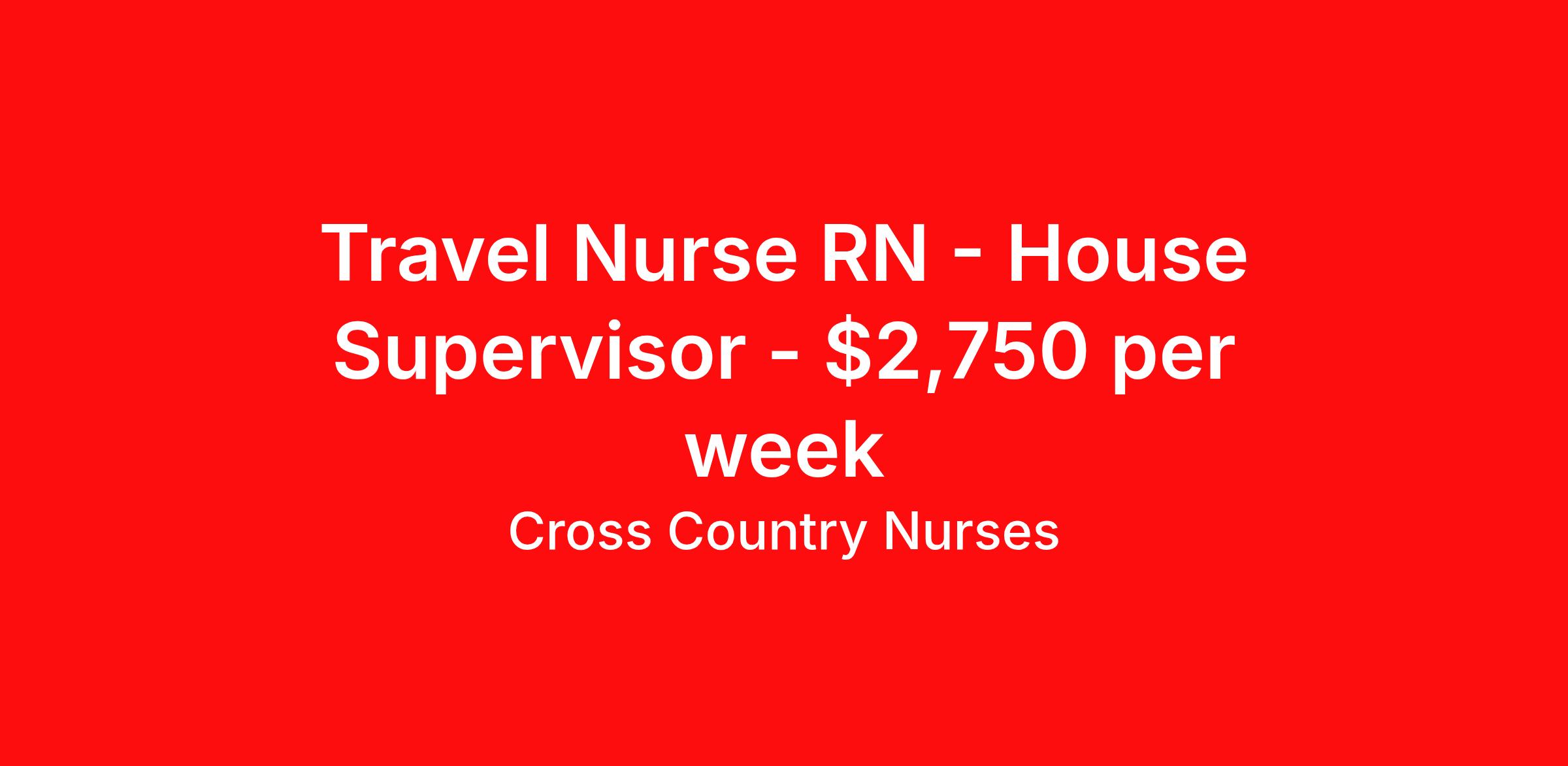 Cross Country Nurses is seeking a travel nurse RN House Supervisor for a travel nursing job in Aberdeen, Washington. Job Description & Requirements Specialty: House Supervisor Discipline: RN Start Date: 04/06/2026 Duration: 13 weeks 36 hours per week Shift: 12 hours, days Employment Type: Travel Job Description As a registered nurse (RN), you will provide care for patients dealing with illness or injury. Depending on your role, you'll work at a hospital, outpatient center, private practice, home health, telemedicine, nursing facility, clinic or other facility. You'll perform tasks like assessing patients, developing care plans, administering medication, providing treatment, assisting with surgery, changing bandages, monitoring vitals and maintaining records. You'll also provide continued support and education to patients, promoting their overall health and ensuring they have the tools to recover and prevent further health issues. Minimum Requirements At least 1 year of recent acute care experience in specialty Active RN license Benefits The benefits of taking a travel nursing job with Cross Country include: Private housing or generous housing allowance Comprehensive health insurance with prescription coverage Dependent health insurance with prescription coverage Competitive salaries Referral bonuses Travel reimbursement 401(k) retirement plan Direct deposit/free checking Unlimited free CE credits Cross Country Job ID 1237201. Pay package is based on 12 hour shifts and 36 hours per week (subject to confirmation) with tax-free stipend amount to be determined. Posted job title: Registered Nurse / House Supervisor Level 1 About Cross Country Nurses You care for others — we’re here to care for you. At Cross Country, we know travel nursing is about more than just the job. It’s about building a career that supports your lifestyle, your values, and your impact. We offer competitive pay, full benefits, and 24/7 support from a team that truly understands what it means to be on the front lines. Wherever your journey takes you, we’re with you every step of the way. Let’s build your best life — one assignment at a time. Benefits 401k retirement plan Referral bonus