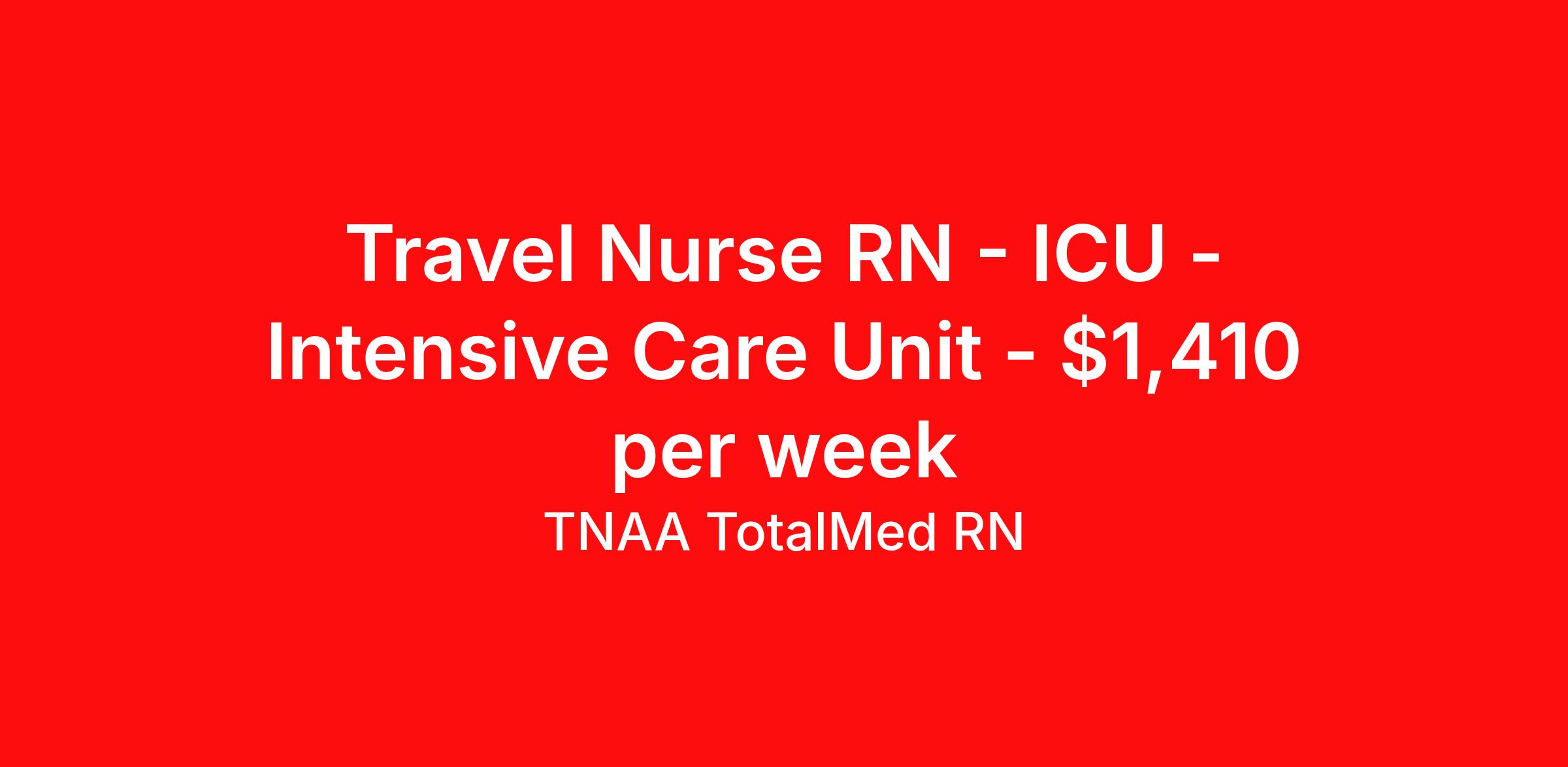 TNAA TotalMed RN is seeking a travel nurse RN ICU - Intensive Care Unit for a travel nursing job in Alexandria, Louisiana. Job Description & Requirements Specialty: ICU - Intensive Care Unit Discipline: RN Duration: 13 weeks 36 hours per week Shift: 12 hours, nights Employment Type: Travel We're looking for Intensive Care Unit RNs for an immediate travel nurse opening in Alexandria, LA. The right nurse should have 1-2 years recent acute care experience. Read below for more requirements. As an ICU Travel Nurse, you'll be responsible for evaluating and monitoring patients in an Intensive Care Unit setting. ICU RNs provide the most direct care to patients in life-threatening situations, documenting and providing physician-directed care, assessing and implementing patient care plans, and delegating to other care providers as appropriate. As an ICU RN you will also be providing education and support to patient families, possibly for long-term care needs. As an ICU Travel Nurse, you should be prepared to perform the following tasks: Provide basic bedside care. Prepare, administer and record prescribed medication, reporting any adverse reactions to treatment. Order and evaluate diagnostic tests. Take samples for lab work, order corresponding lab work and interpret reports. Monitor and adjust specialized equipment, and interpret and record electronic displays. Ensure proper placement and functioning of catheters, leads and tubing. Communicate patients' conditions to family members. ICU Travel Nurses should be able to stand and walk for long periods of time, as well as bend, lean and stoop without difficulty. RNs should be able to easily lift 20 pounds. Moving or lifting of patients may require lifting of up to 50 pounds at times. RNs may face hazards from exposure to certain chemicals or infectious diseases and will treat patients that may be confused, agitated, and/or uncooperative. Requirements*: ACLS, BLS, NIH, 1 Year * Additional certifications may be required before beginning an assignment. TotalMed Travel Job ID 1384319. Pay package is based on 12 hour shifts and 36 hours per week (subject to confirmation) with tax-free stipend amount to be determined. Posted job title: Intensive Care Unit - ICU RN - Travel Nurse About TNAA TotalMed RN TotalMed is a Top Ten, travel nursing and healthcare staffing agency with the mission of igniting purpose in healthcare. The organization staffs nurses, therapists, pharmacists, and other clinicians of all specialties in all 50 states. They offer local and travel jobs and match caregivers with the right organization to assist both facilities and patients. As an organization, they focus on putting highly-skilled staff into facilities to ensure adequate staffing for a better patient experience. TotalMed specializes in recruiting and placing healthcare professionals in travel, PRN, and permanent positions across the country in Nursing and Allied Health. Throughout 2020, the organization filled roles at even the most short-staffed facilities during the most challenging time in healthcare. By matching the right travel healthcare professional with the right organization, TotalMed continues to offer a lifeline to facilities and their patients. Benefits Weekly pay Guaranteed Hours Continuing Education 401k retirement plan Sick pay Wellness and fitness programs Referral bonus Employee assistance programs Medical benefits Dental benefits Vision benefits Benefits start day 1