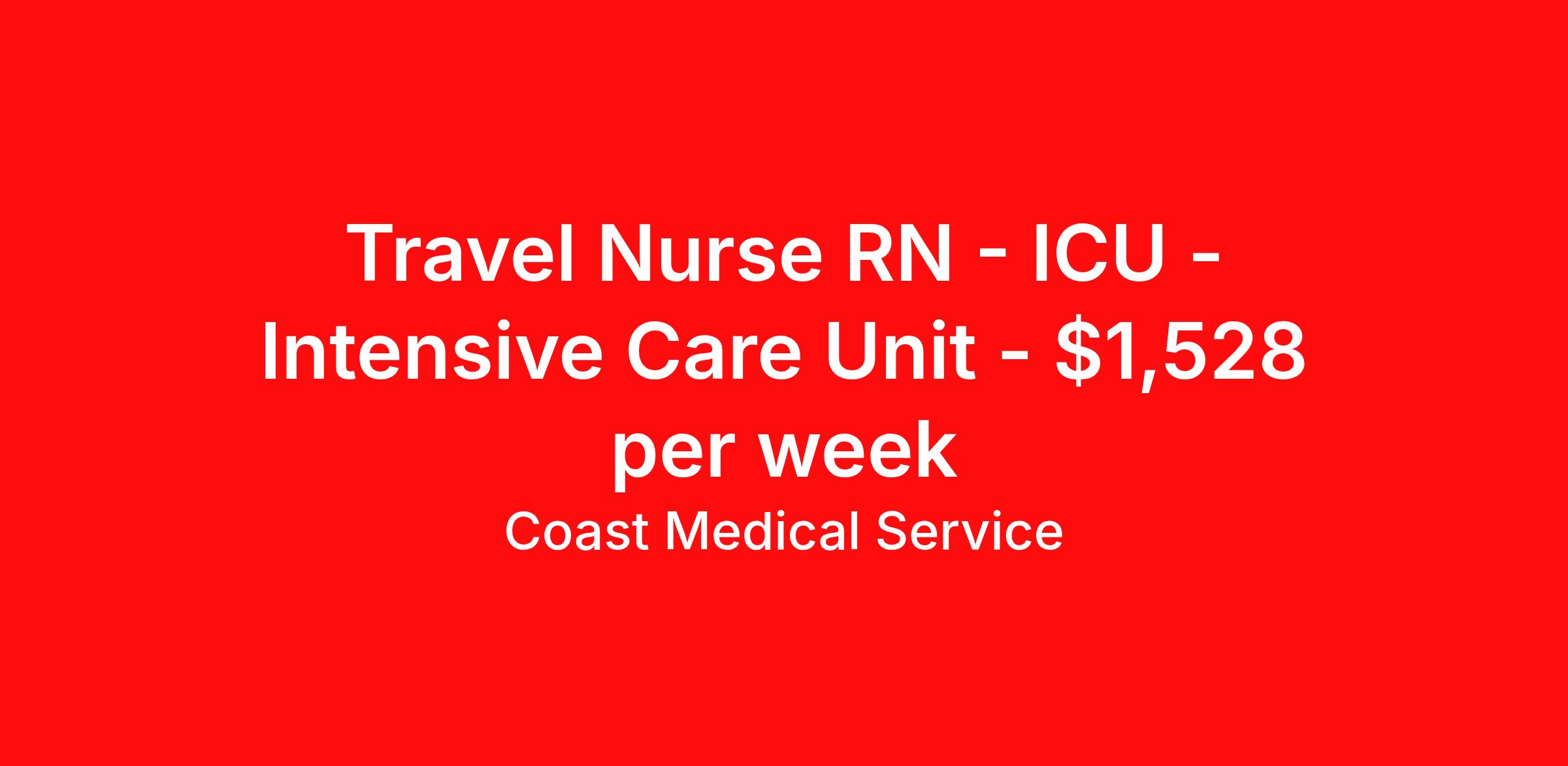 Coast Medical Service is seeking a travel nurse RN ICU - Intensive Care Unit for a travel nursing job in Marietta, Georgia. Job Description & Requirements Specialty: ICU - Intensive Care Unit Discipline: RN Start Date: ASAP Duration: 8 weeks 36 hours per week Shift: 12 hours, nights Employment Type: Travel Coast Medical Service is a nationwide travel nursing & allied healthcare staffing agency dedicated to providing an elite traveler experience for the experienced or first-time traveler. Coast is featured on Blue Pipes' 2023 Best Travel Agencies and named a 2022 Top Rated Healthcare Staffing Firm & 2023 First Half Top Rated Healthcare Staffing Firm by Great Recruiters. Please note that pay rate may differ for locally based candidates. Please apply here or contact a recruiter directly to learn more about this position & the facility, and/or explore others that may be of interest to you. We look forward to speaking with you! Coast Medical Services Job ID 35361757. Pay package is based on 12 hour shifts and 36.0 hours per week (subject to confirmation) with tax-free stipend amount to be determined. Posted job title: RN:Intensive Care Unit (ICU),19:00:00-07:30:00