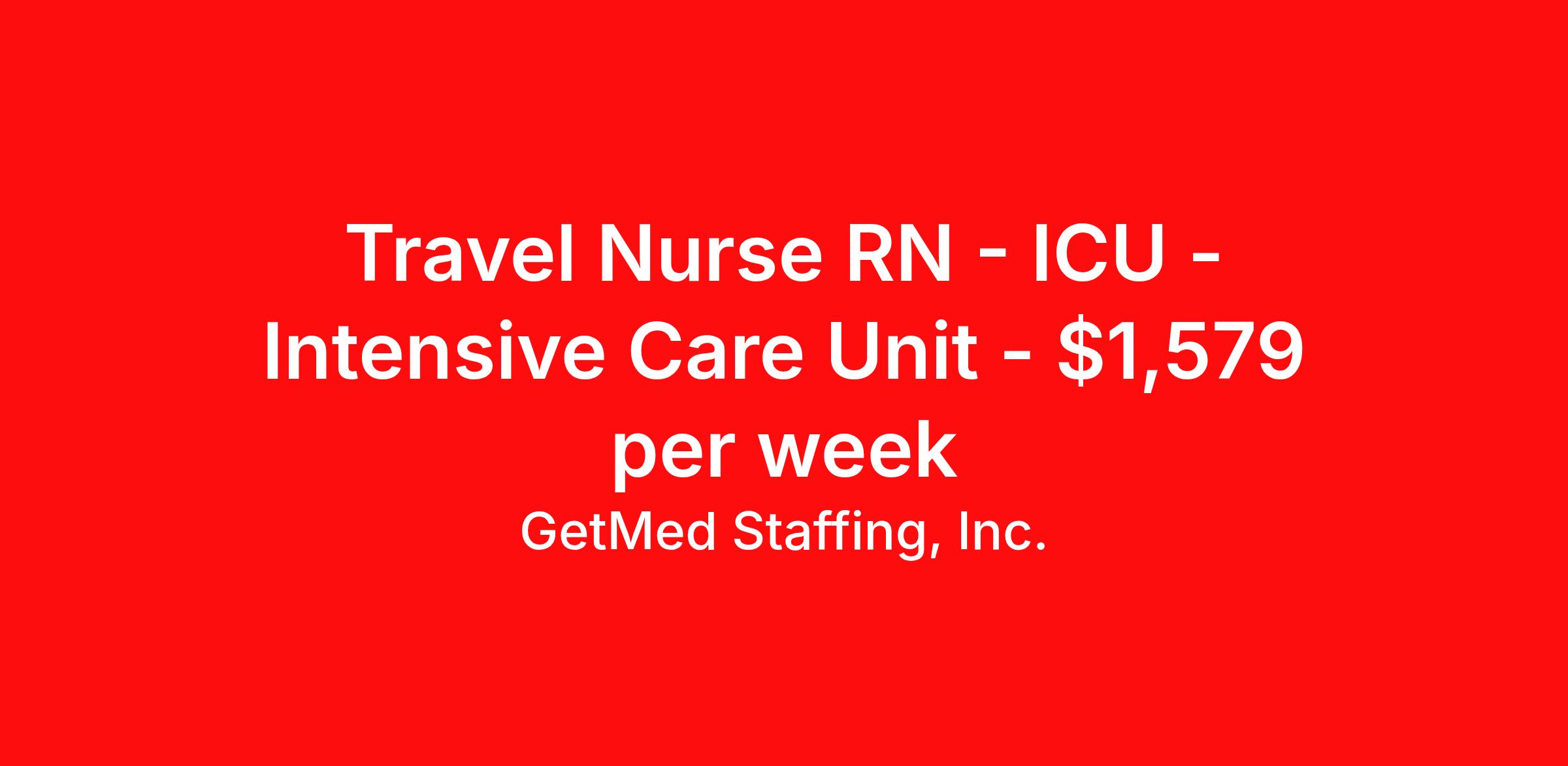 GetMed Staffing, Inc. is seeking a travel nurse RN ICU - Intensive Care Unit for a travel nursing job in Lagrange, Georgia. Job Description & Requirements Specialty: ICU - Intensive Care Unit Discipline: RN Start Date: 03/30/2026 Duration: 13 weeks 36 hours per week Shift: 12 hours, nights Employment Type: Travel GetMed Staffing is searching for a strong ICU RN to assist our traveler-friendly client. A minimum of 1-2 years of experience is required. Traveling with GetMed Staffing offers the unique opportunity to gain diverse experiences, both personally and professionally. Gain experience that matters. GetMed Staffing, Inc. Job ID 35937412. Pay package is based on 12 hour shifts and 36.0 hours per week (subject to confirmation) with tax-free stipend amount to be determined. Posted job title: RN:ICU,19:00:00-07:00:00 About GetMed Staffing, Inc. We are a diversity owned company, specializing in healthcare recruiting services. We truly understand how important a healthcare travelers' relationship is with their recruiter, as well as our relationship is with our healthcare facilities. We recognize that the needs of our healthcare travelers can vary, and therefore we provide the personalized touch necessary to ensure a successful travel assignment each and every time. Our healthcare facilities and clients benefit from us putting our healthcare travelers first. GetMed Staffing is excited to be a leader within the industry by focusing on providing healthcare travelers with more choices and possibilities as they plan for their next healthcare travel assignment. Benefits Life insurance Medical benefits Dental benefits Vision benefits 401k retirement plan