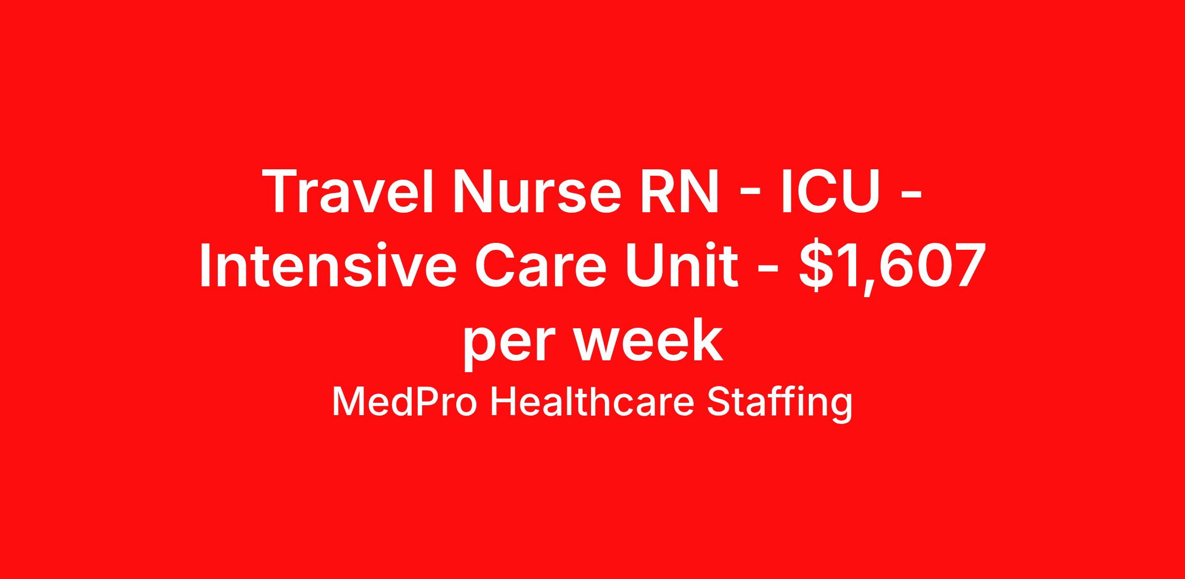 MedPro Healthcare Staffing is seeking a travel nurse RN ICU - Intensive Care Unit for a travel nursing job in Alexandria, Louisiana. Job Description & Requirements Specialty: ICU - Intensive Care Unit Discipline: RN Start Date: 04/06/2026 Duration: 13 weeks 36 hours per week Shift: 12 hours, nights Employment Type: Travel MedPro Healthcare Staffing , a Joint Commission-certified staffing agency, is seeking a quality ICU/CCU Registered Nurse for a travel assignment with one of our top healthcare clients. Requirements Active RN License Degree from accredited nursing program BLS & ACLS Certification Eighteen months of recent experience in an Acute Care ICU setting Other requirements to be determined by our client facility Benefits Weekly pay and direct deposit Full coverage of all credentialing fees Private housing or housing allowance Group Health insurance for you and your family Company-paid life and disability insurance Travel reimbursement 401(k) matching Unlimited Referral Bonuses up to $1,000 Duties Responsibilities ICU/Critical Care Nurse (RN) possesses the skills needed to manage the care of adult patients experiencing life-threatening problems requiring complex assessment, high intensity therapies, and interventions. Provide patient care as well as education and support to the patient's family. Ensure proper functioning of life support equipment such as ventilators and feeding tubes. Observe the patient's heart rate, blood pressure and respiration for signs of distress. Administer medication, IVs, and insert catheters as needed. Meticulous documentation of medication administration. Assist in emergency nursing procedures necessary for prompt control of changes in patient’s physical condition. Perform cardiopulmonary resuscitation accurately and effectively. About Agency MedPro Healthcare Staffing is a Joint Commission certified provider of contract staffing services. Since 1983, we have placed nursing and allied travelers in top healthcare facilities nationwide. Join us today for your very own MedPro Experience®. If qualified and interested, please call for immediate consideration. MedPro Staffing is an Equal Opportunity Employer. All applicants will be considered for employment without attention to race, color, religion, national origin, age, sex, disability, marital status or veteran status. Key Words: Intensive Care Unit, Nurse, Registered Nurse, RN-ICU, Critical Care Unit, Critical Care Nurse, Intensive Care Nurse, RN-CCU, Travel Nurse, Agency Nurse, Contract Nurse, Travel Contract, ACLS, EKG, RN, Registered Nurse, ICU, CCU, RN-ICU, RN-CCU, MICU, SICU, Advanced Life Support, CPR, BLS, Travel Nursing *Weekly payment estimates are intended for informational purposes only and include a gross estimate of hourly wages and reimbursements for meal, incidental, and housing expenses. Your recruiter will confirm your eligibility and provide additional details. MedPro Job ID a0Fcx00000GapKXEAZ. Pay package is based on 12 hour shifts and 36 hours per week (subject to confirmation) with tax-free stipend amount to be determined. Posted job title: ICU/CCU Registered Nurse Nursing: ICU - Intensive Care. About MedPro Healthcare Staffing At MedPro Healthcare Staffing , we believe no one cares more for caregivers than we do. Our mission is simple: you focus on your patients, and we’ll take care of the rest. As a Joint Commission-certified leader in temporary and contract healthcare staffing since 1983, MedPro has proudly connected nursing and allied travelers with top healthcare facilities across the nation. With thousands of job opportunities available nationwide, we make it easy to find assignments that align with your goals and lifestyle. Our on-staff clinical support team—alongside a compassionate group of experienced recruiters—provides hands-on guidance every step of the way. From Day 1 medical benefits and a 401(k) plan to personalized career support, we’re committed to ensuring every professional we serve feels valued, cared for, and empowered to succeed. Guided by a CEO who is a Registered Nurse, MedPro is built on a foundation of clinical insight and genuine compassion for the caregiving community. Through The MedPro Experience® , we deliver travel assignments that are rewarding, memorable, and designed to help you DREAM big, EXPLORE often, and ACHIEVE greatness. Benefits Day 1 medical, dental, and vision benefits for you and your family Weekly pay and direct deposit Unlimited Referral Bonuses starting at $500 On Staff Clinical Support Team Access to nationwide travel assignments MPX Mobile app -24/7 real-time access to jobs, credentials, assignment details, and more Full coverage of all credentialing fees Private housing or housing allowance Tax Free Per Diems, Housing Stipends and Travel Reimbursements Company-paid life and disability insurance Travel reimbursement 401(k) matching Benefits Weekly pay Referral bonus Employee assistance programs