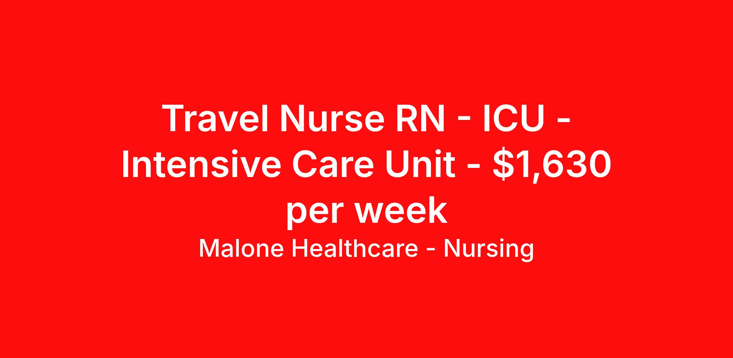 Malone Healthcare - Nursing is seeking a travel nurse RN ICU - Intensive Care Unit for a travel nursing job in Oregon, Ohio. Job Description & Requirements Specialty: ICU - Intensive Care Unit Discipline: RN Start Date: 03/24/2026 Duration: 13 weeks 36 hours per week Shift: 12 hours, nights Employment Type: Travel About Malone Healthcare - Nursing With a commitment to providing a higher standard of service and experience in patient care, Malone Healthcare places expert nurses and allied health professionals in rewarding careers throughout the United States. As a leading healthcare staffing agency, Malone’s focus on compliance and integrity translates to a seamless experience for our team members and partner facilities. When you work with Malone Healthcare, you can rely on over 50 years of proven experience placing exceptional professionals in quality healthcare settings. Benefits Weekly pay Holiday Pay Guaranteed Hours Continuing Education 401k retirement plan Pet insurance Referral bonus Medical benefits Dental benefits Vision benefits License and certification reimbursement Life insurance