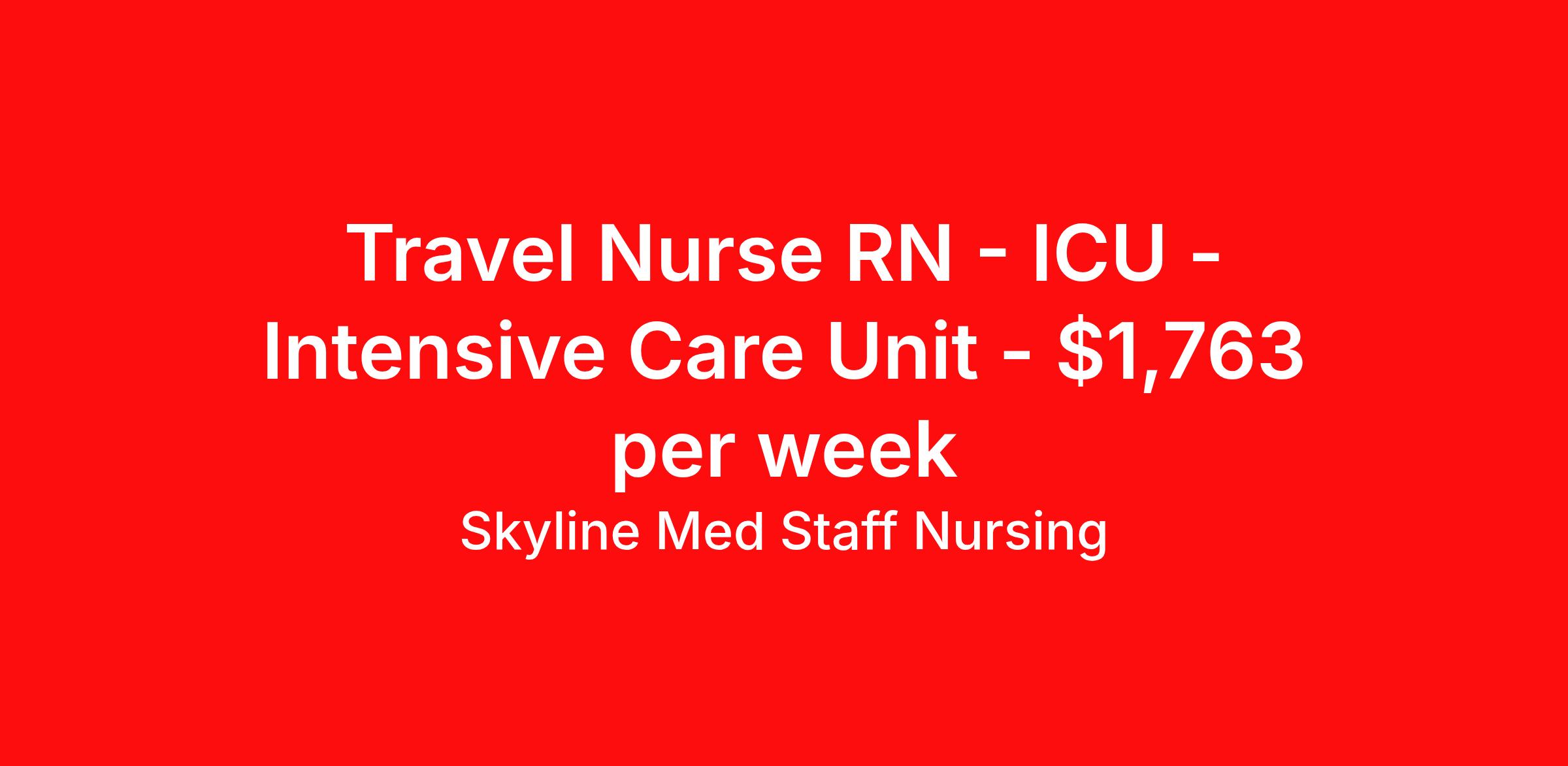 Skyline Med Staff Nursing is seeking a travel nurse RN ICU - Intensive Care Unit for a travel nursing job in Simi Valley, California. Job Description & Requirements Specialty: ICU - Intensive Care Unit Discipline: RN Start Date: 04/06/2026 Duration: 6 weeks 36 hours per week Shift: 12 hours, nights Employment Type: Travel Weekly amount stated in job postings is an estimate based on estimated hourly wage and potential stipends available for the location of the assignment. Pay package is calculated on bill rate at the time job was posted, but can change or vary without notice. Exact pay packages might vary as this is an estimate. Our recruiter would be happy to build an exact pay package for you for each job. Skyline Med Staff Nursing Job ID 36175994. Pay package is based on 12 hour shifts and 36.0 hours per week (subject to confirmation) with tax-free stipend amount to be determined. Posted job title: RN:ICU,19:00:00-07:00:00 About Skyline Med Staff Nursing Join the Top- Rated Travel Healthcare Team! Skyline Med Staff was named as the 1 Best Travel Healthcare Company in 2025 by BluePipes, a recognition driven by glowing reviews from travel healthcare professionals. Our recruiters are consistently praised on Google for their responsiveness, dedication, accessibility, and industry knowledge. Ready to experience the difference? Apply for a job today and see why healthcare professionals choose Skyline! Certified Women Owned Business We believe that travel is good for the soul. We want to be on your journey with you and find the right job that fits you Skyline Med Staff is committed to one vision treating others the way that THEY want to be treated. The executive team at Skyline Med Staff focuses on a commitment to quality, consistency, and the highest level of service. Our team members continually strive to build long term relationships that center on you and helping you achieve your goals. Some of the Benefits you will receive with Skyline Med Staff: Over 30 years of combined experience in the staffing industry Higher Take-Home Pay Rates Dedicated Personal Recruiter We are available to you 24/7 Health Insurance Plan Options Tax Free Per Diems, Housing Stipends and Travel Reimbursements Joint Commission Certified Contracts in all 50 states Referral and Loyalty Bonuses Benefits Medical benefits Referral bonus