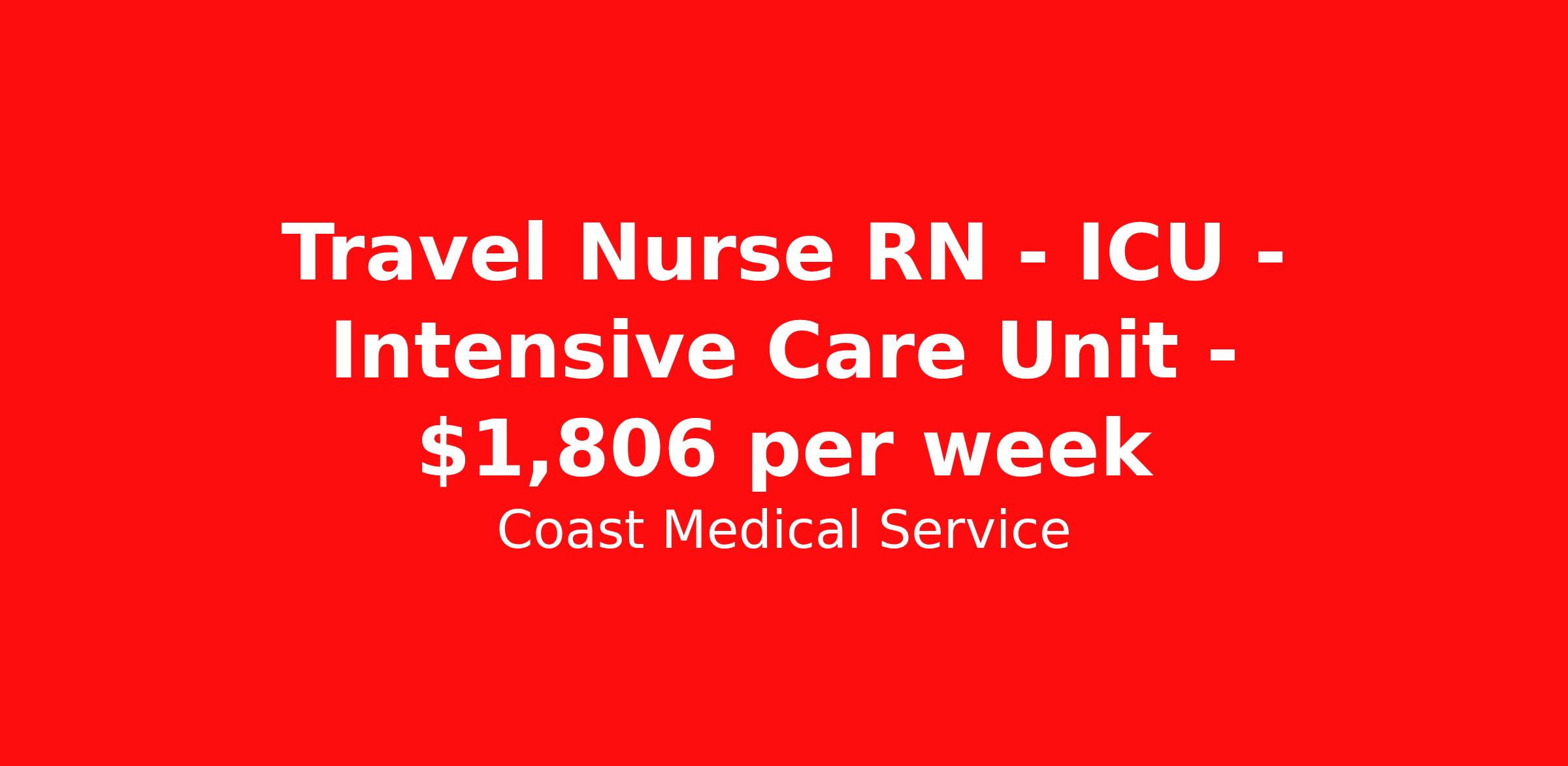 Coast Medical Service is seeking a travel nurse RN ICU - Intensive Care Unit for a travel nursing job in Simi Valley, California. Job Description & Requirements Specialty: ICU - Intensive Care Unit Discipline: RN Start Date: 04/06/2026 Duration: 6 weeks 36 hours per week Shift: 12 hours, nights Employment Type: Travel Coast Medical Service is a nationwide travel nursing & allied healthcare staffing agency dedicated to providing an elite traveler experience for the experienced or first-time traveler. Coast is featured on Blue Pipes' 2023 Best Travel Agencies and named a 2022 Top Rated Healthcare Staffing Firm & 2023 First Half Top Rated Healthcare Staffing Firm by Great Recruiters. Please note that pay rate may differ for locally based candidates. Please apply here or contact a recruiter directly to learn more about this position & the facility, and/or explore others that may be of interest to you. We look forward to speaking with you! Coast Medical Services Job ID 36176338. Pay package is based on 12 hour shifts and 36.0 hours per week (subject to confirmation) with tax-free stipend amount to be determined. Posted job title: RN:Intensive Care Unit (ICU),19:00:00-07:30:00