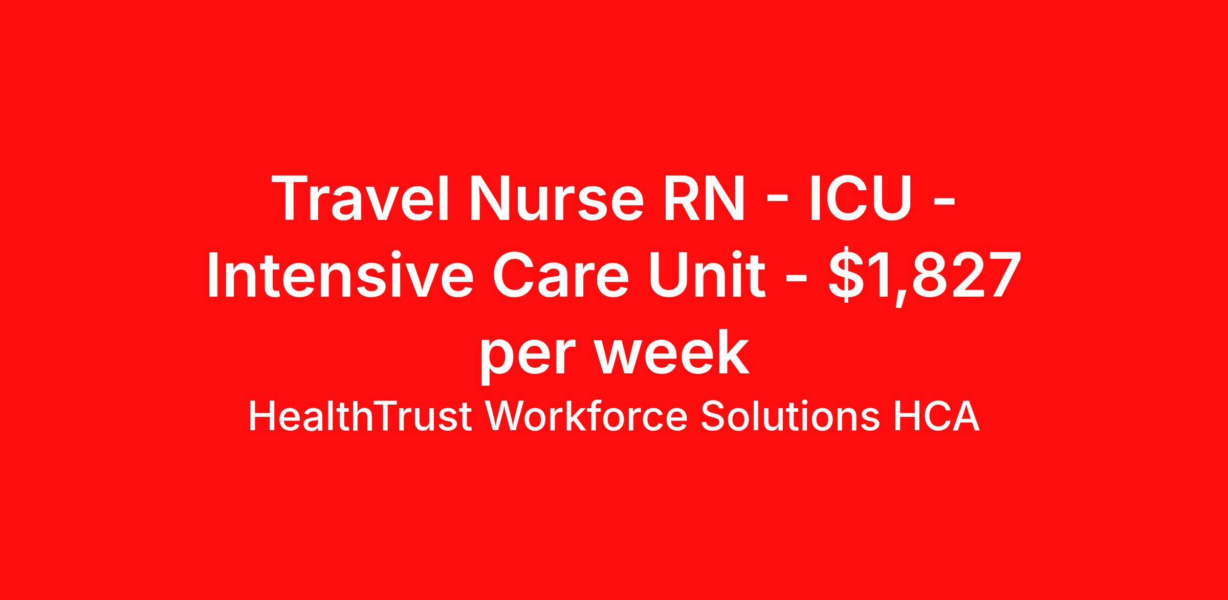 HealthTrust Workforce Solutions HCA is seeking a travel nurse RN ICU - Intensive Care Unit for a travel nursing job in Houston, Texas. Job Description & Requirements Specialty: ICU - Intensive Care Unit Discipline: RN Start Date: 04/13/2026 Duration: 13 weeks 36 hours per week Shift: 12 hours, days, nights Employment Type: Travel About HealthTrust Workforce Solutions HCA At HealthTrust Workforce Solutions, healthcare is not just about the four walls of a facility but about the people who provide and receive care. Our focus is on empowering healthcare professionals to deliver exceptional patient experiences by providing them with the necessary skills, tools, and support. We partner with healthcare facilities nationwide to ensure that the right professionals are in the right roles. We prioritize our clinicians by giving them a voice and access to opportunities to fulfill their mission of improving lives by providing quality patient care. We are committed to our core values of Trust, Innovation, Adaptability, Courage, and Accountability. We are dedicated to positively impacting the healthcare industry by providing first-priority access to more than 200,000 jobs nationwide to our healthcare professionals. Join us and be part of the HealthTrust family, where you can make a difference every day. We embrace our changing environment, and we maintain a culture that has a rich tradition of transforming itself to meet the challenges of the future. MISSION STATEMENT While putting great people in the right roles is essential, our mission is far greater. We want our clinicians to be part of the HealthTrust family, where healthcare professionals have a voice and are empowered with the right tools and opportunities to fulfill their personal mission of improving lives. Plus, as a preferred partner to thousands of top-performing hospitals, we provide our healthcare professionals with first-priority access to more than 200,000 jobs nationwide. Benefits Dental benefits Vision benefits Referral bonus Continuing Education Life insurance