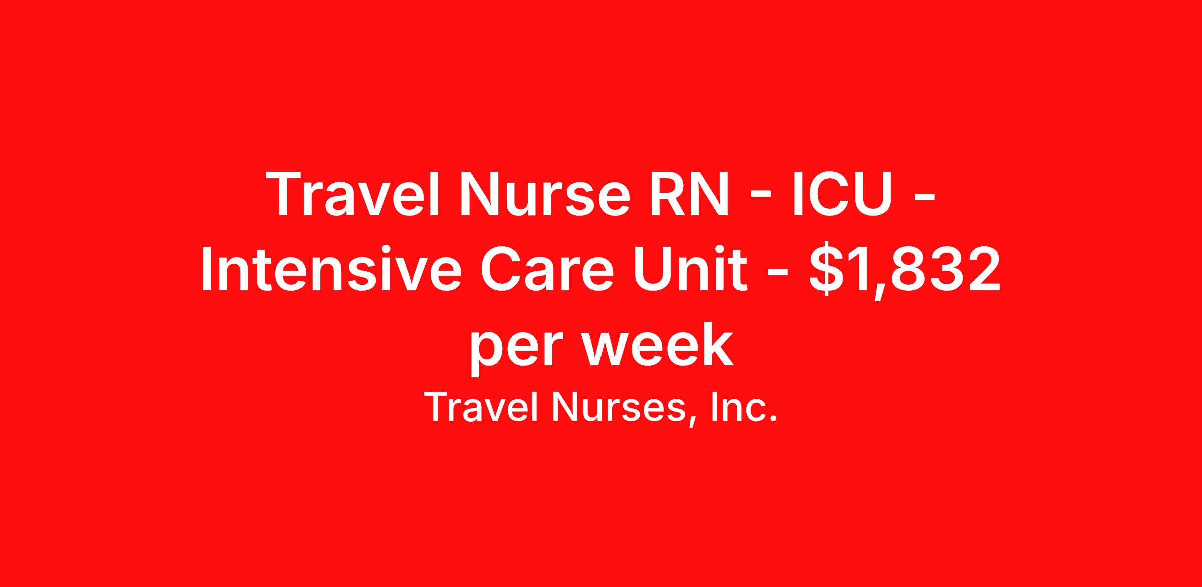 Travel Nurses, Inc. is seeking a travel nurse RN ICU - Intensive Care Unit for a travel nursing job in Point Pleasant, West Virginia. Job Description & Requirements Specialty: ICU - Intensive Care Unit Discipline: RN Start Date: 04/06/2026 Duration: 13 weeks 36 hours per week Shift: 12 hours Employment Type: Travel Travel Nurses, Inc. Job ID 309054. Pay package is based on 12 hour shifts and 36 hours per week (subject to confirmation) with tax-free stipend amount to be determined. Posted job title: ICU Registered Nurse About Travel Nurses, Inc. Travel Nurses, Inc. is a leading healthcare staffing agency that provides healthcare professionals with opportunities to work across the country. Founded by nurses in 1988, TNI has more than 30 years of experience in the industry. The agency initially focused on staffing operating room settings in the MidSouth. However, this quickly evolved to encompass all nursing specialties and allied health fields nationwide. At the heart of our mission is a profound respect for nurses, whom we consider the cornerstone of healthcare. This acknowledgment extends beyond the nursing profession alone. Travel Nurses, Inc. now proudly embraces a wide array of healthcare professionals, recognizing their crucial roles in our collective mission. Travel Nurses, Inc. is dedicated to providing comprehensive support and opportunities that will help facilitate complete career mobility in the healthcare field. Our commitment to transparency ensures that all professionals, not just nurses, can confidently accept any assignment without financial uncertainties. We prioritize our professionals’ well-being with comprehensive benefits packages, including day-one healthcare coverage, competitive salaries, bonuses and incentives. This underscores our unwavering commitment to offering the best possible rewards and support for all the professionals we serve. Benefits Weekly pay Continuing Education 401k retirement plan Wellness and fitness programs Mileage reimbursement Referral bonus Employee assistance programs Medical benefits Dental benefits Vision benefits Benefits start day 1 License and certification reimbursement Life insurance Retention bonus