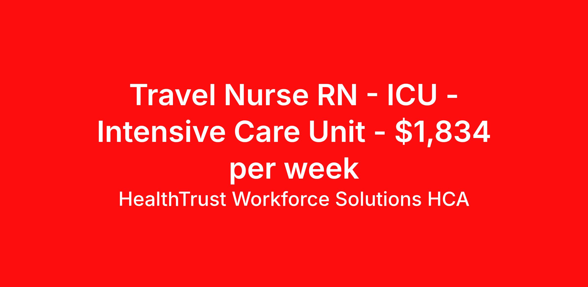 HealthTrust Workforce Solutions HCA is seeking a travel nurse RN ICU - Intensive Care Unit for a travel nursing job in Conroe, Texas. Job Description & Requirements Specialty: ICU - Intensive Care Unit Discipline: RN Duration: 13 weeks 36 hours per week Shift: 12 hours, days Employment Type: Travel About HealthTrust Workforce Solutions HCA At HealthTrust Workforce Solutions, healthcare is not just about the four walls of a facility but about the people who provide and receive care. Our focus is on empowering healthcare professionals to deliver exceptional patient experiences by providing them with the necessary skills, tools, and support. We partner with healthcare facilities nationwide to ensure that the right professionals are in the right roles. We prioritize our clinicians by giving them a voice and access to opportunities to fulfill their mission of improving lives by providing quality patient care. We are committed to our core values of Trust, Innovation, Adaptability, Courage, and Accountability. We are dedicated to positively impacting the healthcare industry by providing first-priority access to more than 200,000 jobs nationwide to our healthcare professionals. Join us and be part of the HealthTrust family, where you can make a difference every day. We embrace our changing environment, and we maintain a culture that has a rich tradition of transforming itself to meet the challenges of the future. MISSION STATEMENT While putting great people in the right roles is essential, our mission is far greater. We want our clinicians to be part of the HealthTrust family, where healthcare professionals have a voice and are empowered with the right tools and opportunities to fulfill their personal mission of improving lives. Plus, as a preferred partner to thousands of top-performing hospitals, we provide our healthcare professionals with first-priority access to more than 200,000 jobs nationwide. Benefits Dental benefits Vision benefits Referral bonus Continuing Education Life insurance