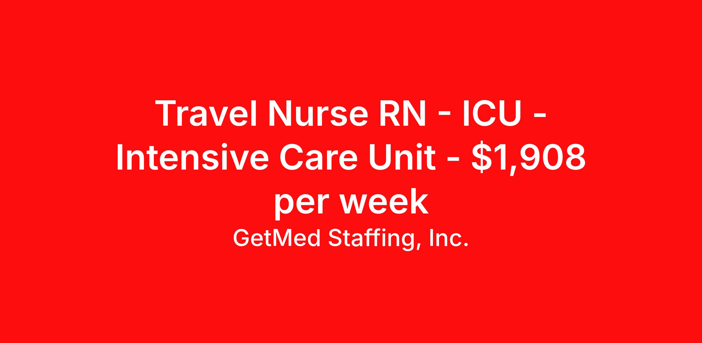GetMed Staffing, Inc. is seeking a travel nurse RN ICU - Intensive Care Unit for a travel nursing job in Gardner, Massachusetts. Job Description & Requirements Specialty: ICU - Intensive Care Unit Discipline: RN Start Date: 04/13/2026 Duration: 13 weeks 36 hours per week Shift: 12 hours, nights Employment Type: Travel GetMed Staffing is searching for a strong ICU RN to assist our traveler-friendly client. A minimum of 1-2 years of experience is required. Traveling with GetMed Staffing offers the unique opportunity to gain diverse experiences, both personally and professionally. Gain experience that matters. GetMed Staffing, Inc. Job ID 36190845. Pay package is based on 12 hour shifts and 36.0 hours per week (subject to confirmation) with tax-free stipend amount to be determined. Posted job title: RN:ICU,19:00:00-07:00:00 About GetMed Staffing, Inc. We are a diversity owned company, specializing in healthcare recruiting services. We truly understand how important a healthcare travelers' relationship is with their recruiter, as well as our relationship is with our healthcare facilities. We recognize that the needs of our healthcare travelers can vary, and therefore we provide the personalized touch necessary to ensure a successful travel assignment each and every time. Our healthcare facilities and clients benefit from us putting our healthcare travelers first. GetMed Staffing is excited to be a leader within the industry by focusing on providing healthcare travelers with more choices and possibilities as they plan for their next healthcare travel assignment. Benefits Life insurance Medical benefits Dental benefits Vision benefits 401k retirement plan